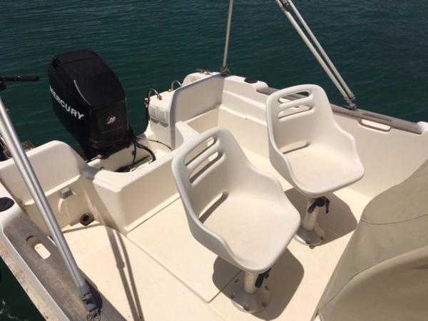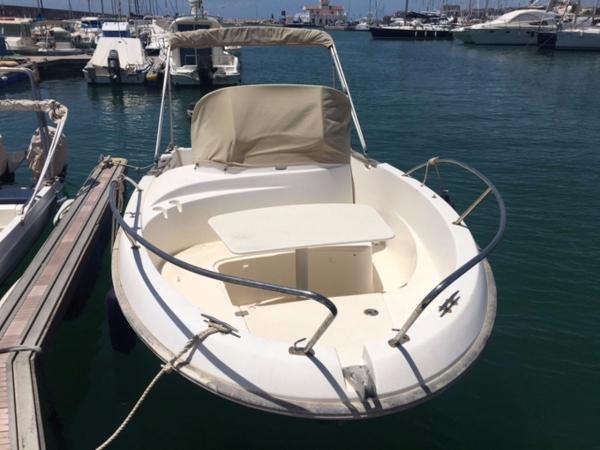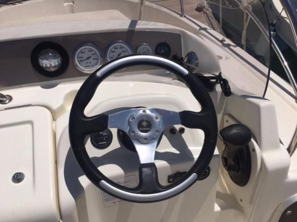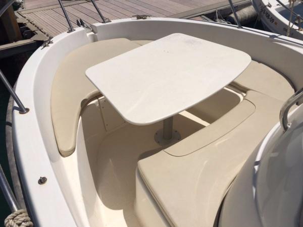 DISTRIBUTION: Boat with open bow convertible into solarium, cabin with chemical Wc. ELECTRONIC : Garmin GPS map 421s. EQUIPMENT: bimini top, 2 batteries, Auxiliary engine Mercury 6 hp, Aft shower, Swimming ladder, rod holders, Bow cushions for sundeck, console cover. DISTRIBUCIÓN : Embarcación con proa abierta convertible en solárium, cabina interior con Wc químico. ELECTRÓNICA : Garmin GPS map 421s. EQUIPO : Toldo bimini, 2 baterías, Motor auxiliar Mercury 6 hp, Ducha en popa, Gatera en proa, Escalera de baño, Cañeros, Cojines en proa para solárium, funda de consola.