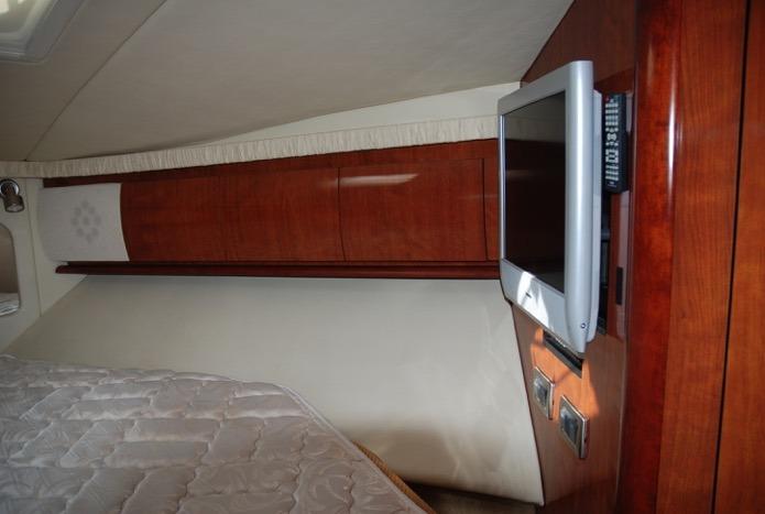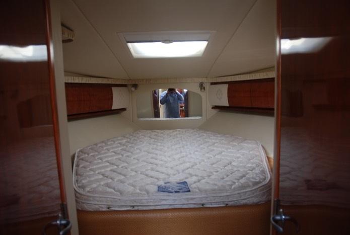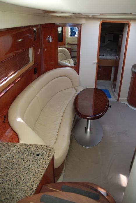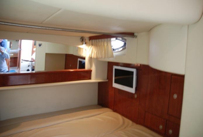 Proa abierta con camarote en estribor. En cubierta, 3 tumbonas en proa y pasillo en babor a bañera. Asiento doble para piloto y copiloto. Mesa en bañera con asiento en U y encimera en estribor. Solárium en popa con respaldo giratorio, mirando a popa o mirando a estribor. Plataforma de baño con escalón hidráulico sumergible. En cabina, asiento en V en proa convertible en cama doble. Compartimento de baño completo en estribor. En la parte central del barco, dos camas individuales.