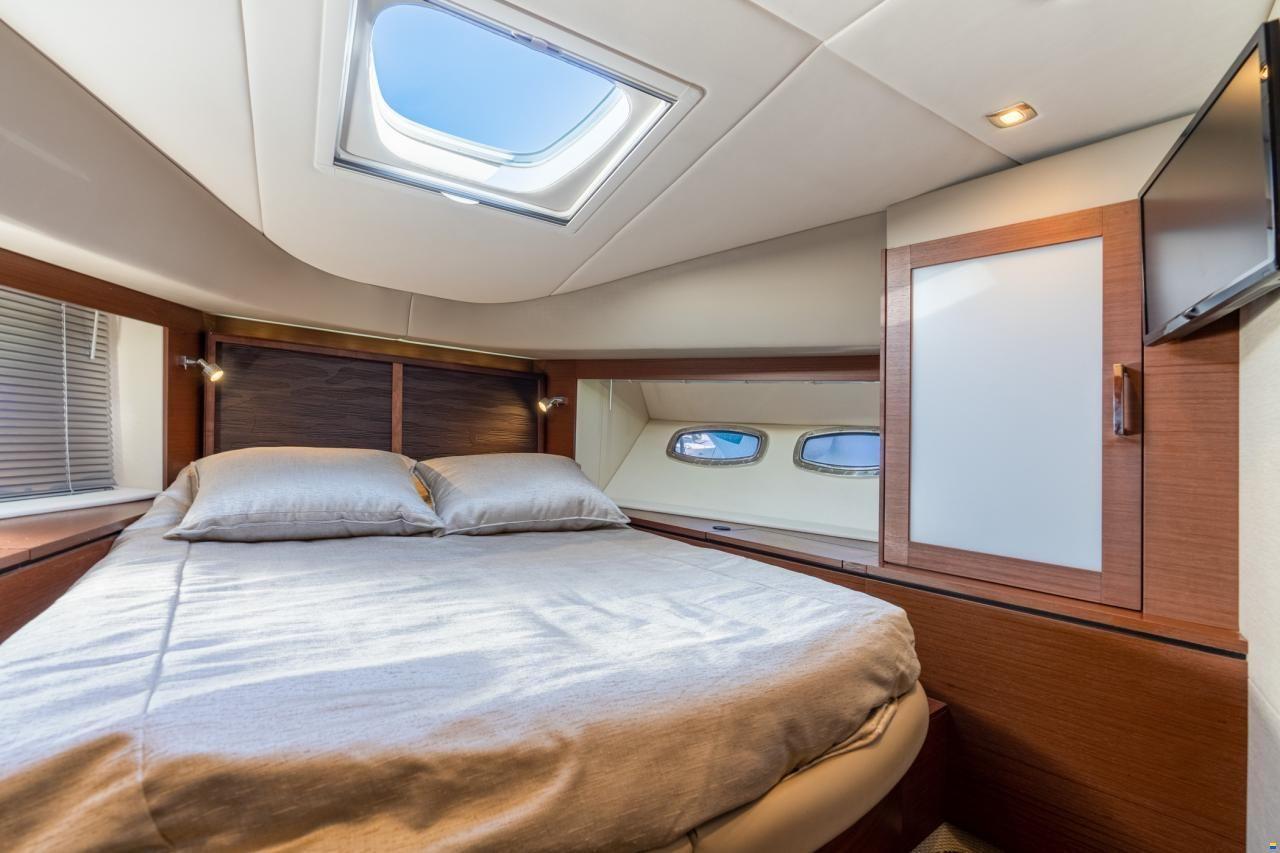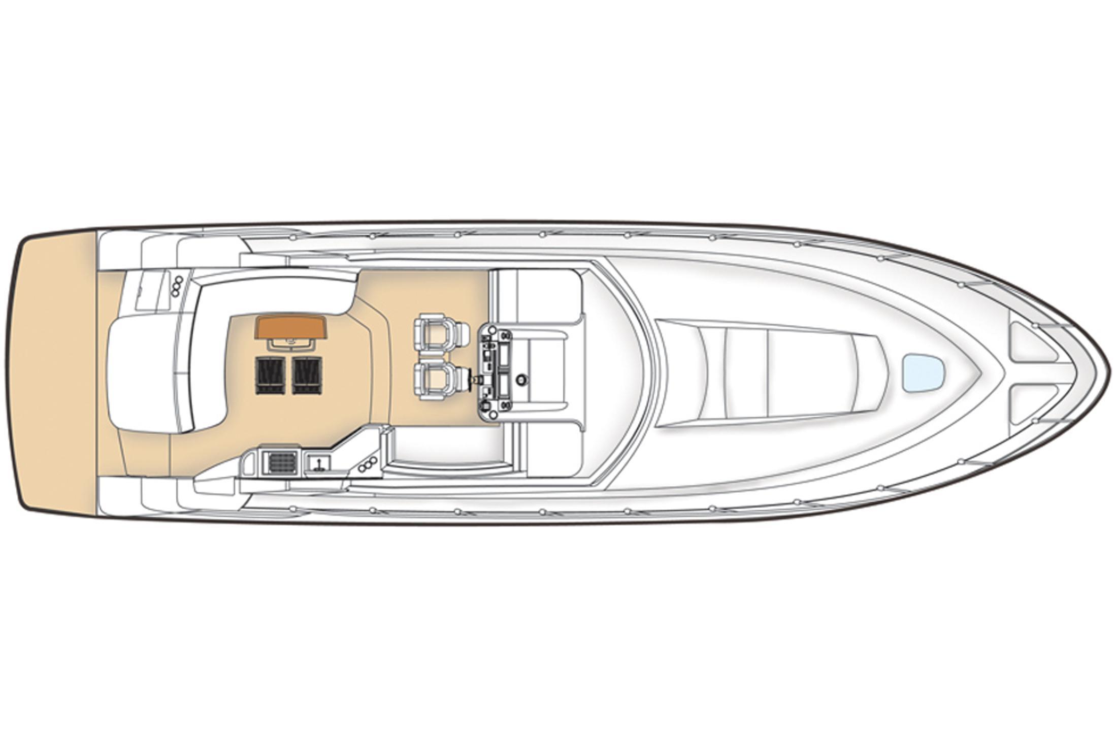 Características Clave: Hardtop de fibra de vidrio con techo solar, Conversión de sofá cama en el salón, Televisor de pantalla plana de 50″ en el salón o 58″ opcional, Generador diésel Onan de 21.5 kw con protección acústica, Pantallas Raymarine® e125 de doble pantalla ancha con radar de alta definición, Propulsión Zeus® opcional con joystick en el timón.
