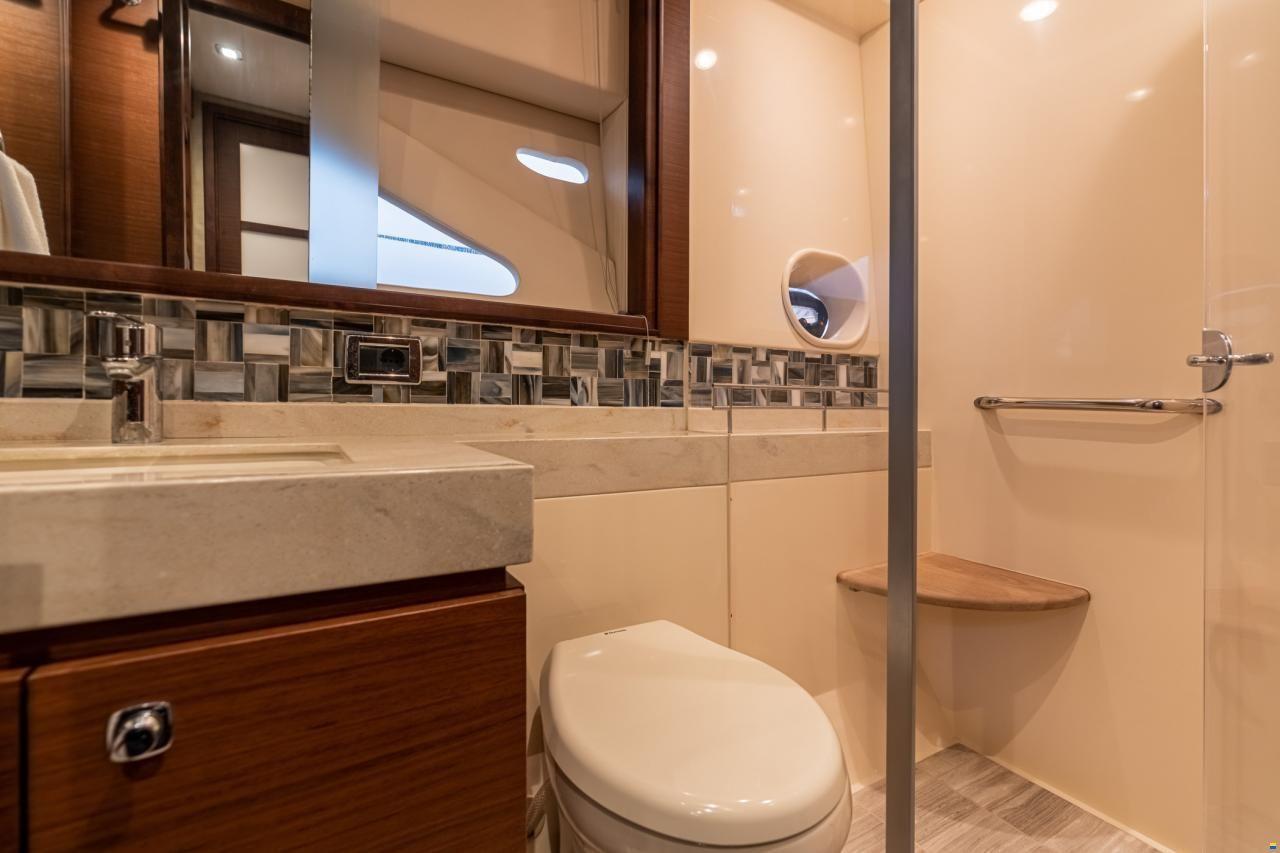 Baño : Accesorios de baño – Anillos para toallas (2), Soporte para papel higiénico, Jabón y Ganchos para albornoces (3), Puerta, Acceso desde el camarote principal, Piso, Azulejo – Ducha y Cabezal, Pasamanos, Acero inoxidable, Armario colgante, Forrado de cedro con almacenamiento en cajones debajo, Inodoro, (VacuFlush®) – Eléctrico, Espejo, Grande, de cuerpo entero, Ventilador de potencia, 24V, Ducha con asiento de teca, Varilla de ducha ajustable y puerta de acrílico, Almacenamiento, Estantes – Dedicados a artículos de tocador, Toallas – Sea Ray, Lavabo con encimera de superficie sólida, Salpicadero de azulejos, Fregadero empotrado con grifo y almacenamiento debajo con receptáculo de basura.