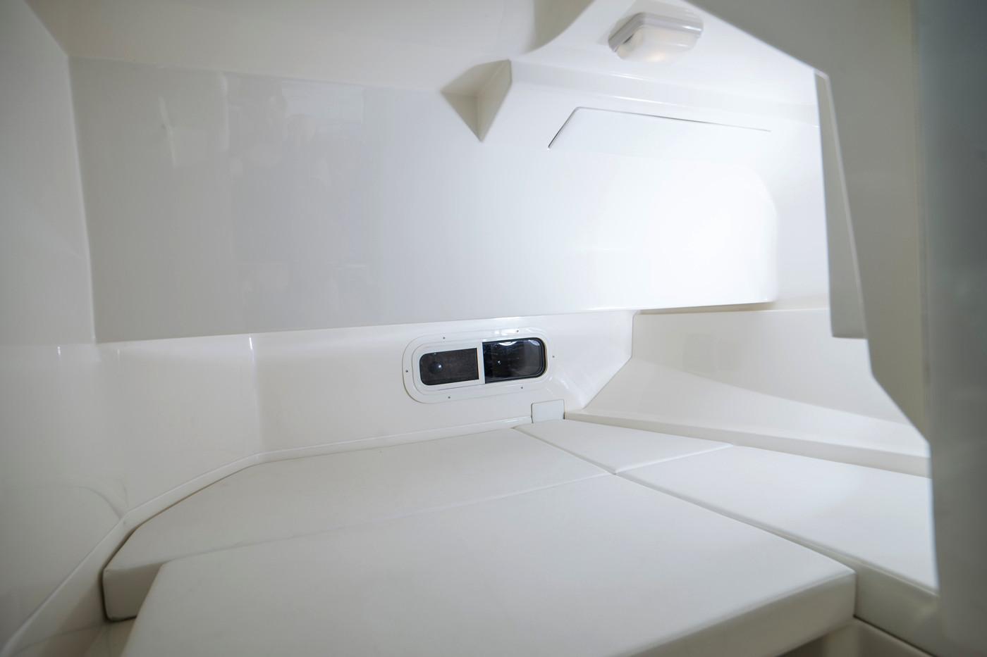 Offenes Bug mit Kabine an Steuerbord. An Deck 3 Sonnenliegen am Bug und Gang an Backbord zum Cockpit. Doppelsitz für Pilot und Co-Pilot. Tisch im Cockpit mit U-förmiger Sitzgruppe und Arbeitsplatte an Steuerbord. Sonnendeck achtern mit drehbarer Rückenlehne, entweder achtern- oder steuerbordseitig ausgerichtet. Badeplattform mit hydraulischer, versenkbarer Stufe. In der Kabine V-Sitzgruppe im Bug, umwandelbar in ein Doppelbett. Komplettes Badezimmerfach an Steuerbord. Im mittleren Teil des Bootes zwei Einzelbetten. Badeplattform und Cockpitboden aus Teakholz.