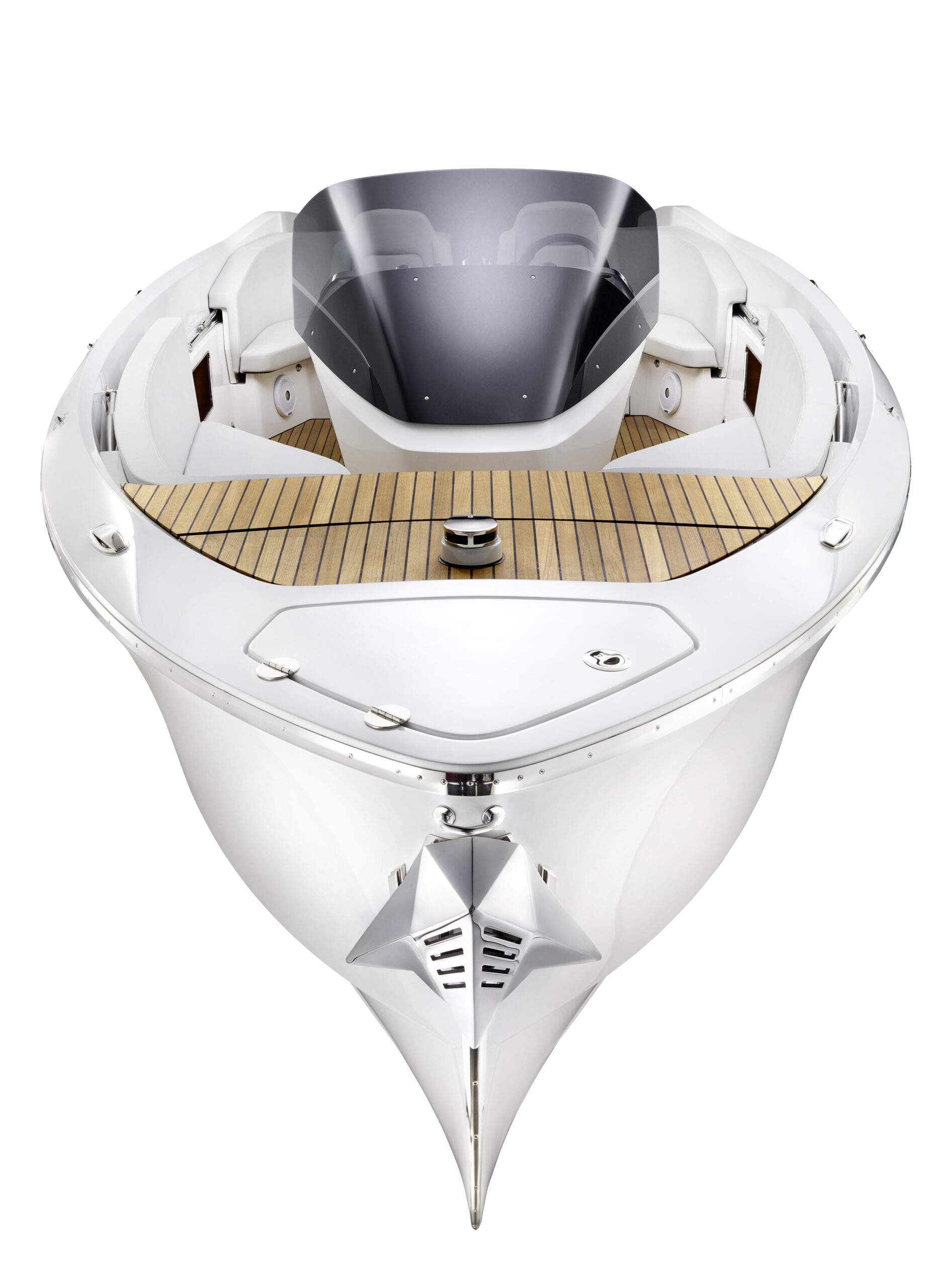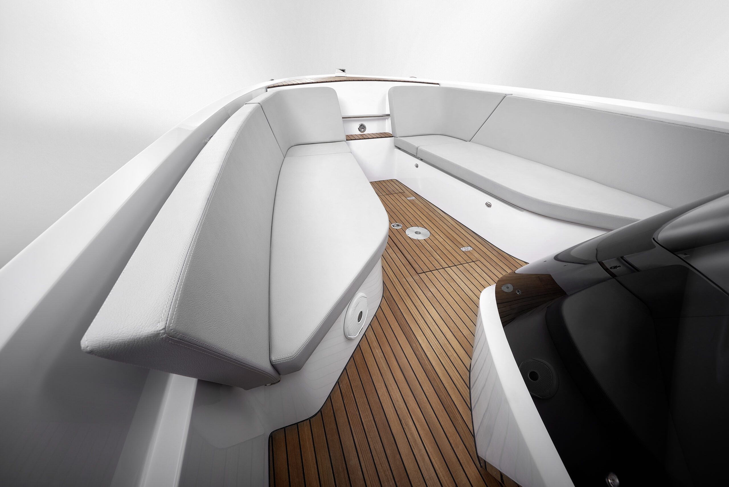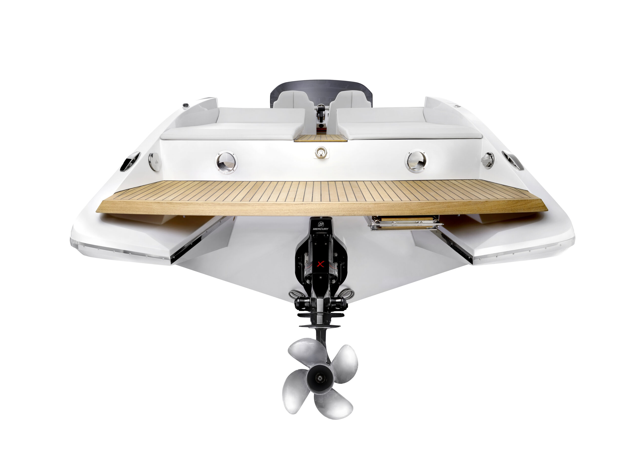 Diese 8,6-Meter-Motoryacht kombiniert das Premium-Design und die erstklassigen Fahreigenschaften des Modells mit geschlossenem Bug, der legendären Frauscher 858 Fantom, mit einer noch geräumigeren Aufteilung und zusätzlichen Details. Die 858 Fantom Air empfängt ihre Gäste mit einer exquisiten Badeplattform aus Teakholz am Heck, die durch eine großzügige und komfortable, gepolsterte Liegefläche für zwei Personen ergänzt wird.