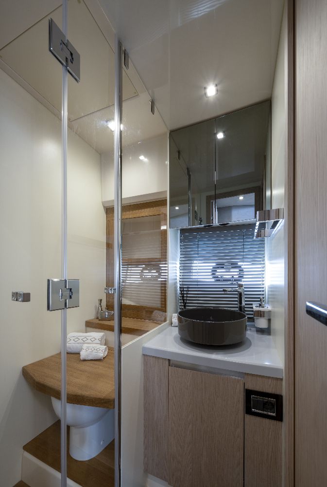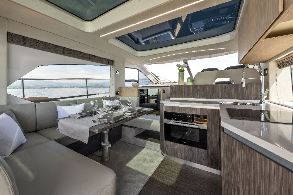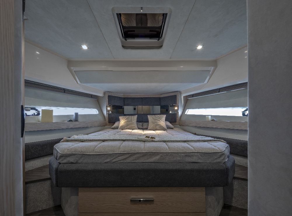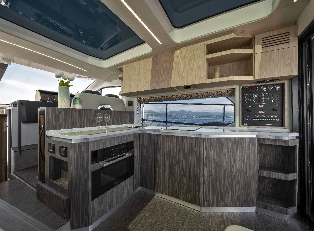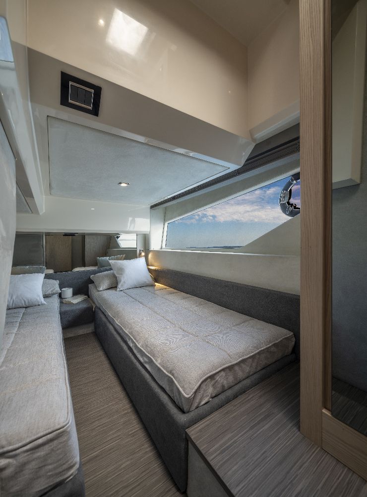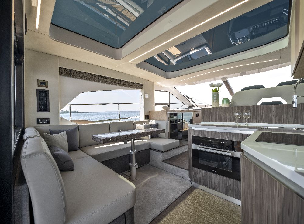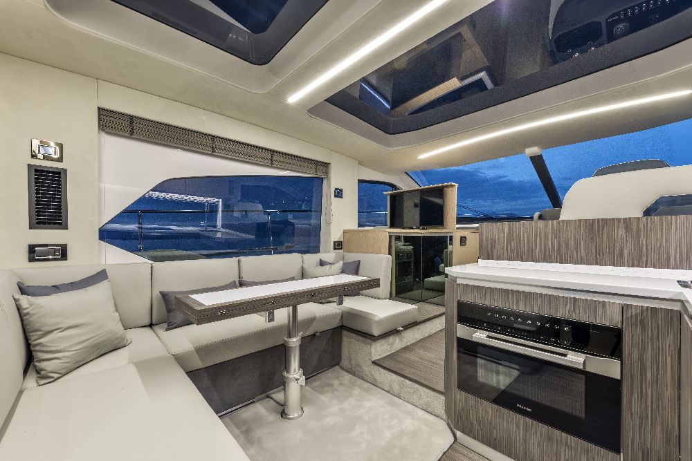 Die interessanten Innenlinien werden von einer dynamischen und sportlichen Ästhetik begleitet: Das neue Hardtop hat organische und geschwungene Linien und integriert sich gut in die Seitenschilde des Decks. Man kann auch die gleichen Stilelemente sehen, die in den letzten Jahren zu einem Symbol der Werft geworden sind, wie die hohe Bordwand und die Leiste, die die Linien an der Seite kombiniert, die bereits auf dem Flaggschiff F68 Gullwing vorgestellt wurde.
