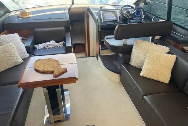 Bugbestuhlung in V-Form mit Füllkissen und Rückenlehne für den Durchgang zum Cockpit. Schalensitz für den Fahrer und eine Liege mit verstellbarer Rückenlehne für den Beifahrer. L-förmige Steuerbordbestuhlung mit Rückenlehne und Füllkissen für den Durchgang. Zugang zur Badeplattform an Backbord. Geräumiges Achter-Solarium mit umwandelbarer Rückenlehne und Badeplattform mit versenkbarer Leiter.