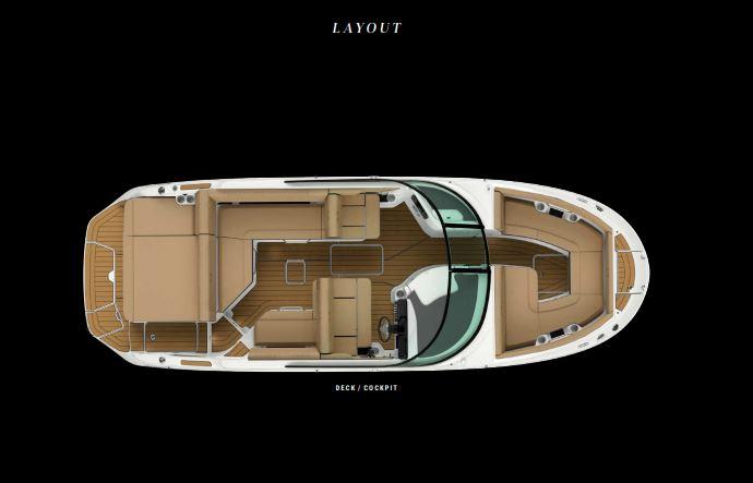 Open bow with starboard cabin. On deck, 3 sunbeds in the bow and port walkway to the cockpit. Double seat for pilot and co-pilot. Cockpit table with U-shaped seat and starboard countertop. Aft sundeck with rotating backrest, facing aft or facing starboard. Bathing platform with submersible hydraulic step. In the cabin, V-seat in the bow convertible into a double bed. Complete bathroom compartment on starboard. In the central part of the boat, two single beds.