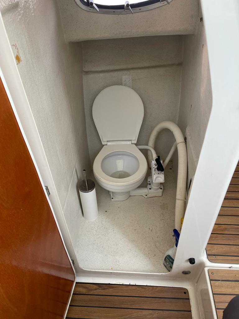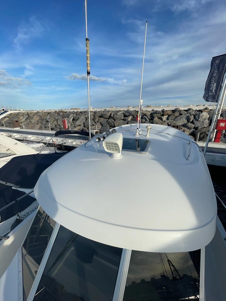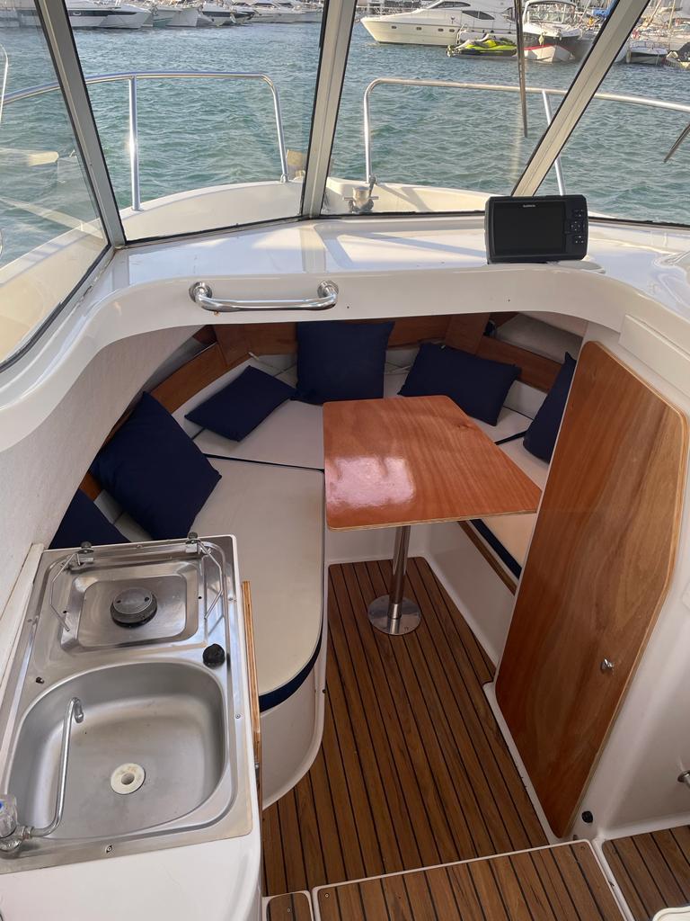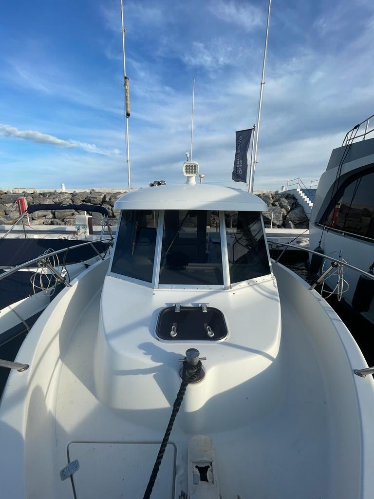 Open bow with starboard cabin. On deck, 3 sunbeds in the bow and port walkway to the cockpit. Double seat for pilot and co-pilot. Cockpit table with U-shaped seat and starboard countertop. Aft sundeck with rotating backrest, facing aft or facing starboard. Bathing platform with submersible hydraulic step. In the cabin, V-seat in the bow convertible into a double bed. Complete bathroom compartment on starboard. In the central part of the boat, two single beds. Swim platform and cockpit with teak flooring.