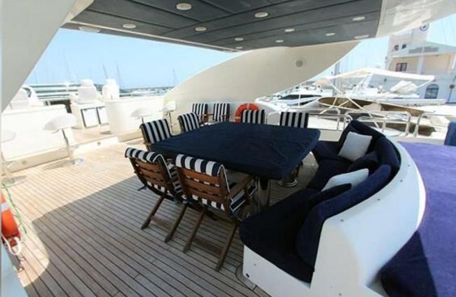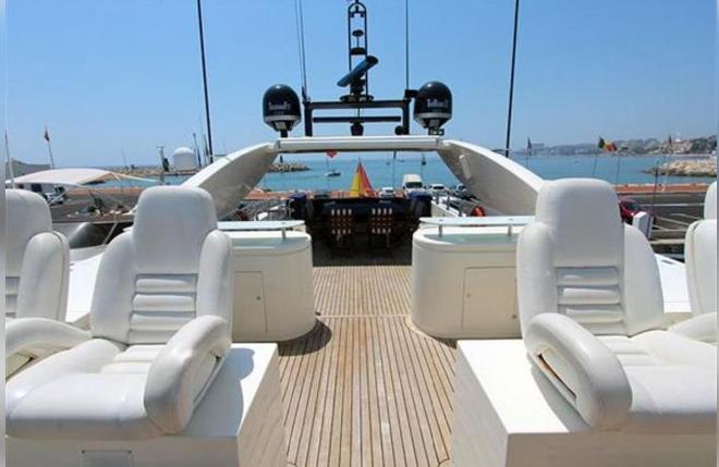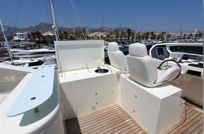 Bow seating in V with filler cushions and backrest for walk-thru to cockpit. Bucket seat for pilot and a lounger with adjustable Backrest for companion. L-shaped starboard seating with backrest and filler cushions for walk-thru. Portside access to swim platform. Spacious aft solarium with convertible backrest and swim platform with concealed ladder.