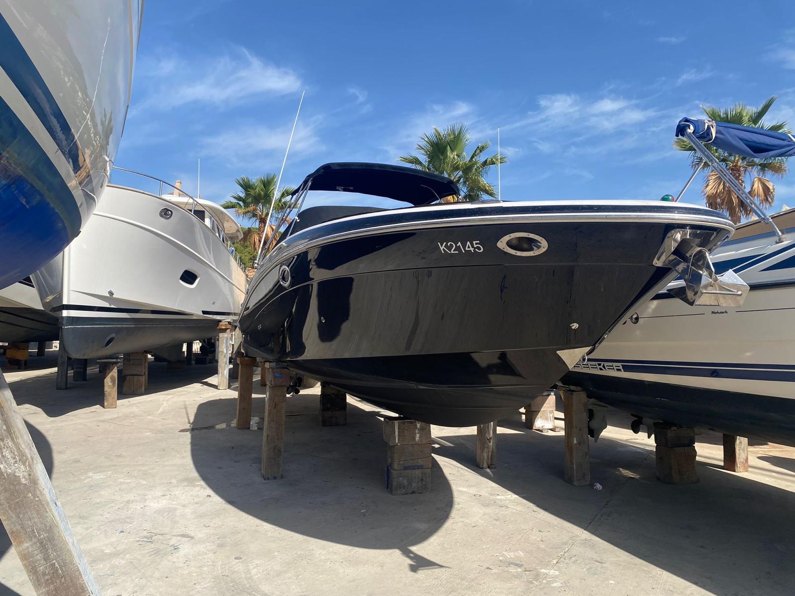 Open bow with two sunbeds in the bow and filler cushions. Head compartment to port. Swivel seat for driver and passenger. L-shaped bench seat in the stern with folding backrest convertible into a sun deck. Wet bar on starboard with sink, tap and compartment underneath. Extended swim platform with ladder. Tower for water sports. >German flag. Requires full engine and outdrive service due to years of inactivity. Original exhaust manifolds, we recommend complete replacement of elbows and manifolds.