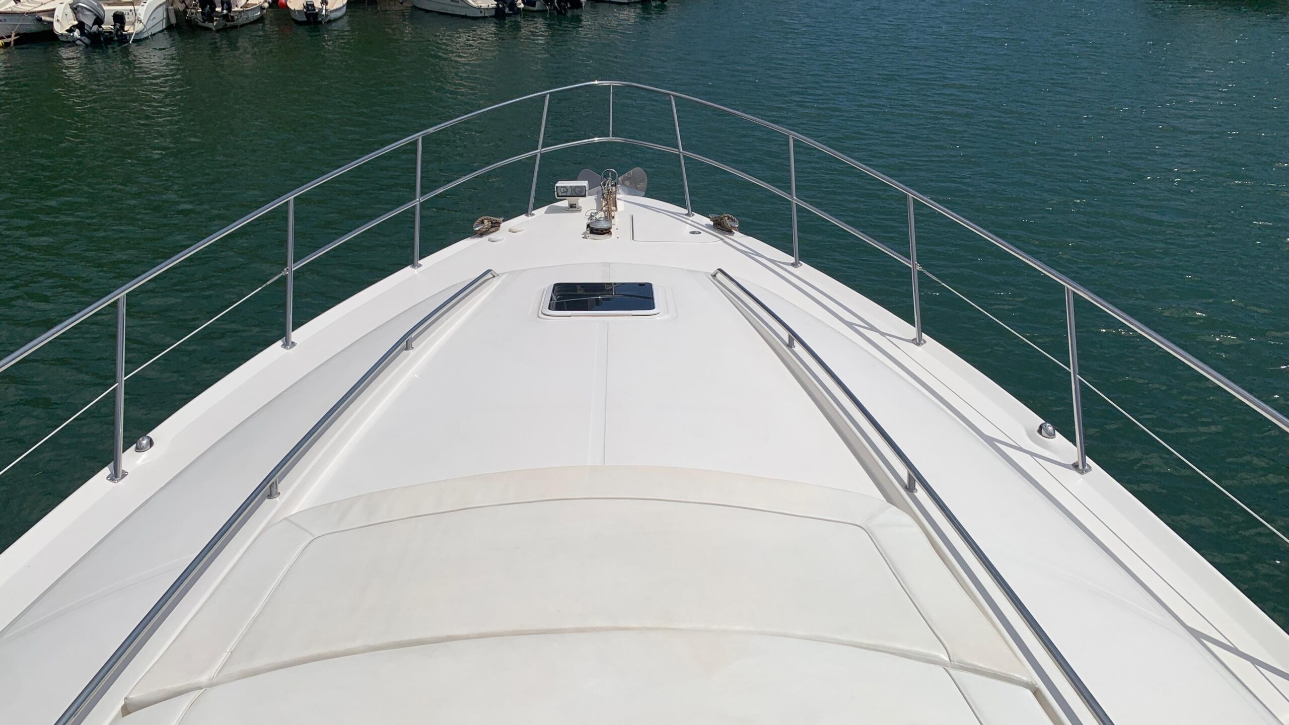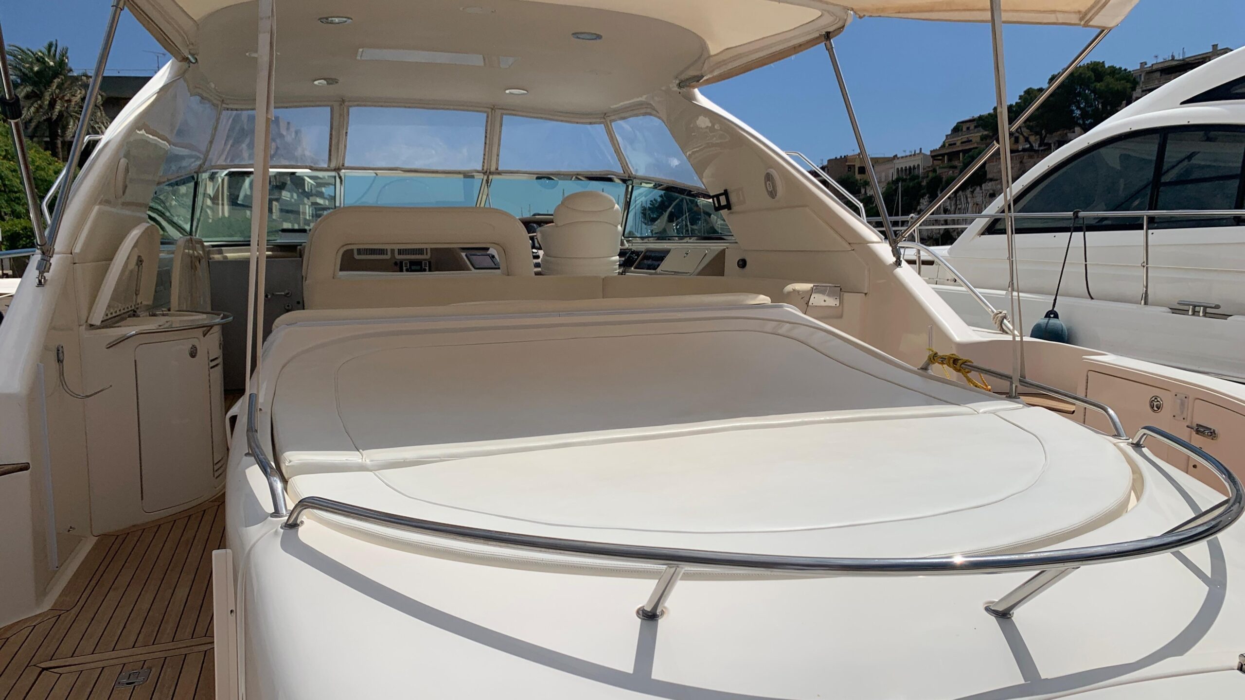 Open bow with 3 sunbeds and access corridor to the cockpit area on port and starboard.