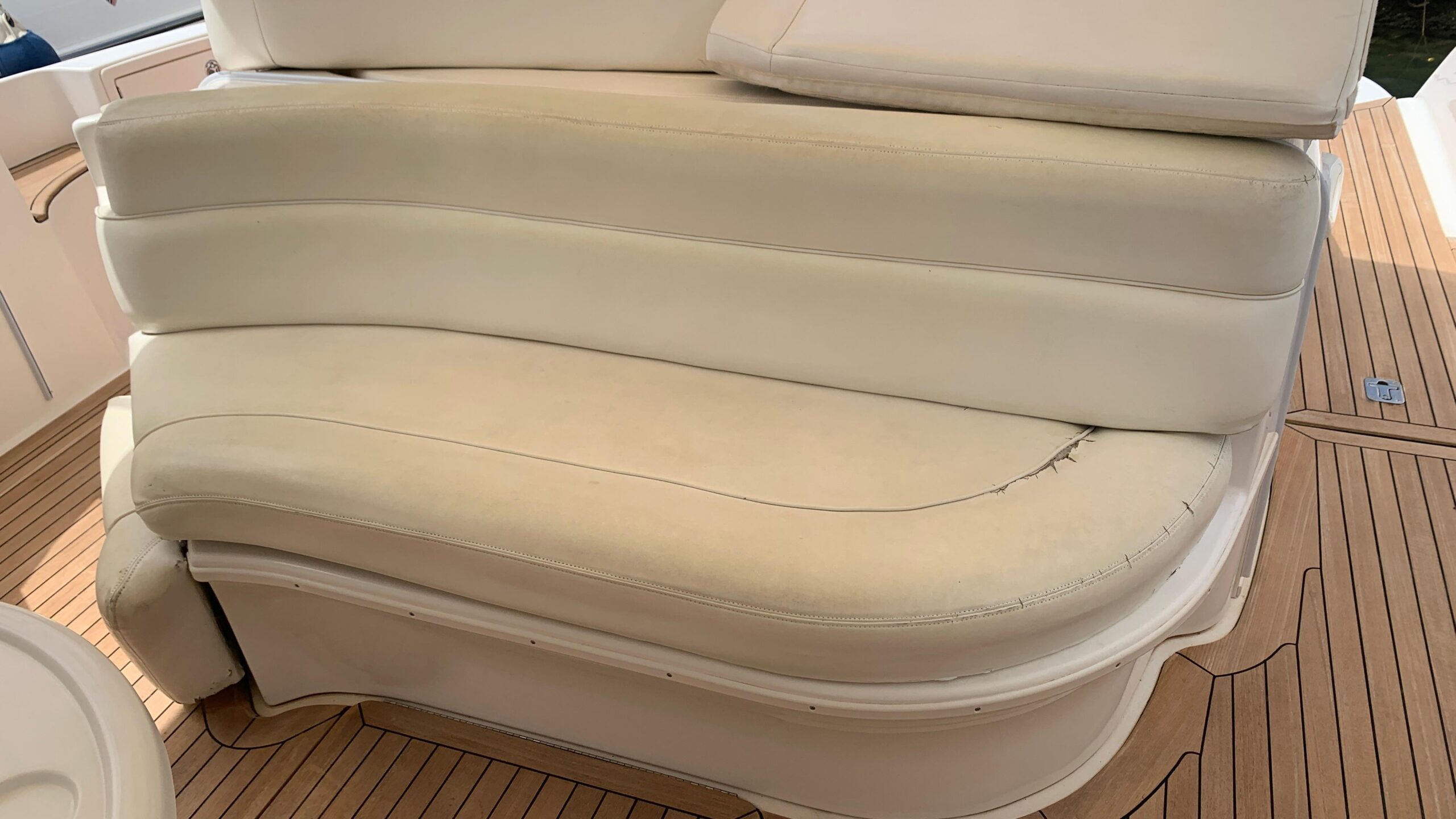 In the living area we find a very spacious L-shaped sofa, a coffee table that can be changed between a smaller circular one (for snacking) and a larger rectangular one (for lunch or setting up a catering). On the opposite side of the table we have another 4-seater sofa to complete the living area. It can be extended with auxiliary side seats. We can access a tap and several storage lockers.