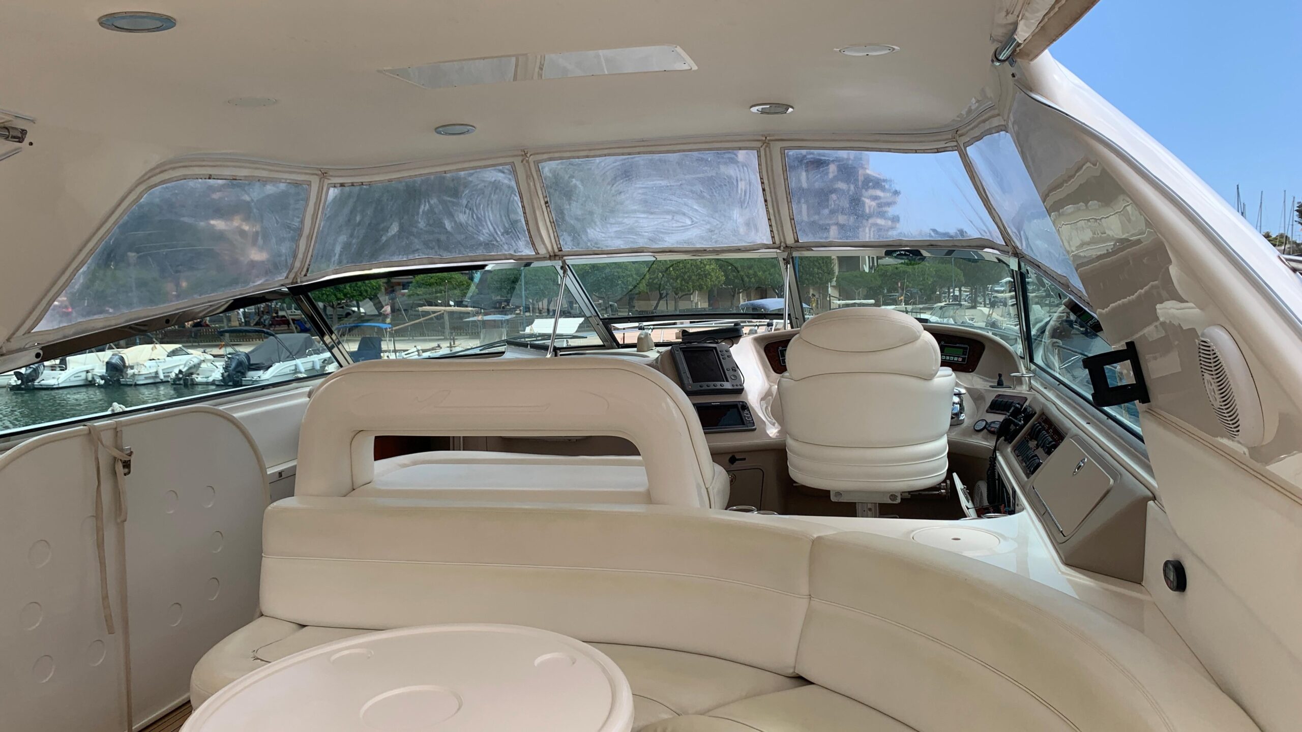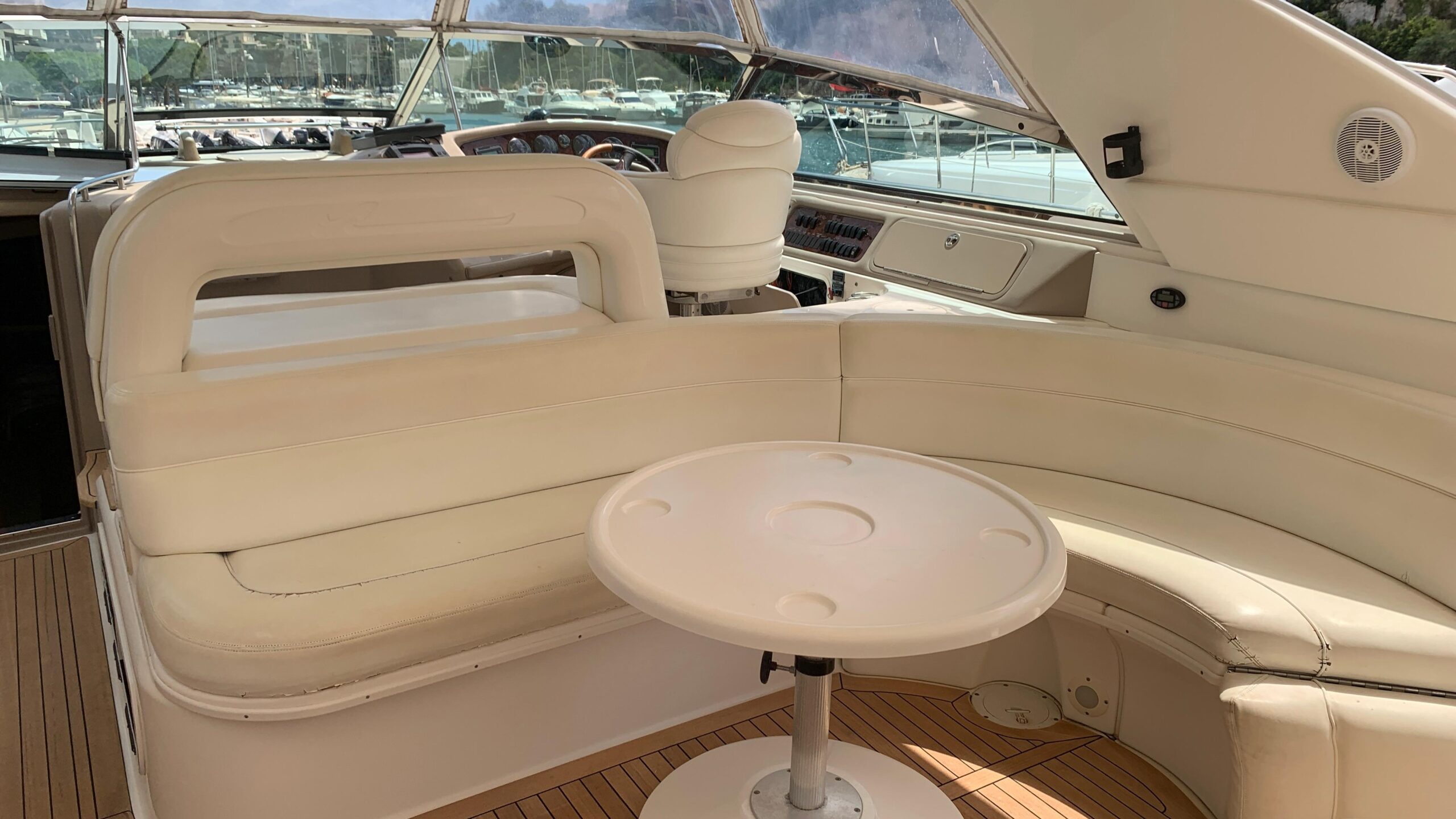 In the cockpit we find the control area with an armchair for the pilot and a sofa for 3 or 4 people in the co-pilot area so that the whole family can enjoy the captain’s views as they sail.