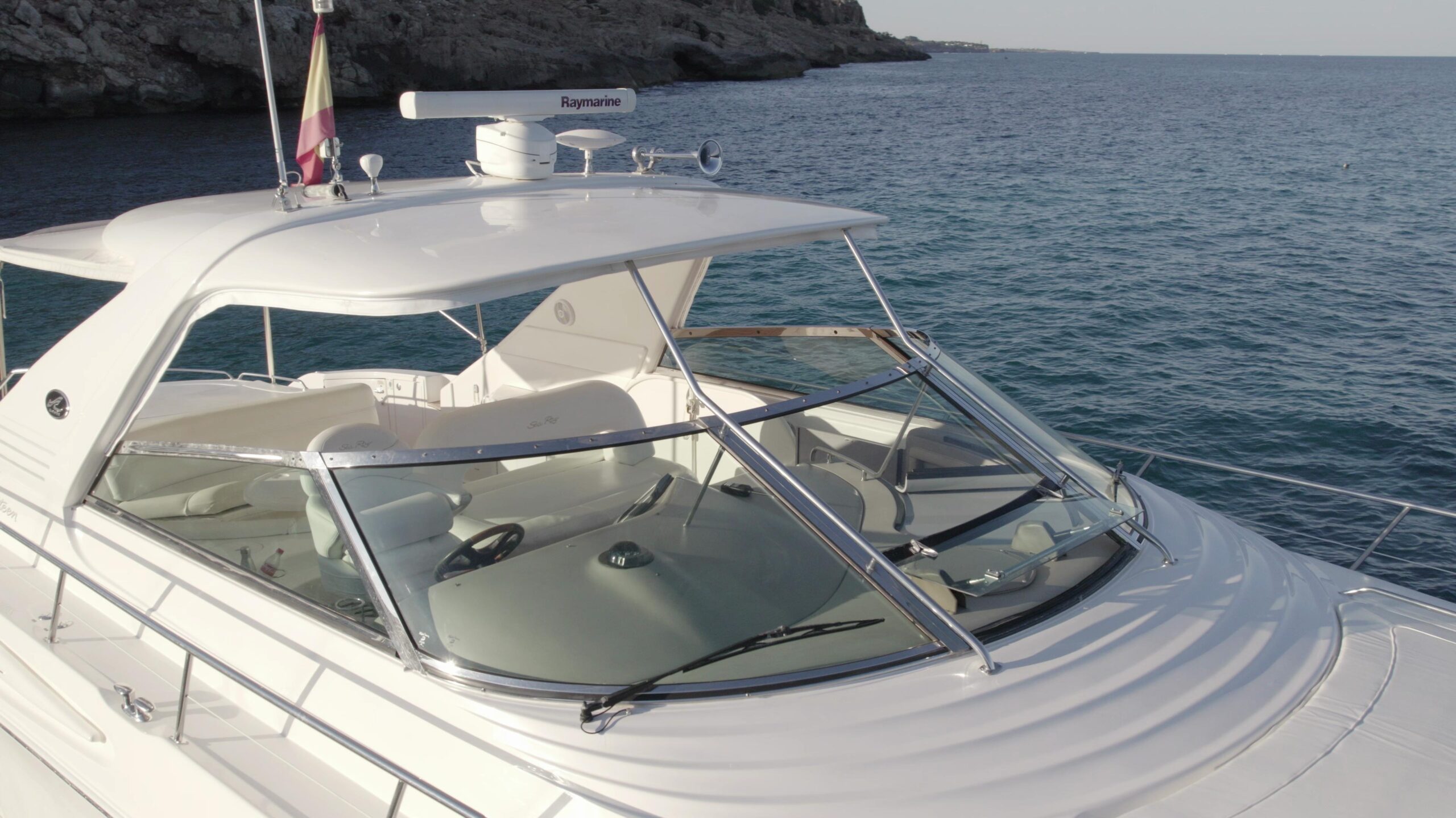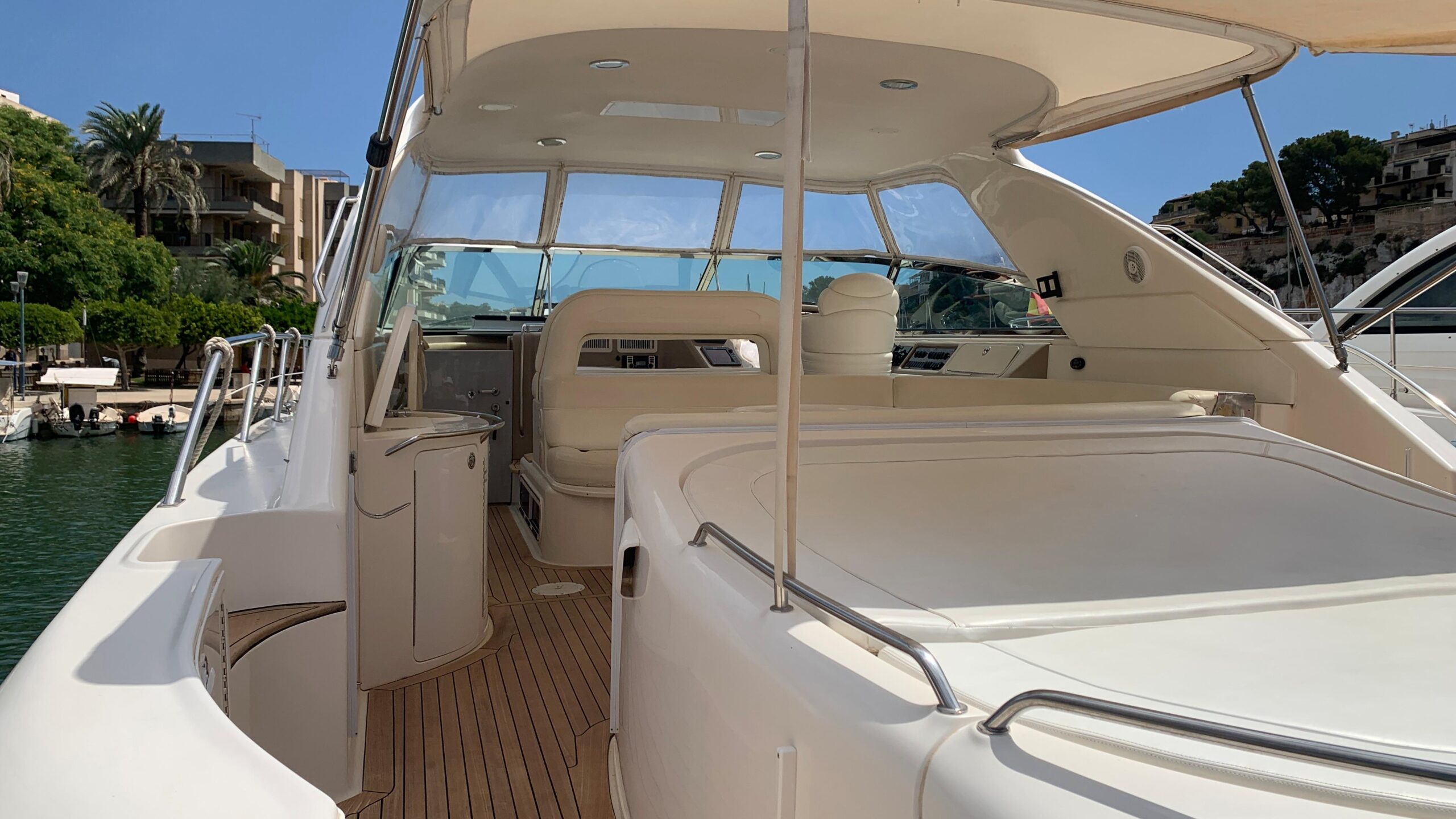 Behind the sofas, towards the stern, we have the engine room which takes advantage of its structure when closed to offer us a solarium with cushions that we can remove (for proper maintenance) and a Bimini Top that we can fold depending on whether we are looking for a bit of shade or some sun rays. Combined with a Clarion Marines sound system to enjoy to the fullest.