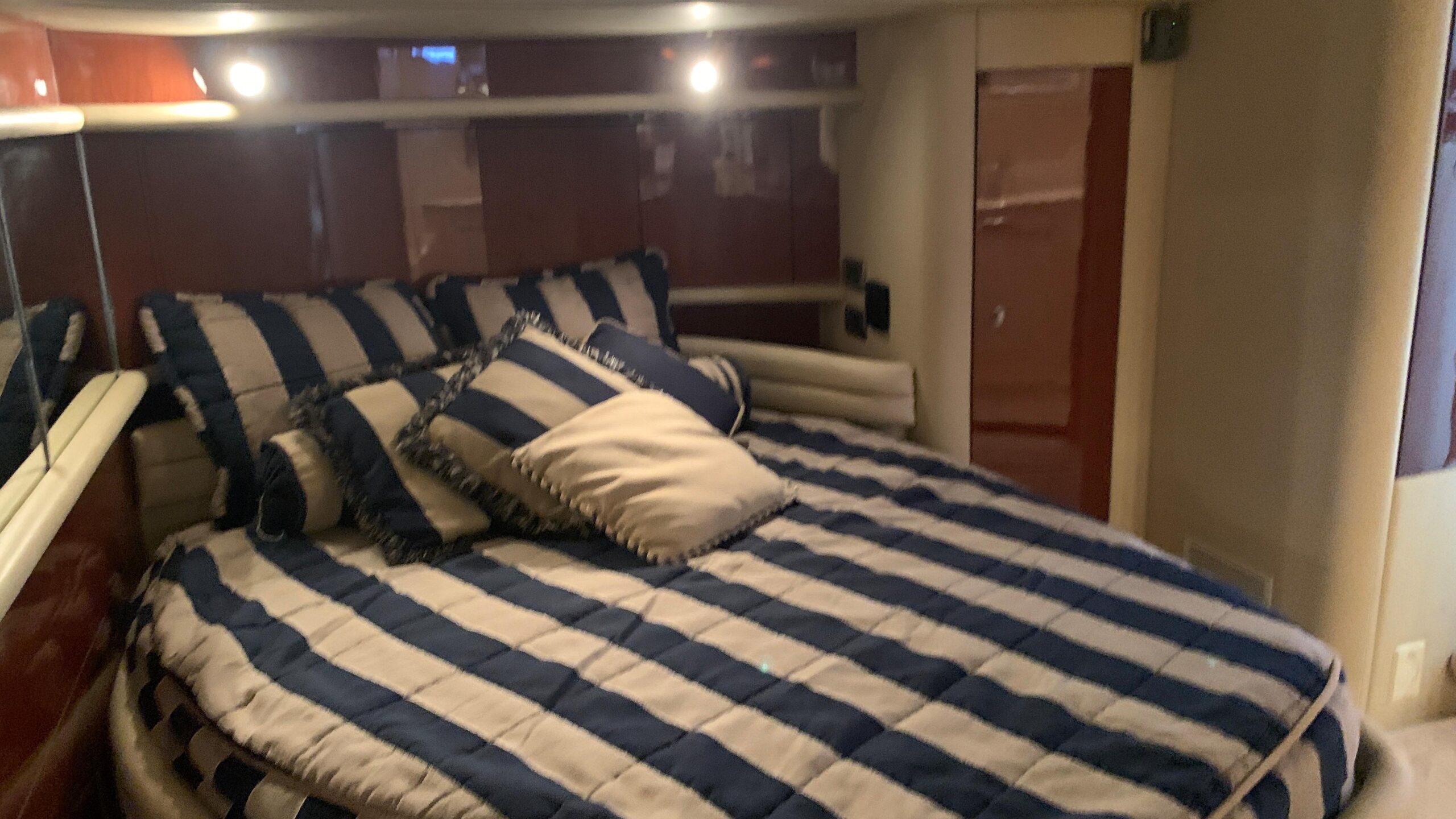 The master cabin is located in the stern, with an en-suite bathroom with the same characteristics as the previous one except that it has a little more space in the shower seat. The master cabin has a very large double bed, 3 large wardrobes for clothes and 4 smaller wardrobes around and shelves above the bed. All interiors are equipped with independent air conditioning and heating.