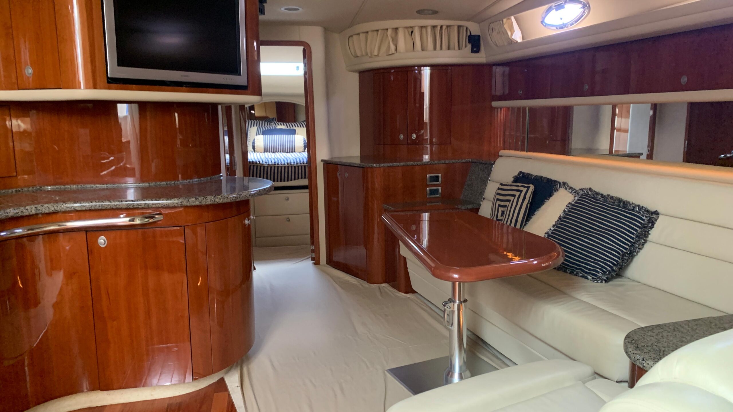 Compass, Log-speedometer, GPS, Autopilot, Radar, VHF Radio, CD player, Depth sounder, Plotter, Radio, TV, DVD player, Speakers in cockpit