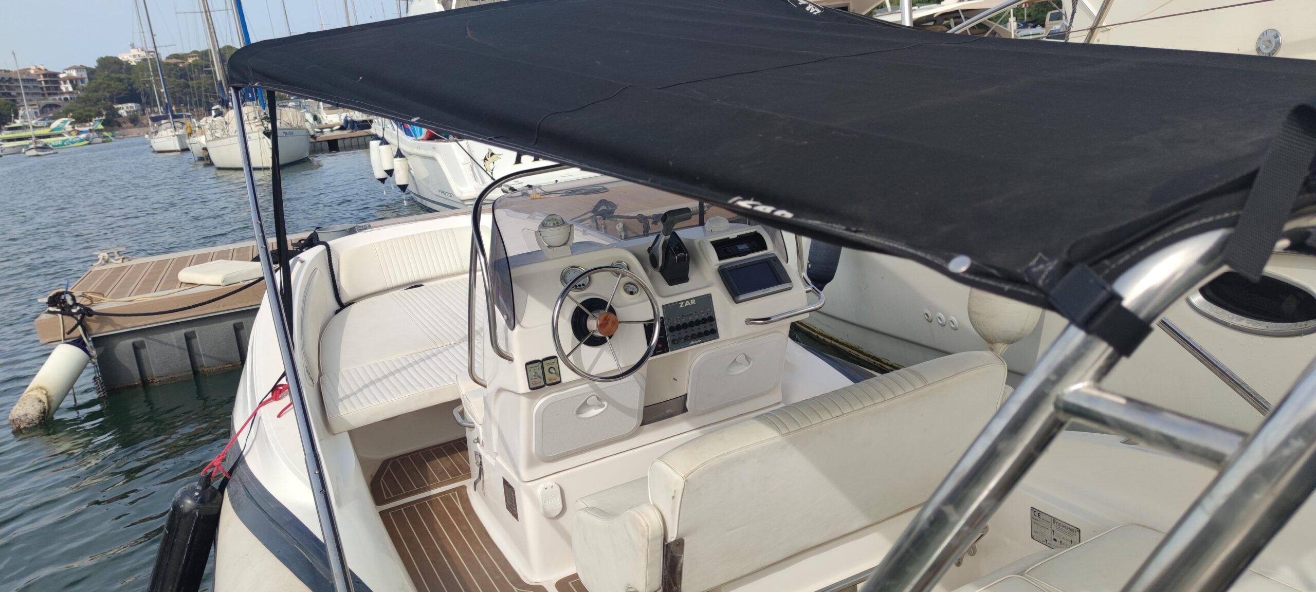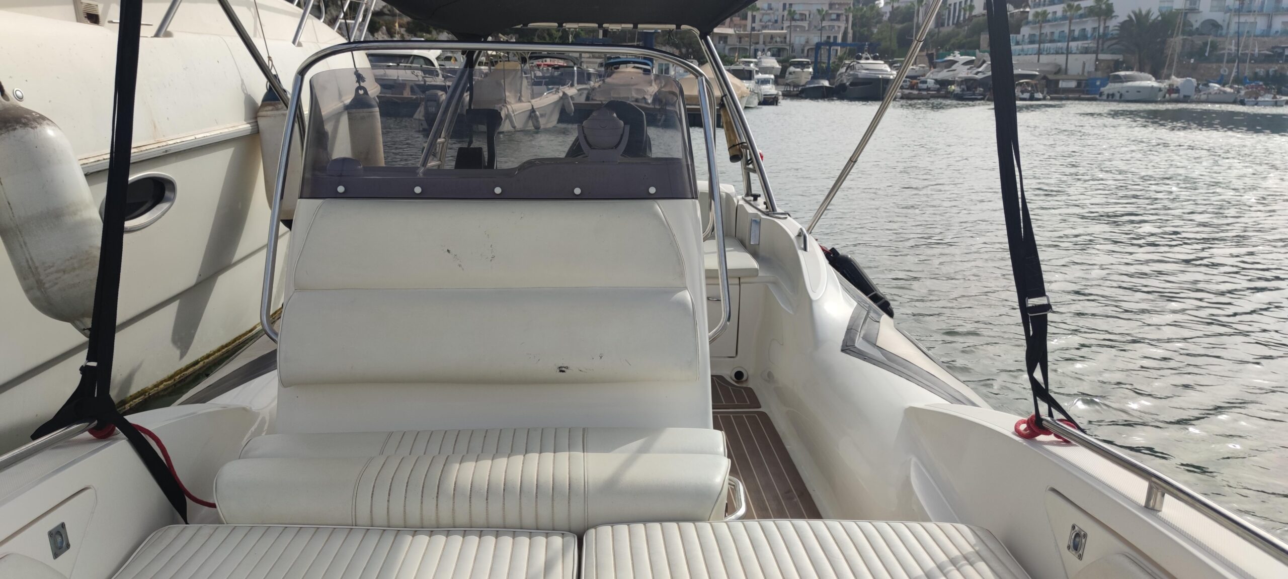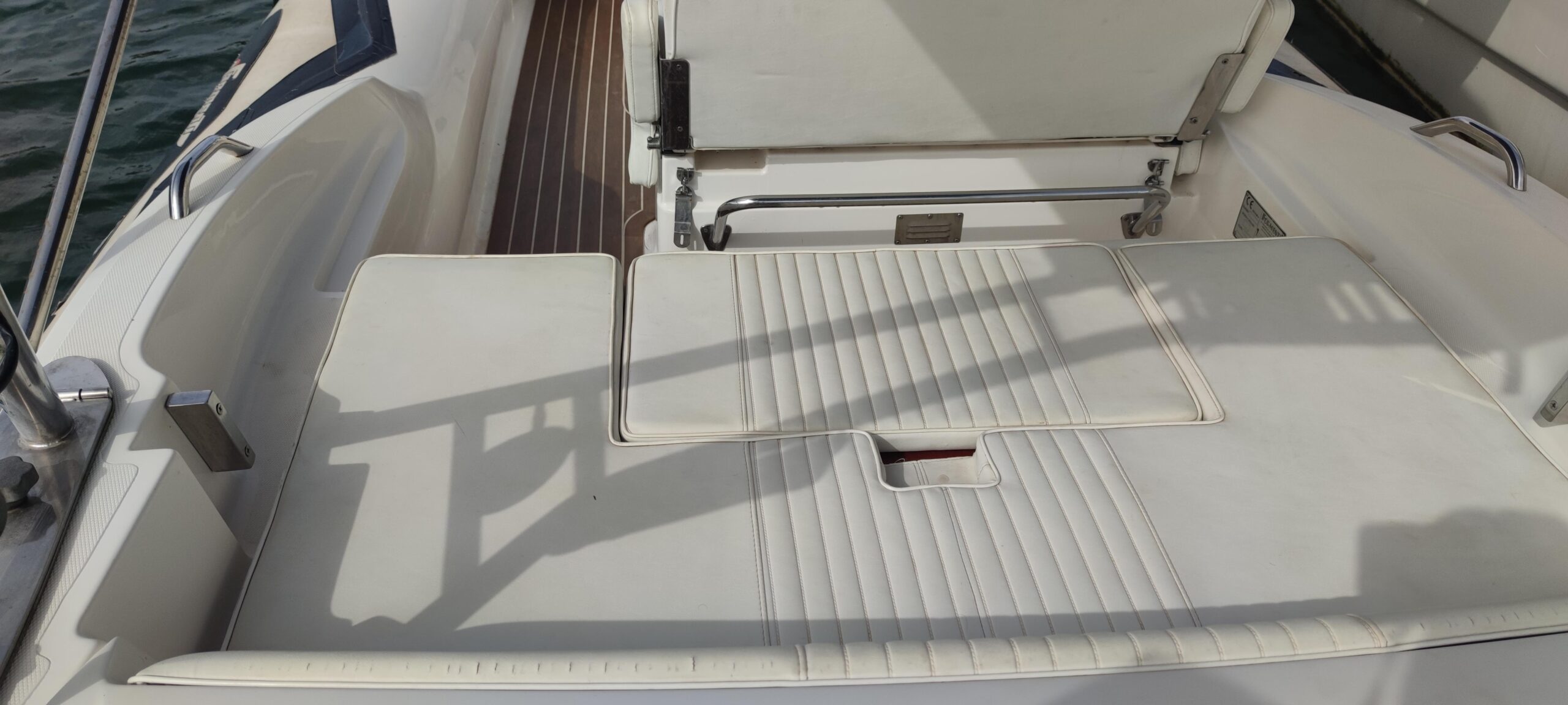 Open bow with starboard cabin. On deck, 3 sunbeds in the bow and port walkway to the cockpit. Double seat for pilot and co-pilot. Cockpit table with U-shaped seat and starboard countertop. Aft sundeck with rotating backrest, facing aft or facing starboard. Bathing platform with submersible hydraulic step. In the cabin, V-seat in the bow convertible into a double bed. Complete bathroom compartment on starboard. In the central part of the boat, two single beds.