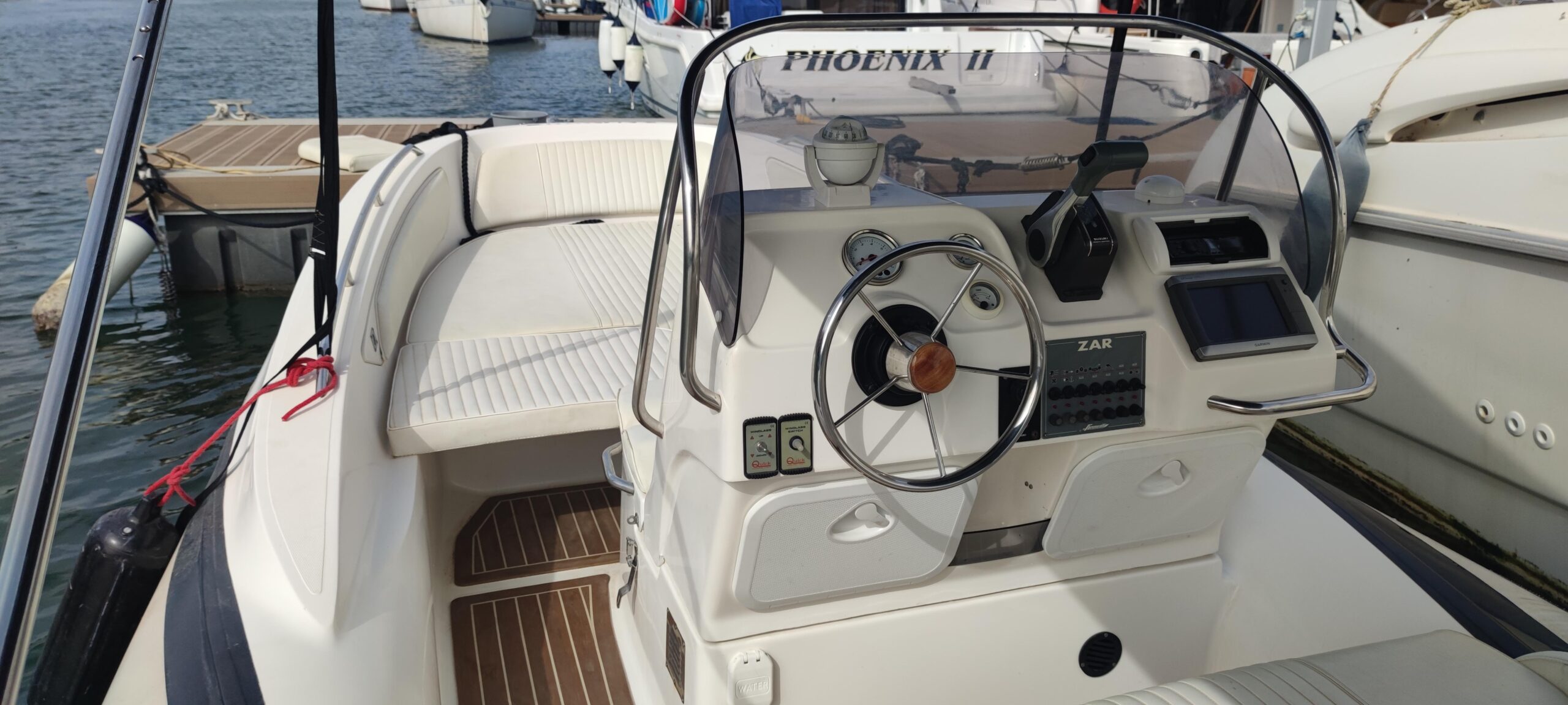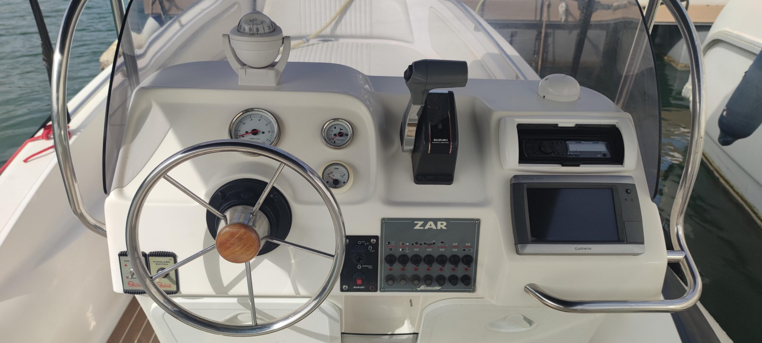 Exterior : L-shaped seat in the port bow cockpit, pilot seat, port stern seat convertible into a solarium, cockpit table, folding stern seat, radar arch with lights, various position lights and in radar arch position, VHF antenna, carpet in cockpit, sink unit in cockpit, battery disconnect switchboard on port side and starter key, cockpit exit door, starboard hatch, bathing platform, hatch in stern, bathing ladder, lights in cockpit.