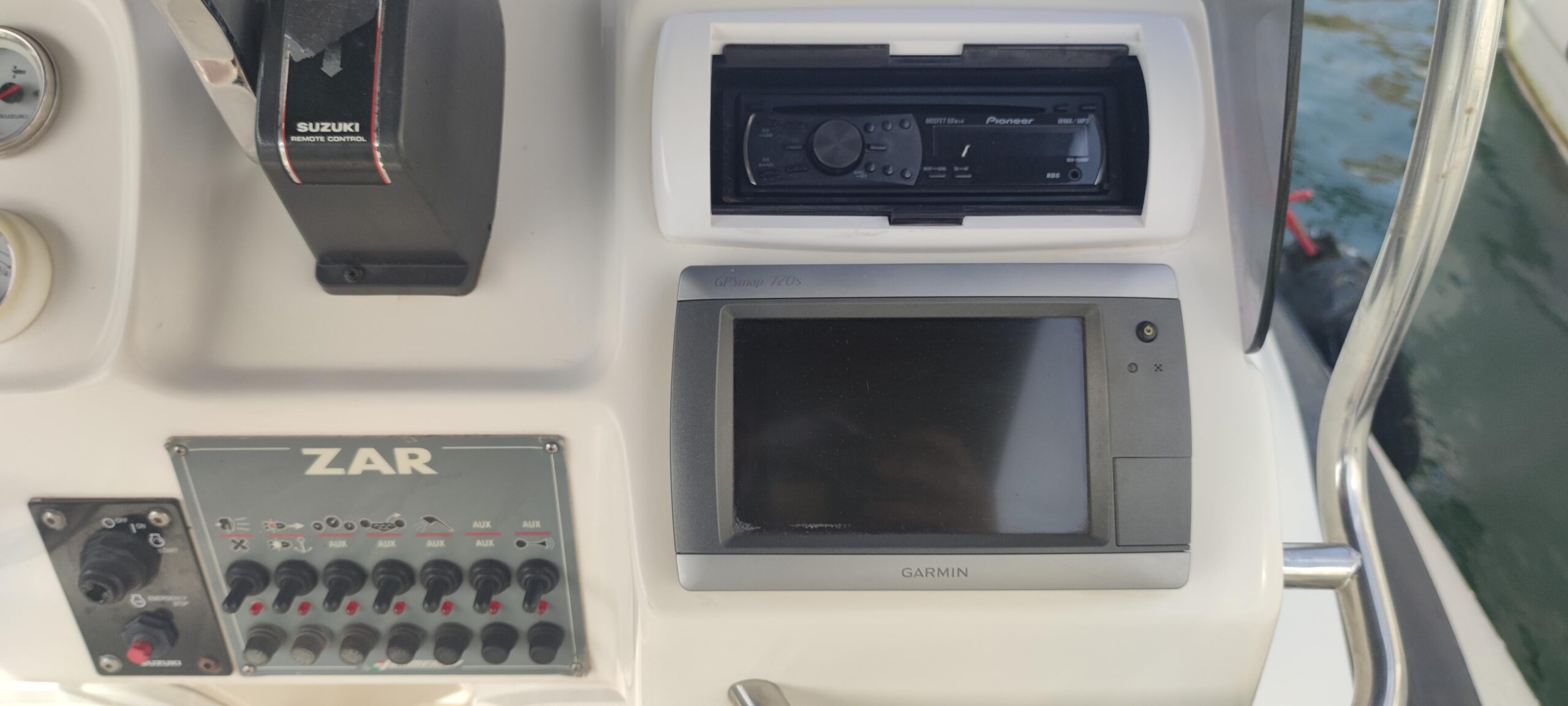 Electronics: Engine control panel, Fuse panel, VHF HM 390 with DSC, Compass, Smart Craft, Switch for trailer, Bow light control, Clarion radio control, 12V charger plug, all this in control panel, TV antenna,