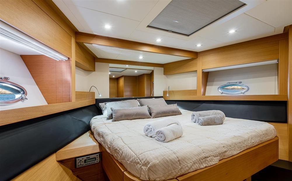 Interior with forward saloon convertible into a double bed, full bathroom with shower on the starboard side, and aft cabin for 2 adults or 3 children.