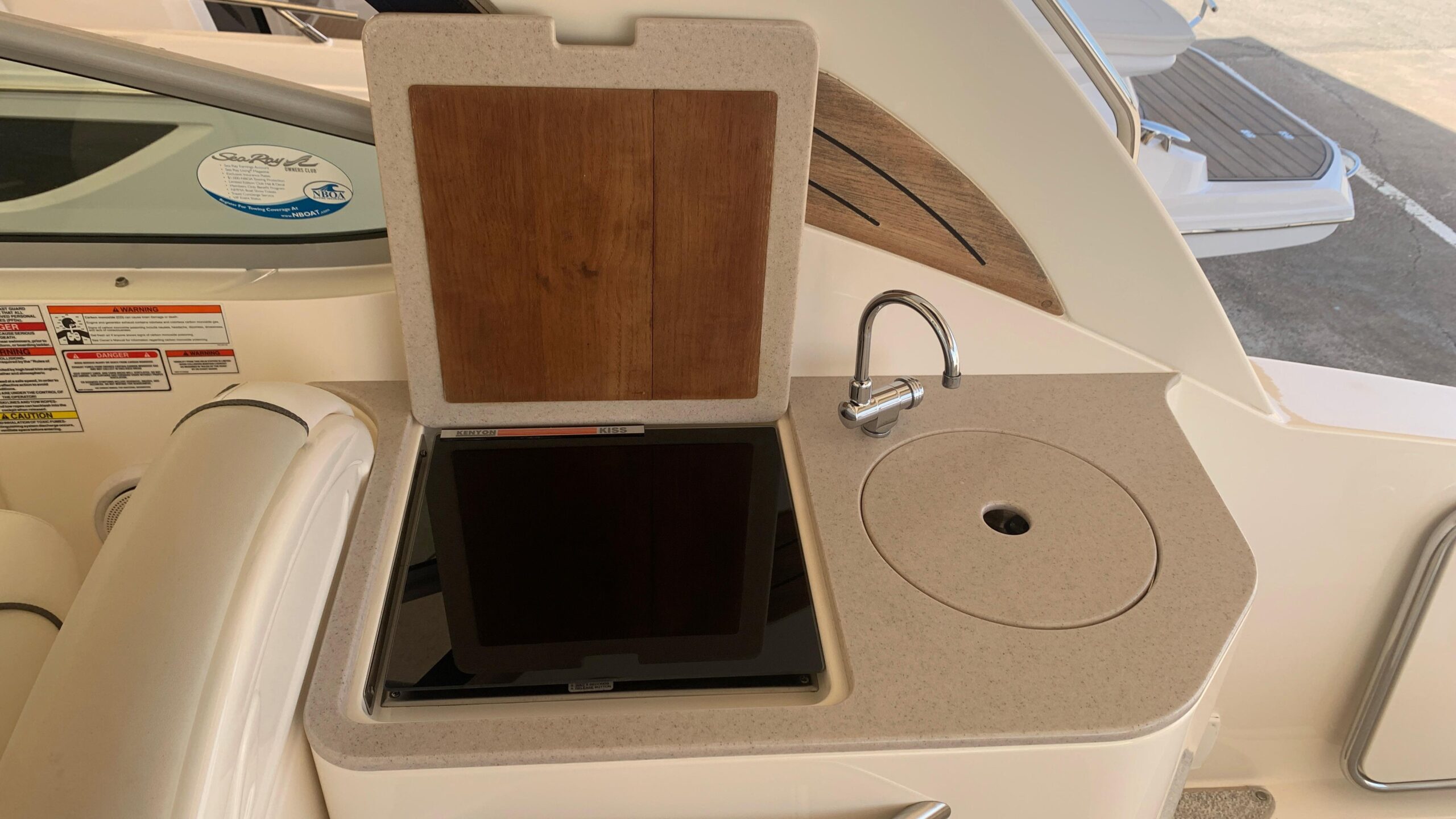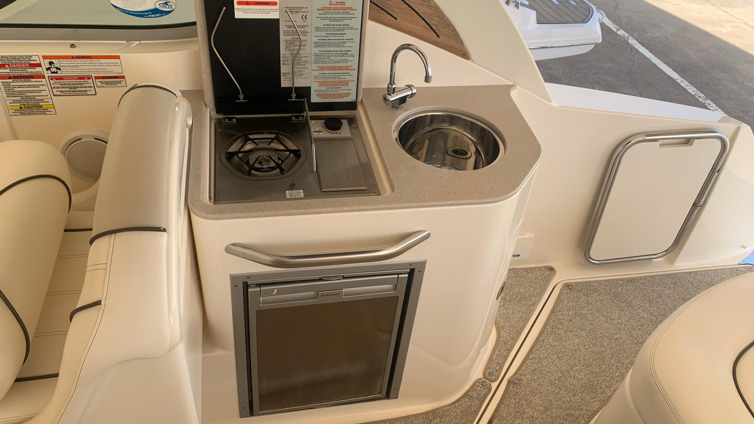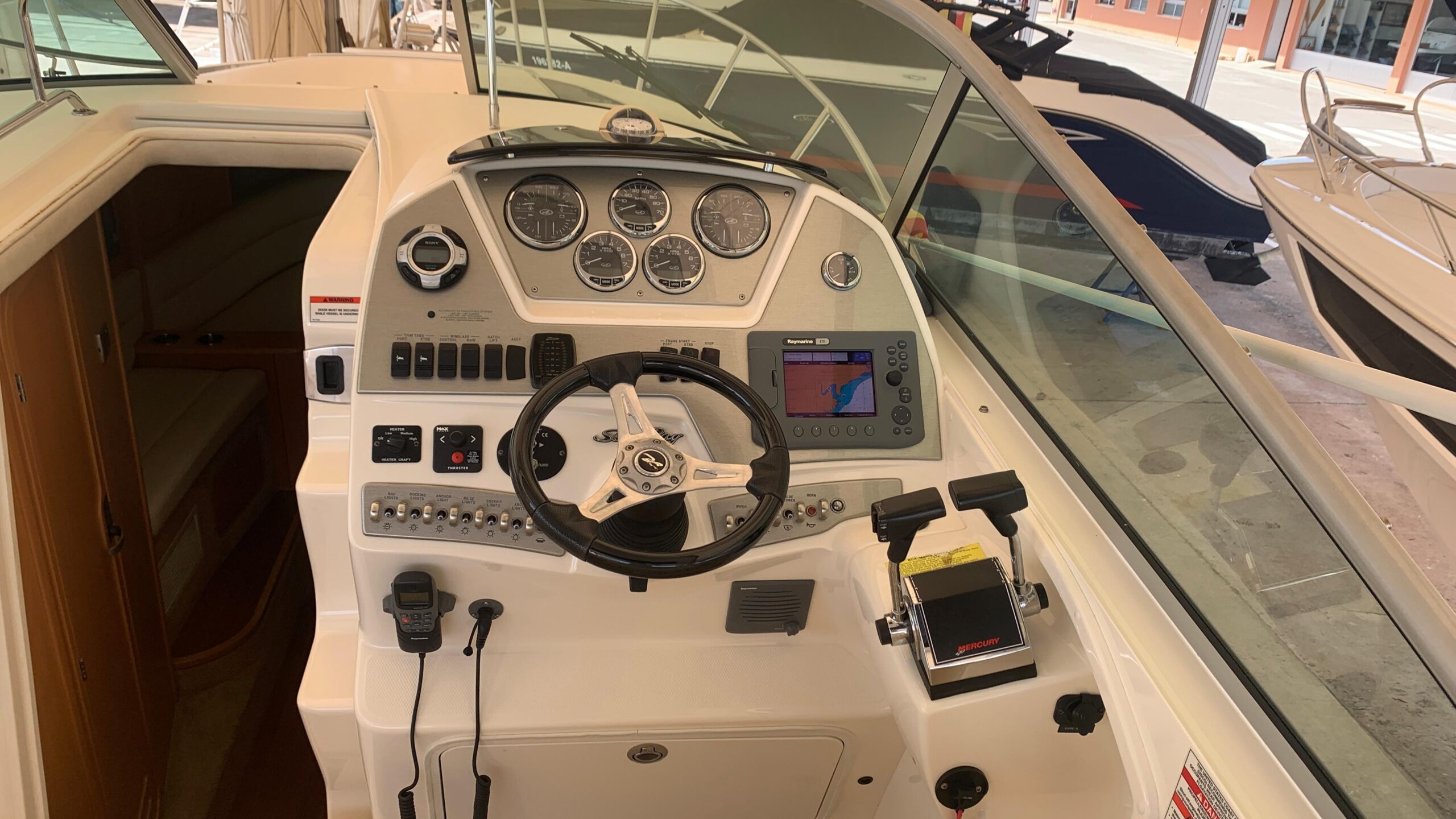 Additional features include a Sunbrella bimini top, an extended swim platform, and a 12V Clarion AM/FM/CD player with Sirius satellite radio.