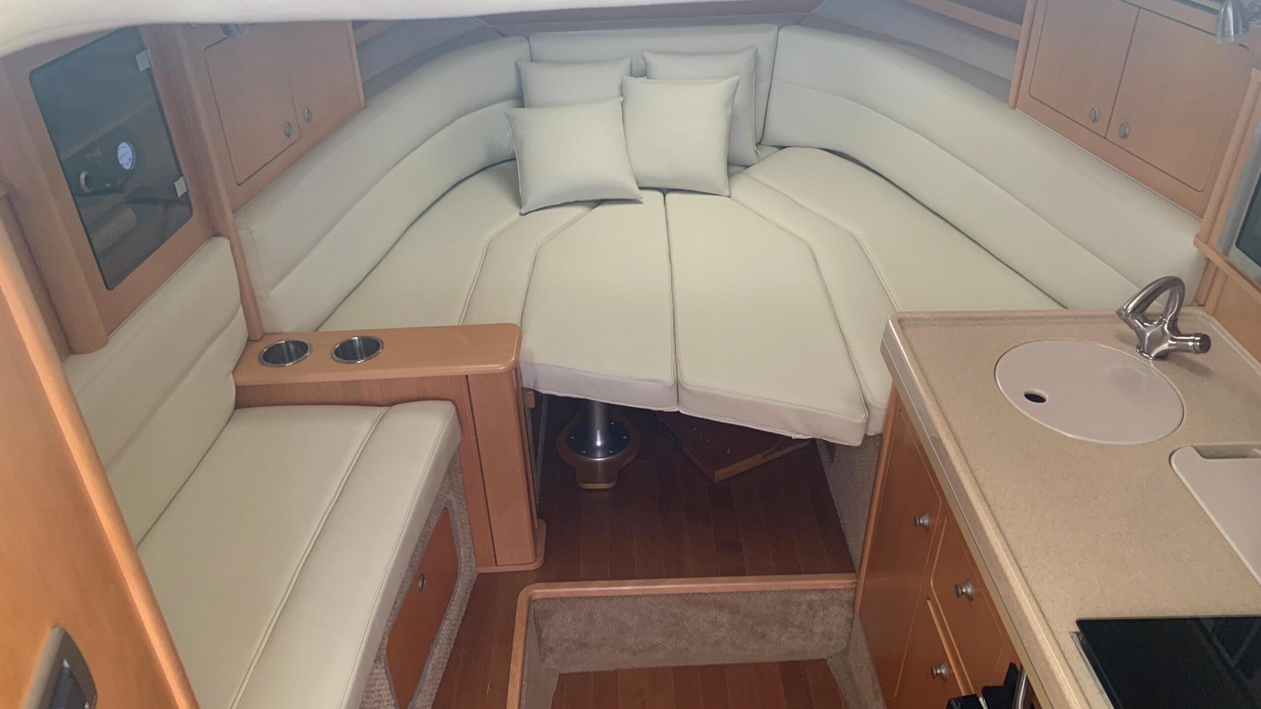 The designer cabin features a cozy V-berth that converts into a dining area, an enclosed head, and a galley with a sink, faucet, and built-in icebox.