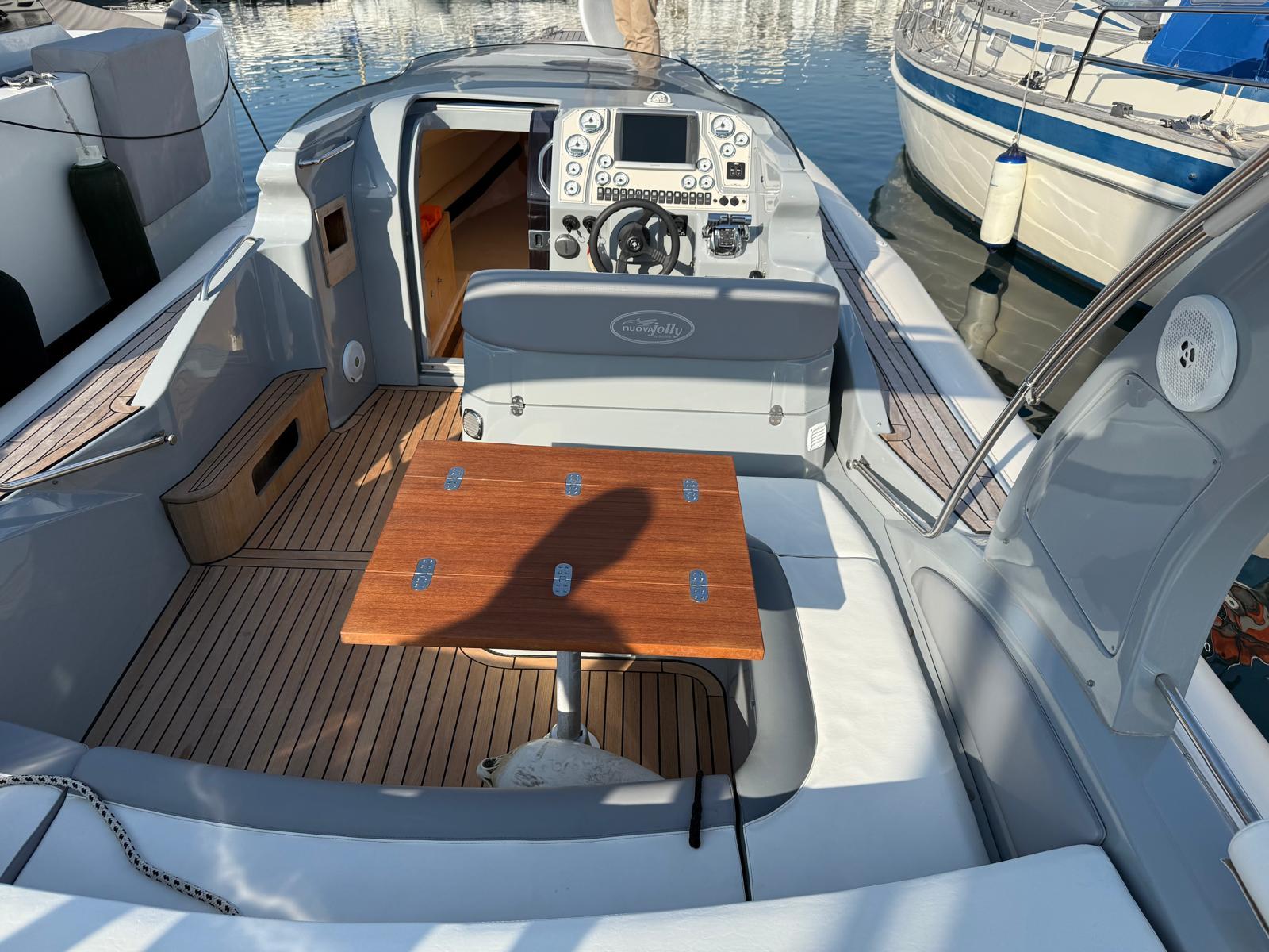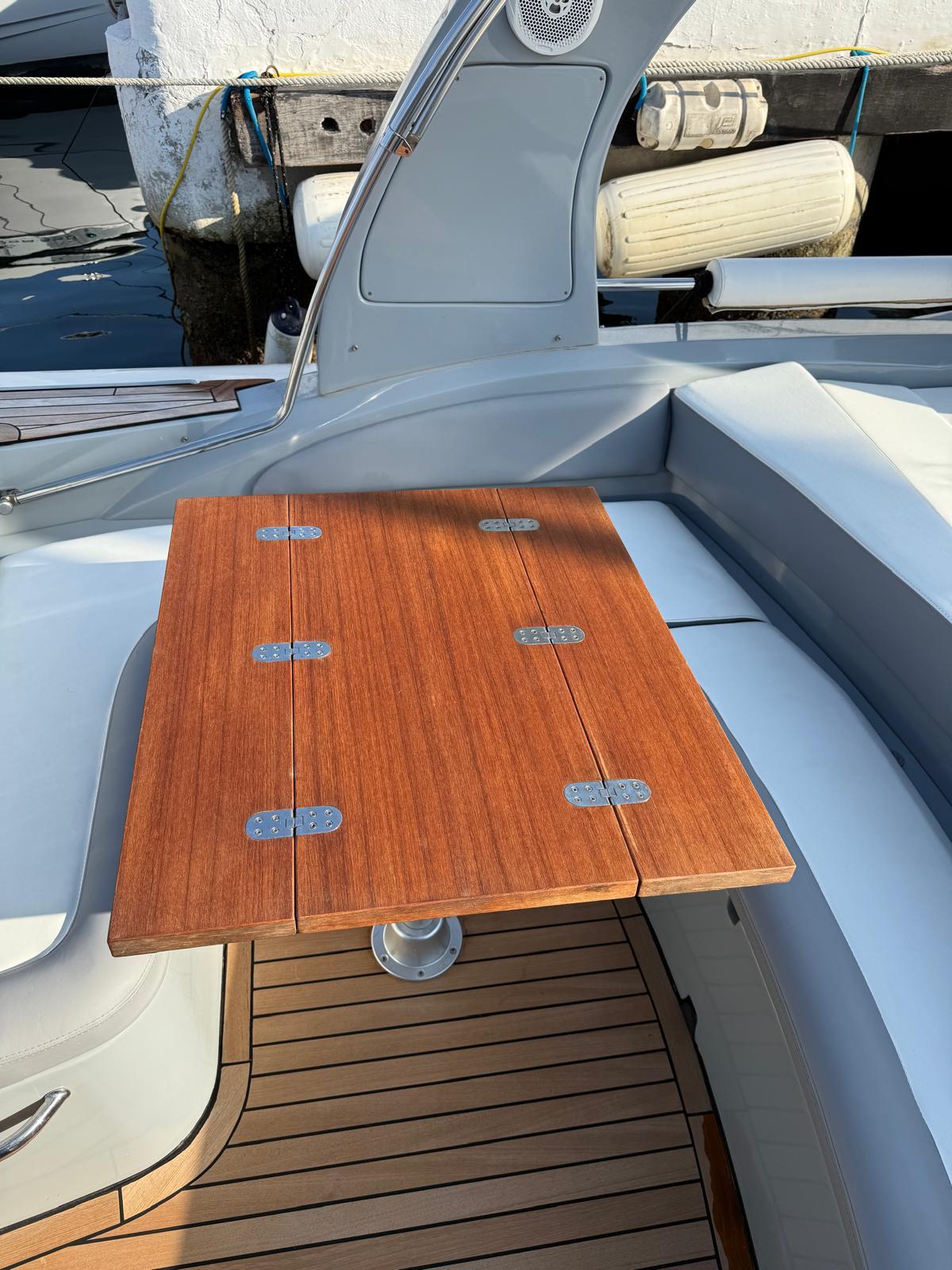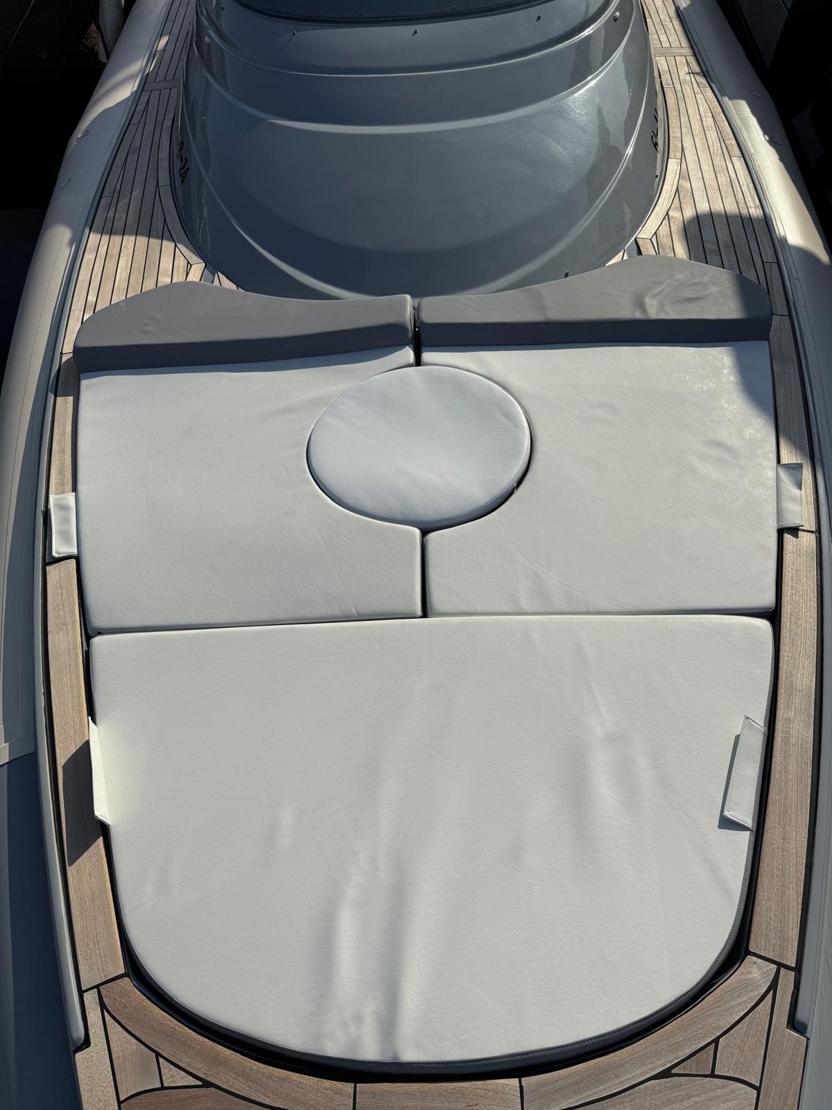 Behind the sofas, towards the stern, we have the engine room which takes advantage of its structure when closed to offer us a solarium with cushions that we can remove (for proper maintenance) and a Bimini Top that we can fold depending on whether we are looking for a bit of shade or some sun rays. Combined with a Clarion Marines sound system to enjoy to the fullest.