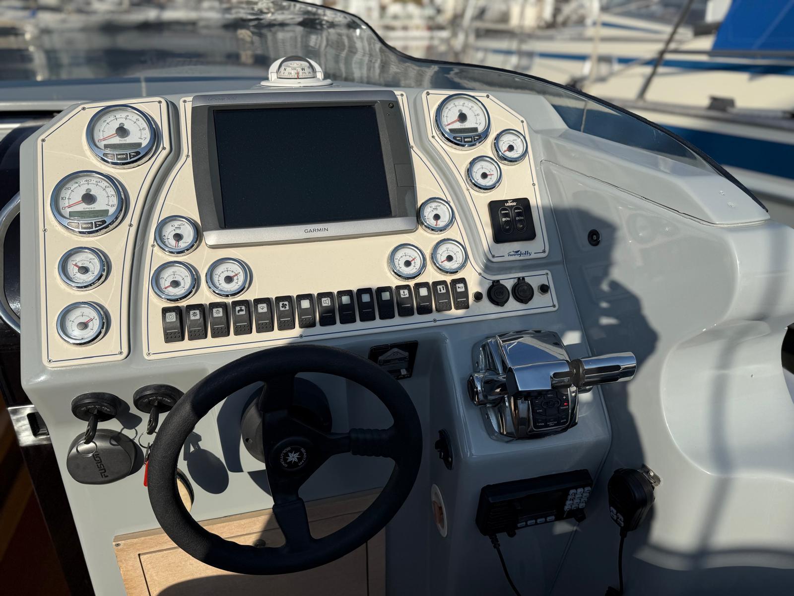 Powered by a robust Mercruiser 350 MAG inboard engine, delivering 300 horsepower, it achieves cruising speeds of 28 knots and a maximum hull speed of 40 knots, making it perfect for thrilling outings.