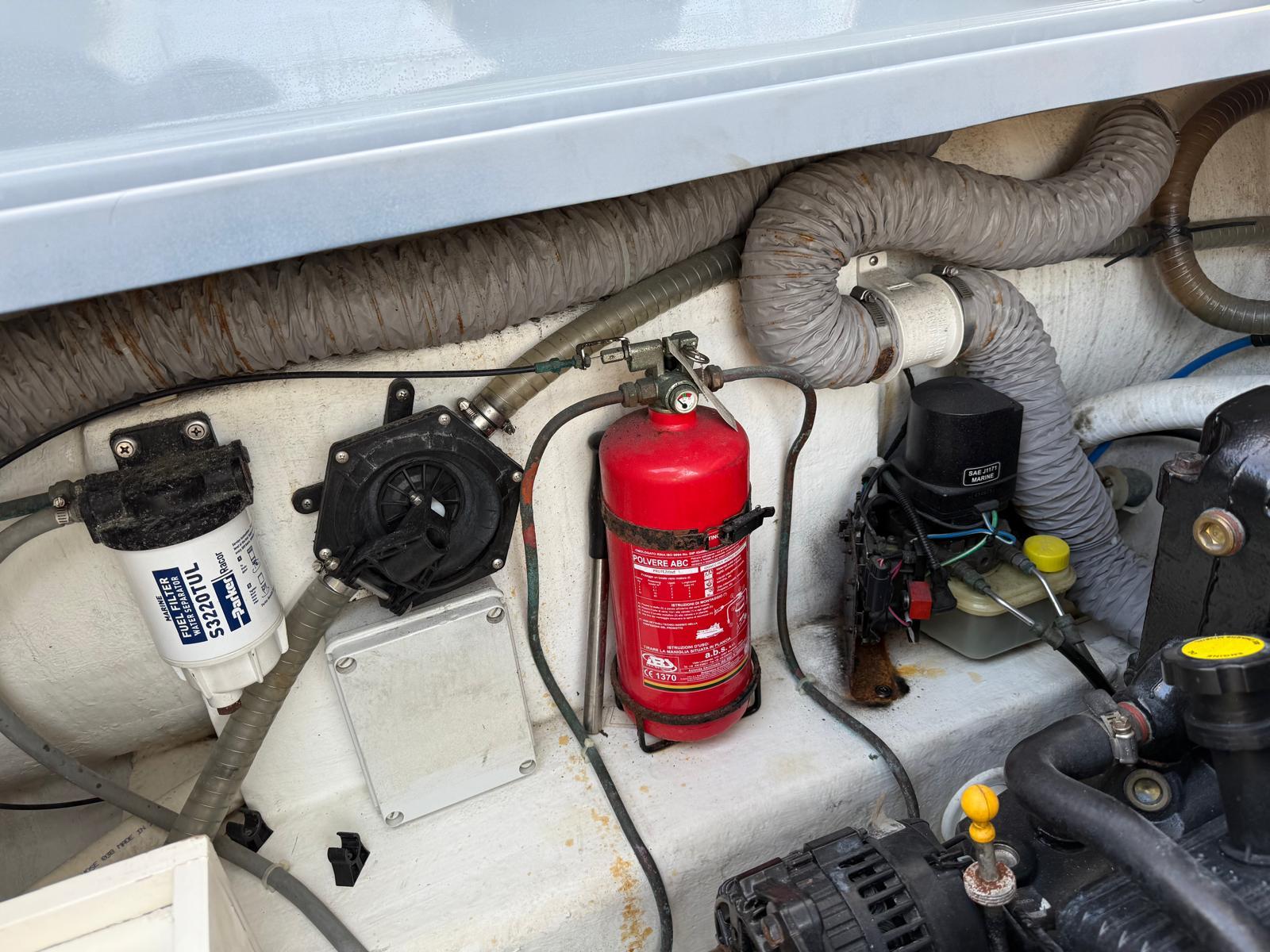 This boat is equipped with a central bathroom which is accessed from the living room, and which is closer to the secondary cabin. The bathroom has a large shower with seat, WC separate from the shower, a tap, 2 compartments in the upper mirror and a compartment under the tap as well as a plug.