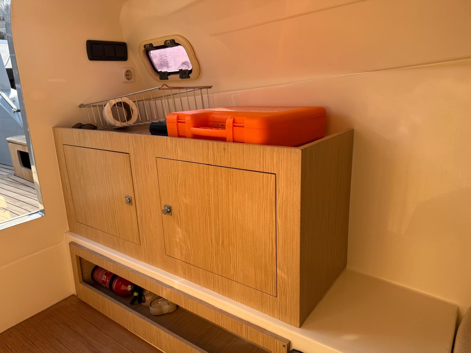 Finally, the secondary cabin has a very spacious double bed, 1 large wardrobe, 2 drawers under the bed and another 3 drawers and a smaller wardrobe on the side. Air conditioning and heating and sunroof window.