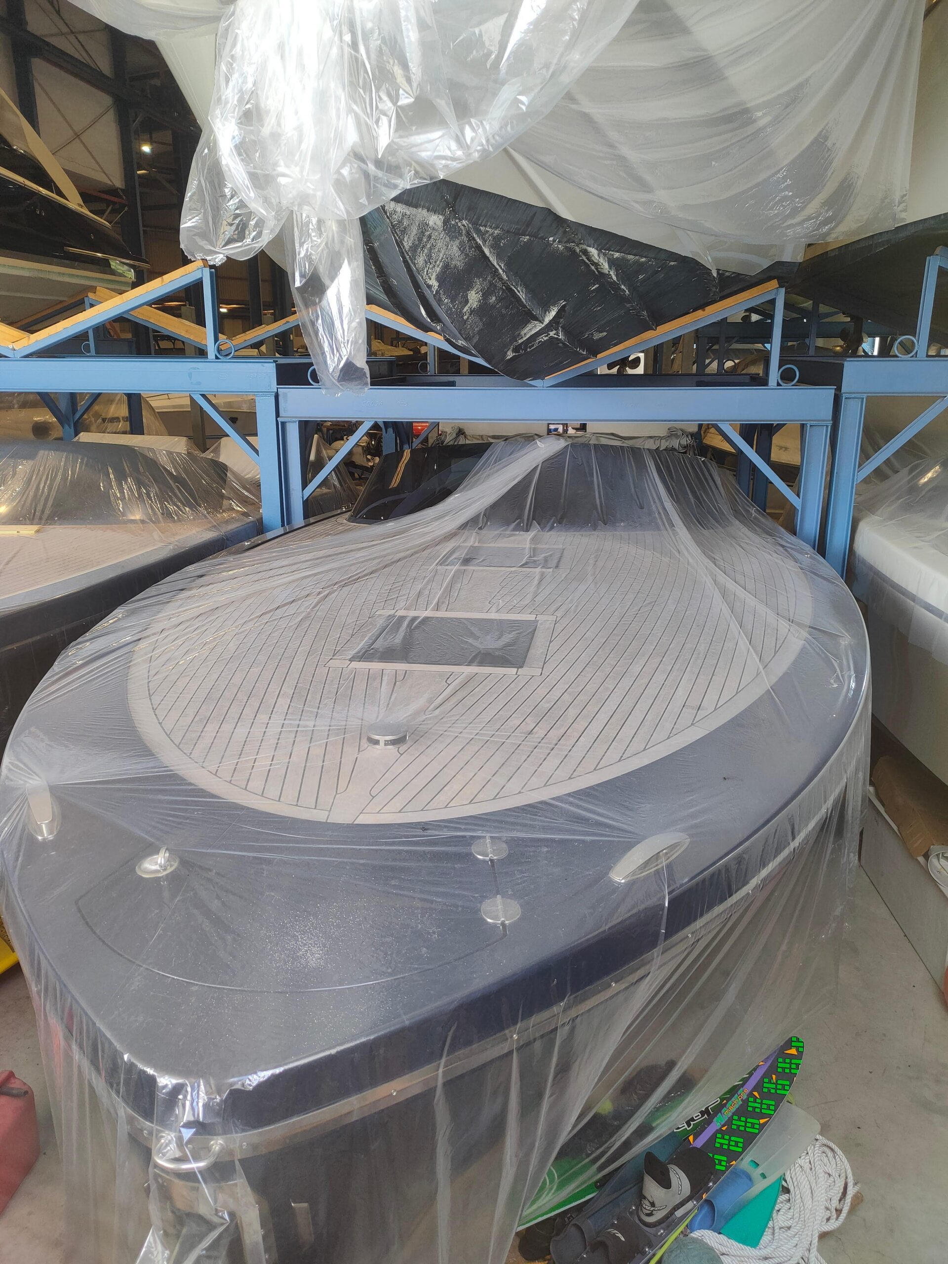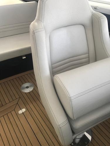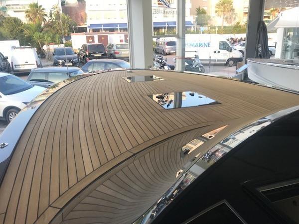 Open bow with starboard cabin. On deck, 3 sunbeds in the bow and port walkway to the cockpit. Double seat for pilot and co-pilot. Cockpit table with U-shaped seat and starboard countertop. Aft sundeck with rotating backrest, facing aft or facing starboard. Bathing platform with submersible hydraulic step. In the cabin, V-seat in the bow convertible into a double bed. Complete bathroom compartment on starboard. In the central part of the boat, two single beds. Swim platform and cockpit with teak flooring.