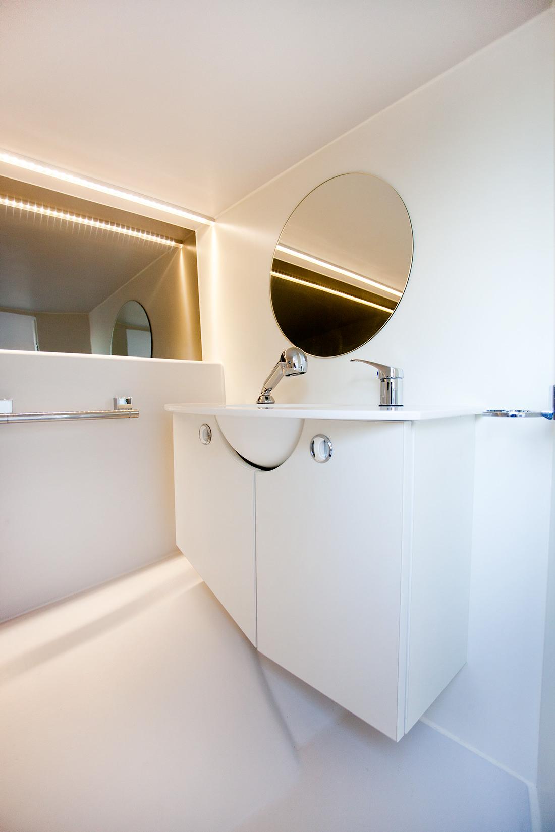 The designer cabin features a cozy V-berth that converts into a dining area, an enclosed head, and a galley with a sink, faucet, and built-in icebox.