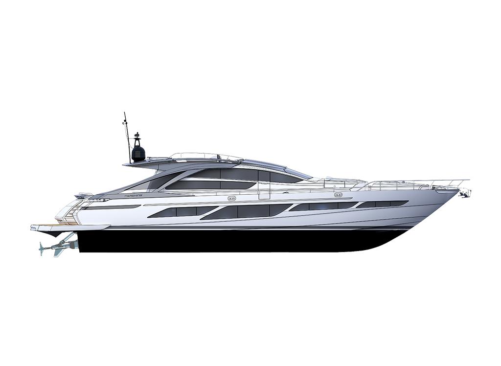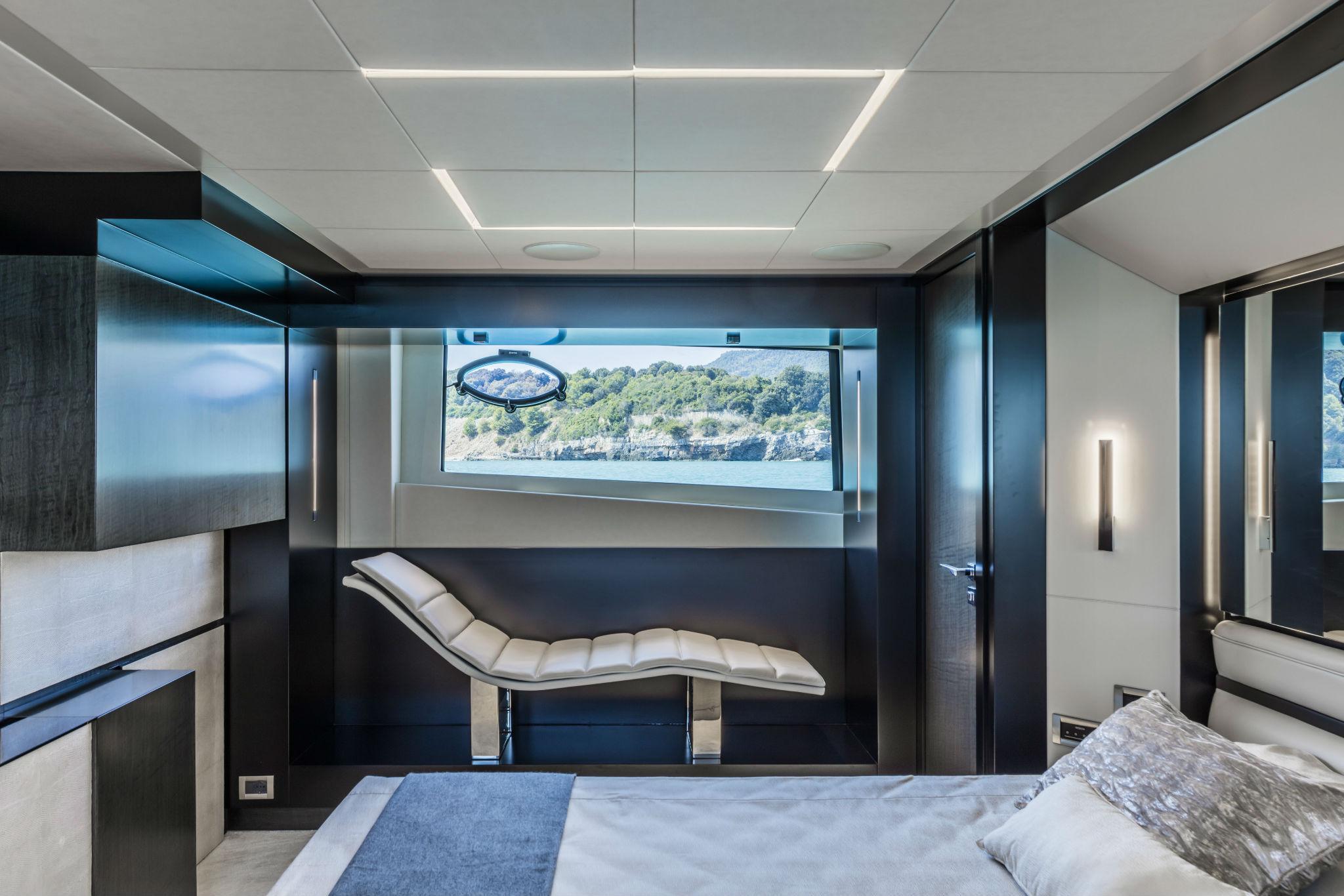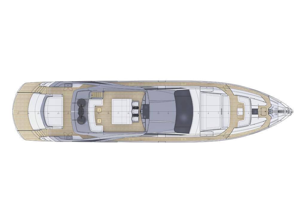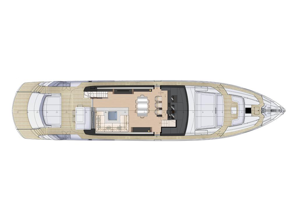Second control station (on main deck), Control panel, Vessel name (in backlit stainless steel), Tender base (Standard), Cockpit table (electric), Side door (on port side), Cockpit awning, Upholstery (exterior different from standard), Bedspreads, Cockpit shower (hot/cold water), Cushions on aft seats (decorative), Covers (waterproof for cushions and tables), Porthole (enhanced with carbon look)
