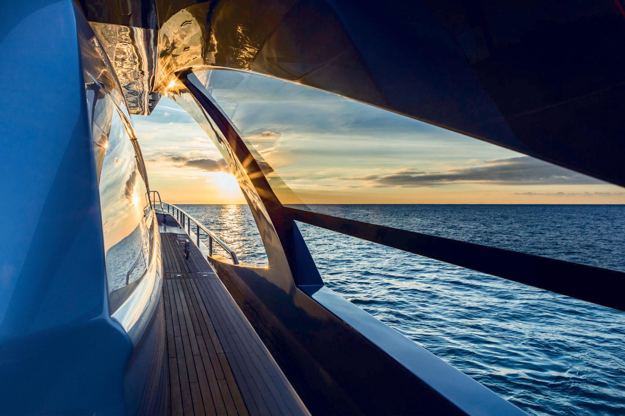 More than 15 m2 of glass window surface guarantees unparalleled natural internal brightness; the exterior spaces of the sun deck and bow offer the greatest freedom while ensuring complete privacy for an exclusive view of the world.