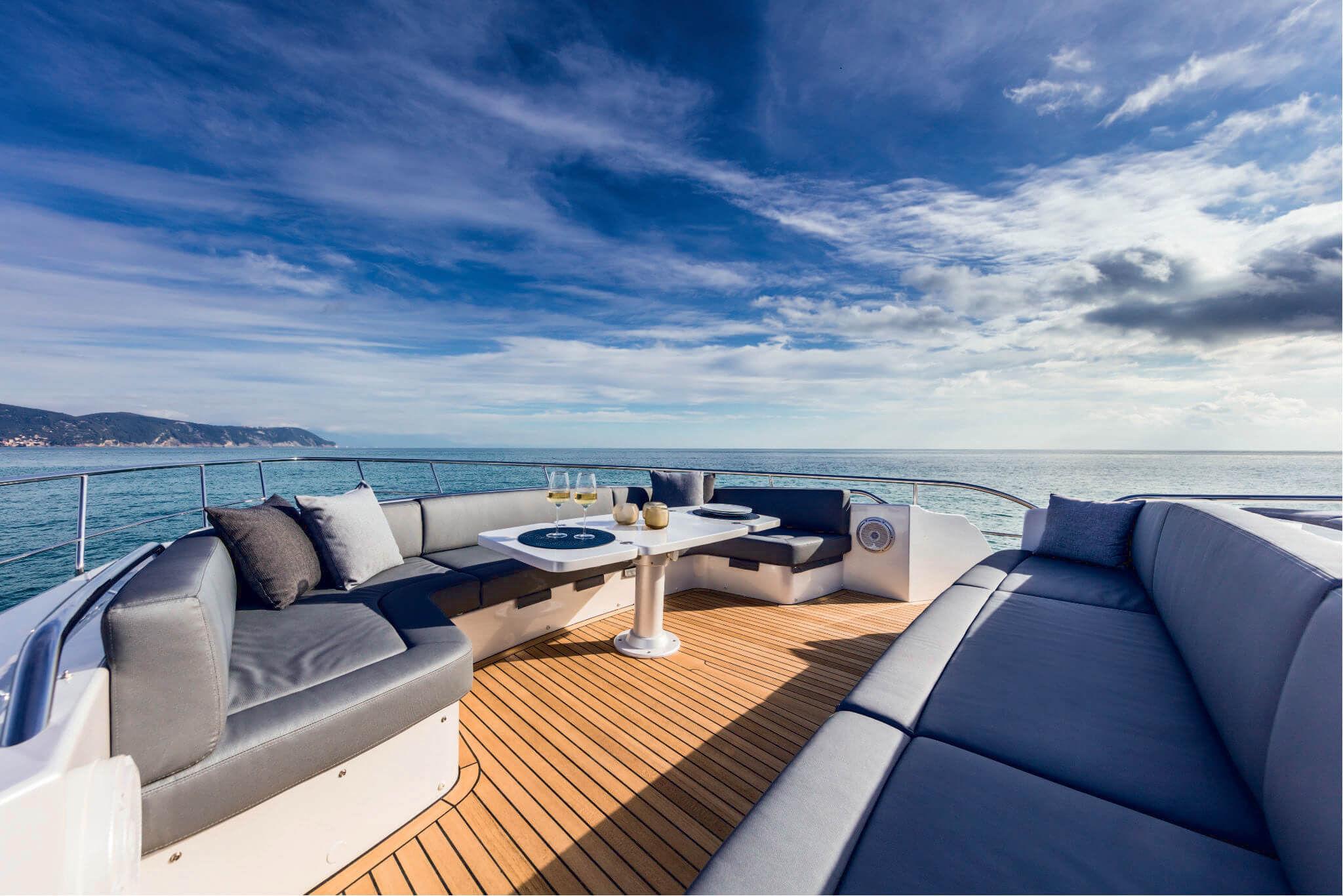 EXTERIOR DINETTE IN BOW: Bimini with posts, Bow sofa, Stainless steel handrails Ø40mm with posts Ø30mm Chaiselong upholstered in white vinyl, Extendable GRP table adjustable in height with gas piston, LED lighting, Side compartment with closure (2), Sofa upholstered in vinyl fabric, Teak floor, Waterproof speakers (2)