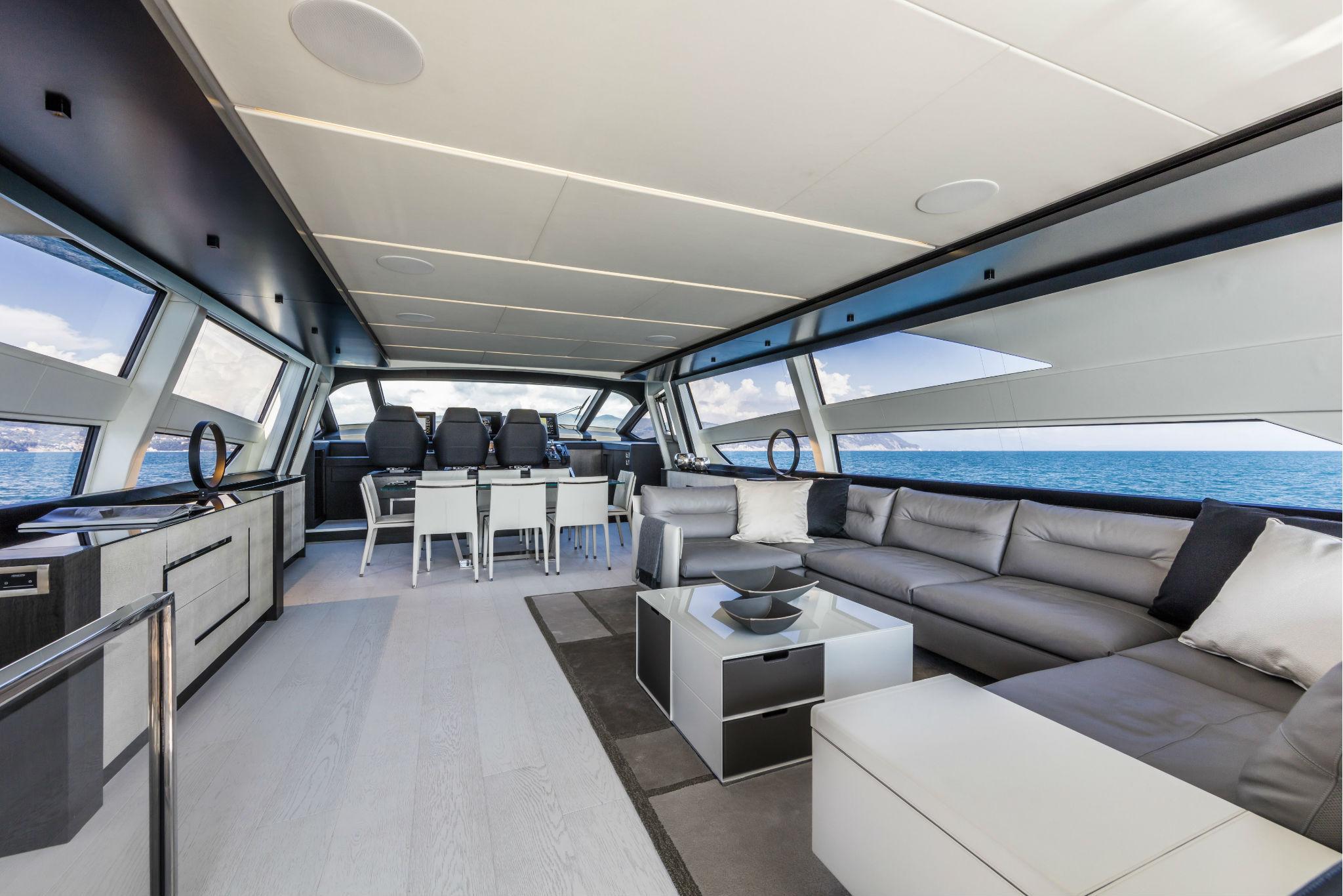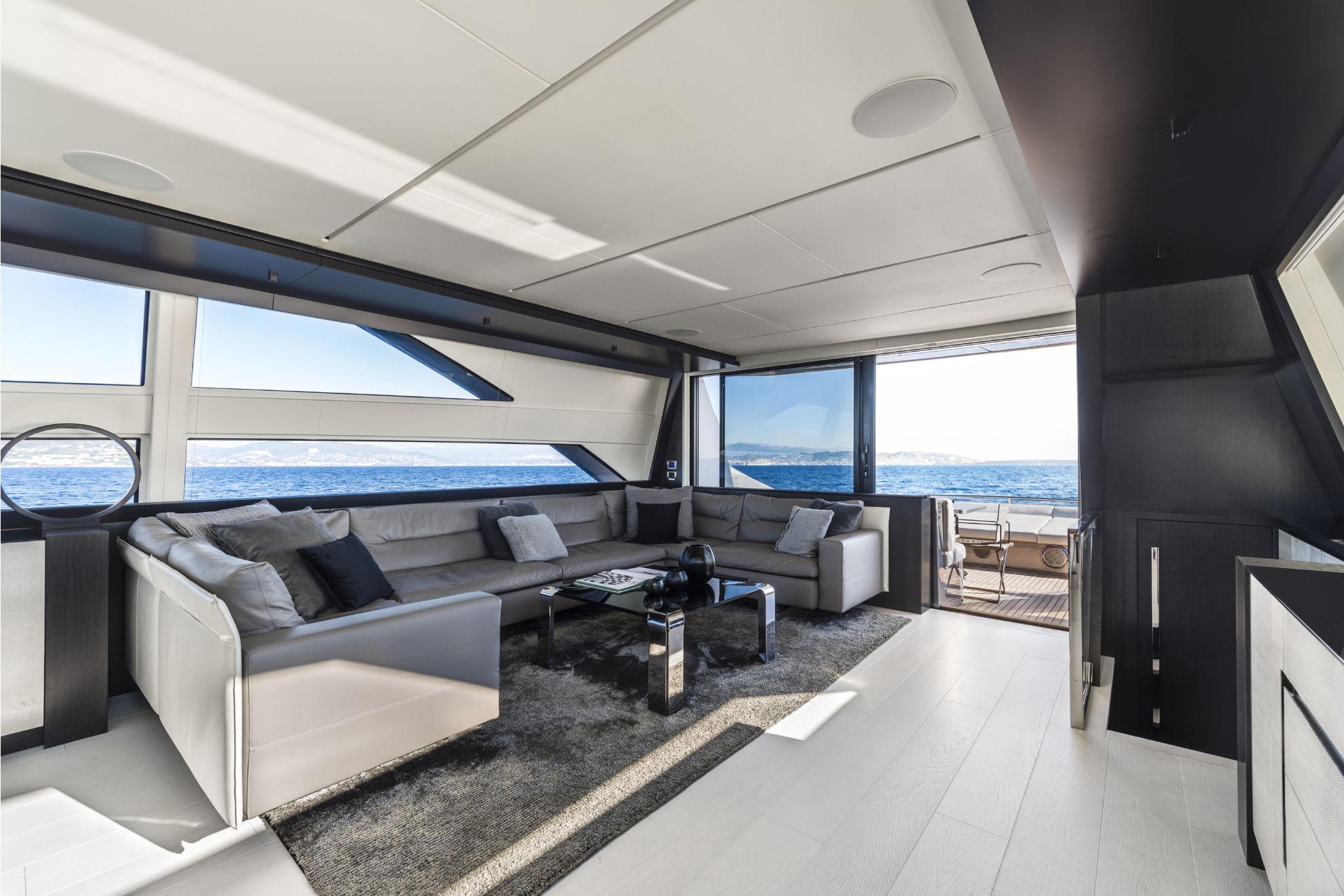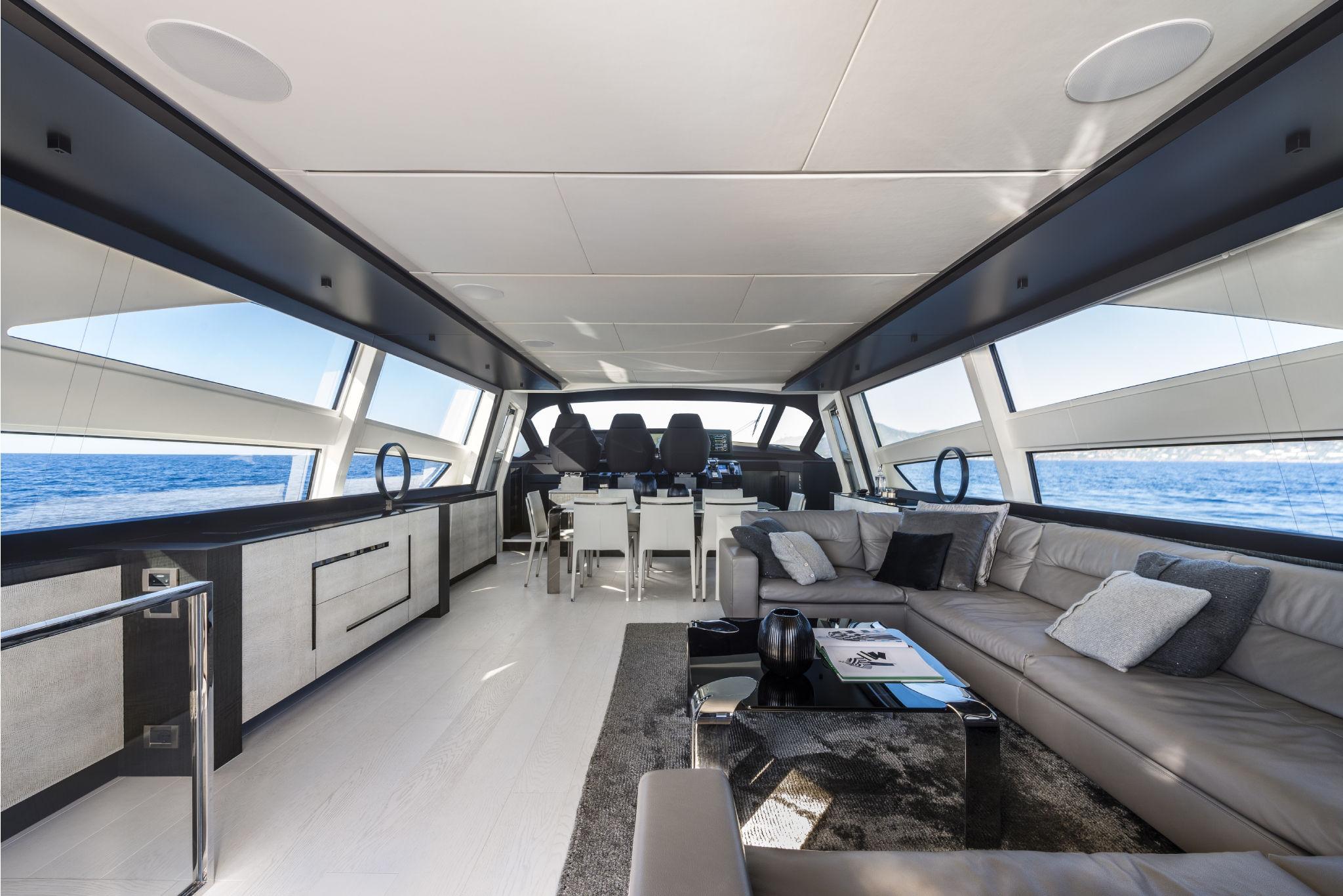 SALON: Side walls upholstered in leather, Light switches, Port furniture with TV lift, electric mechanism, Carpet under the sofa, Side windows in monolithic/laminated tempered glass, Sliding rear door in stainless steel and multilayer tempered glass, Starboard handrails, Starboard furniture in escesia wood with glass top
