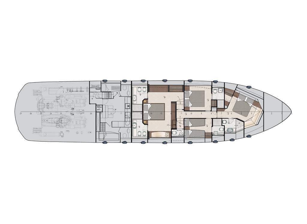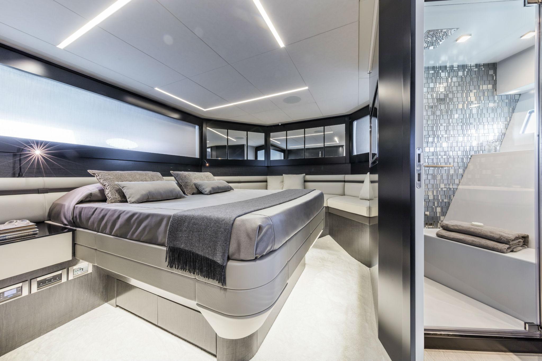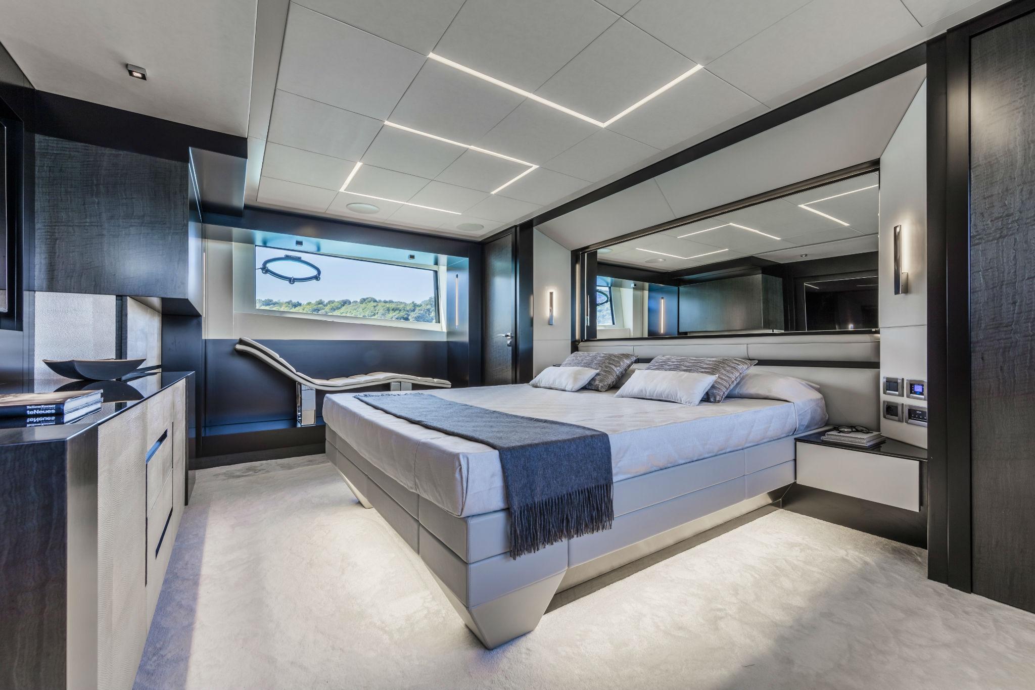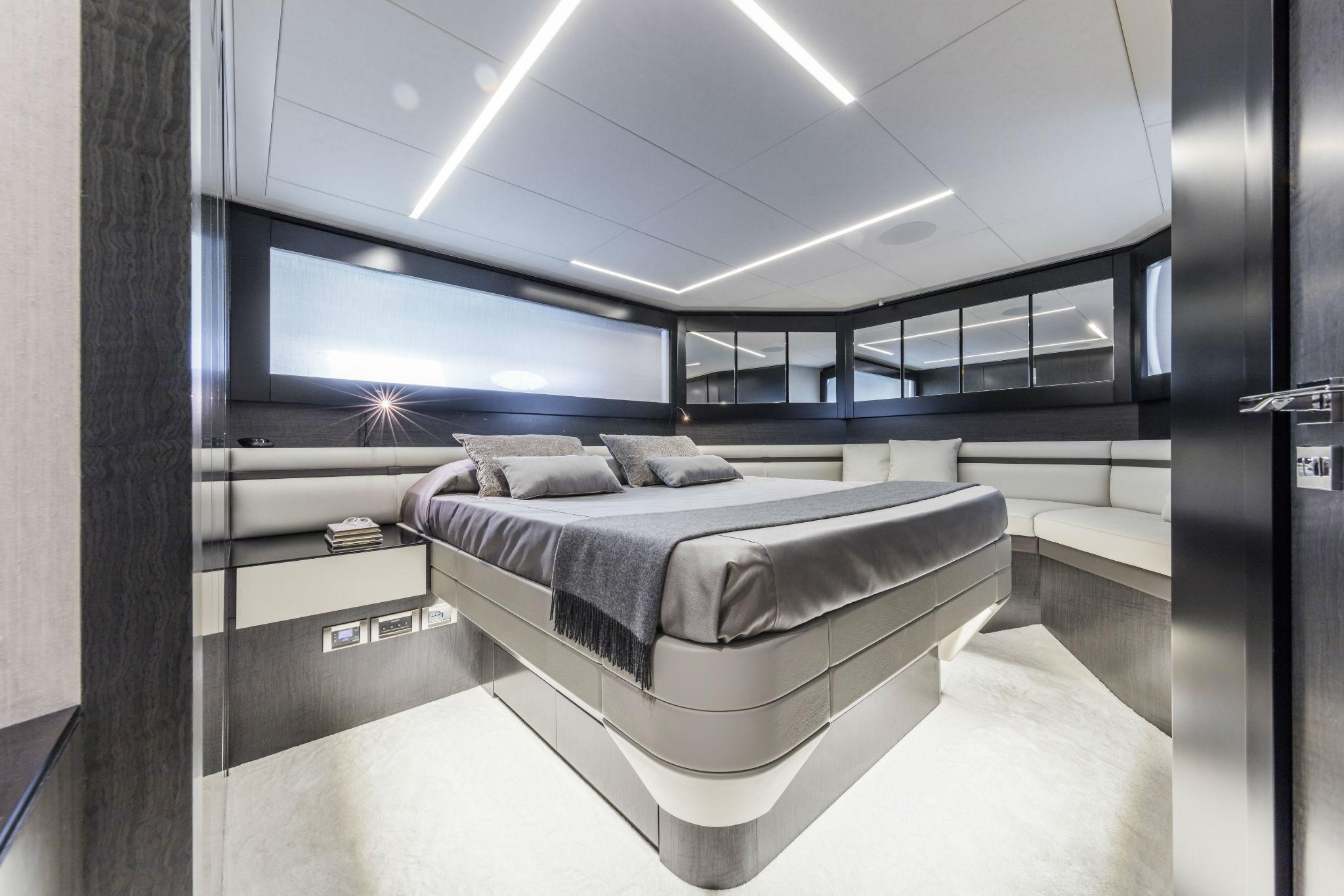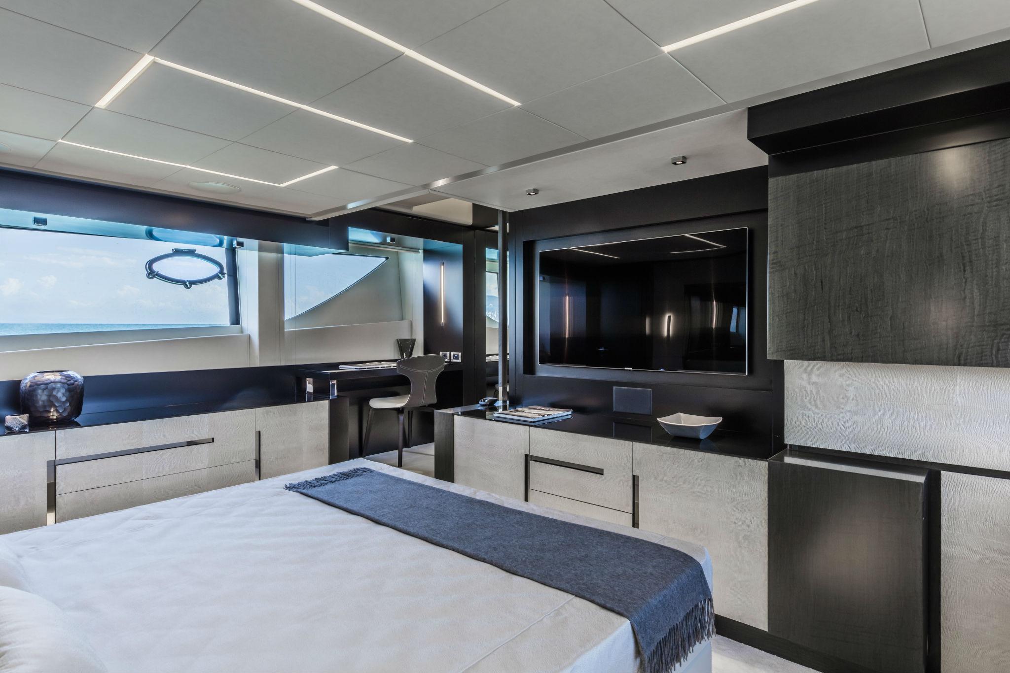 VIP CABIN: Access door in wood, Chrome door stops for interiors, Latch with thumb lock, Audio/video system, Recessed speaker (2), 32″ 60Hz LED TV, Mini Hi-Fi, TV/SAT decoder, Ceiling panels covered with vinyl and lacquered wood ceiling frame, Digitally controlled A/C system, Dimmer, Double bed with upholstered headboard edge and wardrobe underneath, Mattress, pillow and bedspread (2), Electric fabric roller blinds, Emergency exit to the main deck from circular hatch and retractable ladder, Hanging wardrobe with mirror door and internal shelves, Hinged hatch in plexiglass with external and internal handle, Wireless intercom system, LED ceiling lights, Light switches soft touch panel