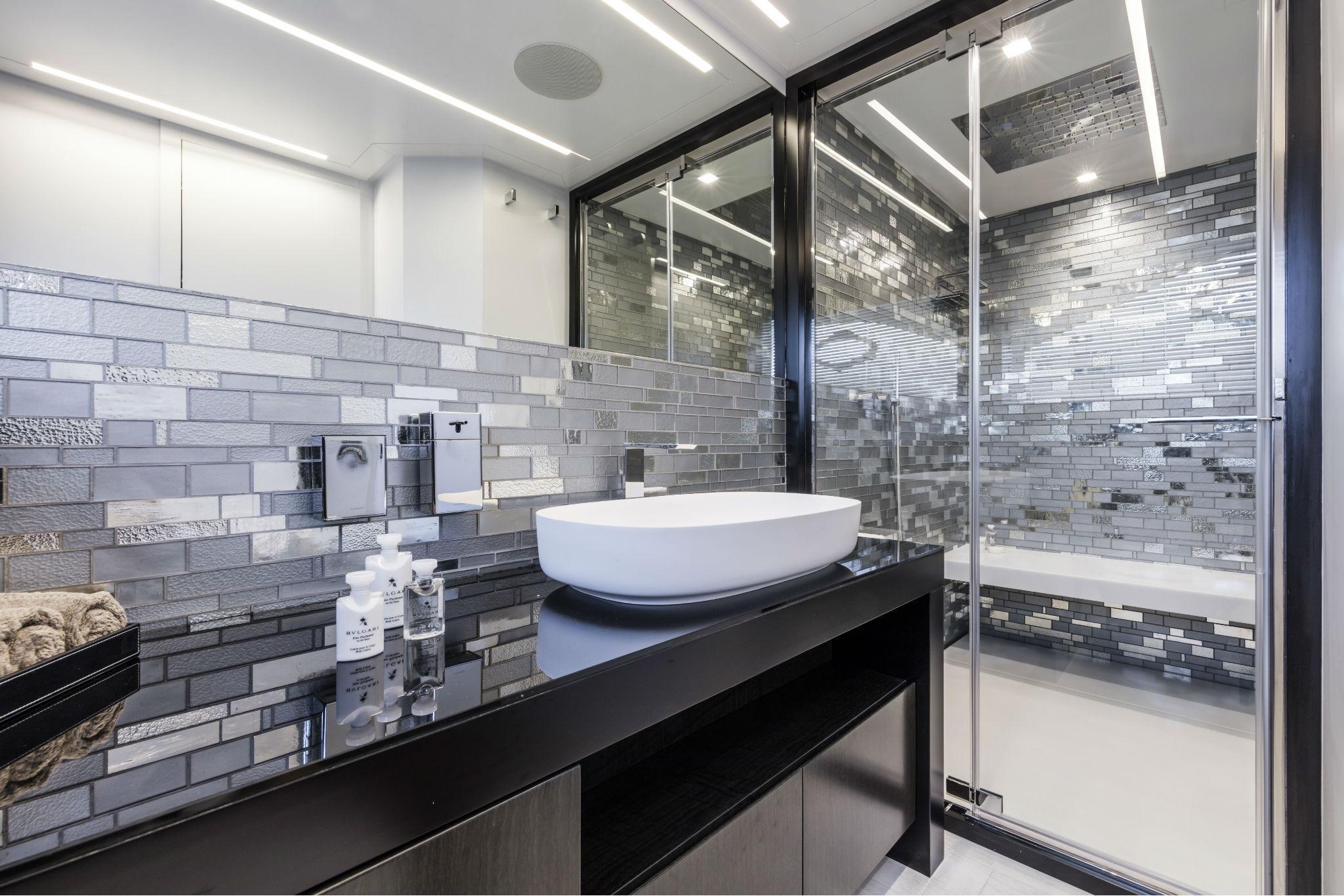 GUEST BATHROOM STARBOARD: A/C system outlet, access door in wood essence lacquered inside, chrome door stops for interiors, door handle with thumb lock, clothes hook (2), compartment for curtains in white laminate, electric toilet in porcelain, hanging wardrobe with mirror door and internal shelves, LED ceiling lights, light switches soft touch panel, opening stainless steel porthole with mechanical hook, shower cabin with tempered glass door, internal shower walls covered with mosaic, shower floor in mosaic, shower head and shower telephone, soap dish, structural GRP floor covered with parquet, toilet brush holder, toilet roll holder, toothbrush holder, towel rail (2), walls covered with laminated panels, mosaic and lacquered curtain frame, washbasin unit in wood essence with glass top and internal cabinet, washbasin tap, washbasin in porcelain, White lacquered ceiling.