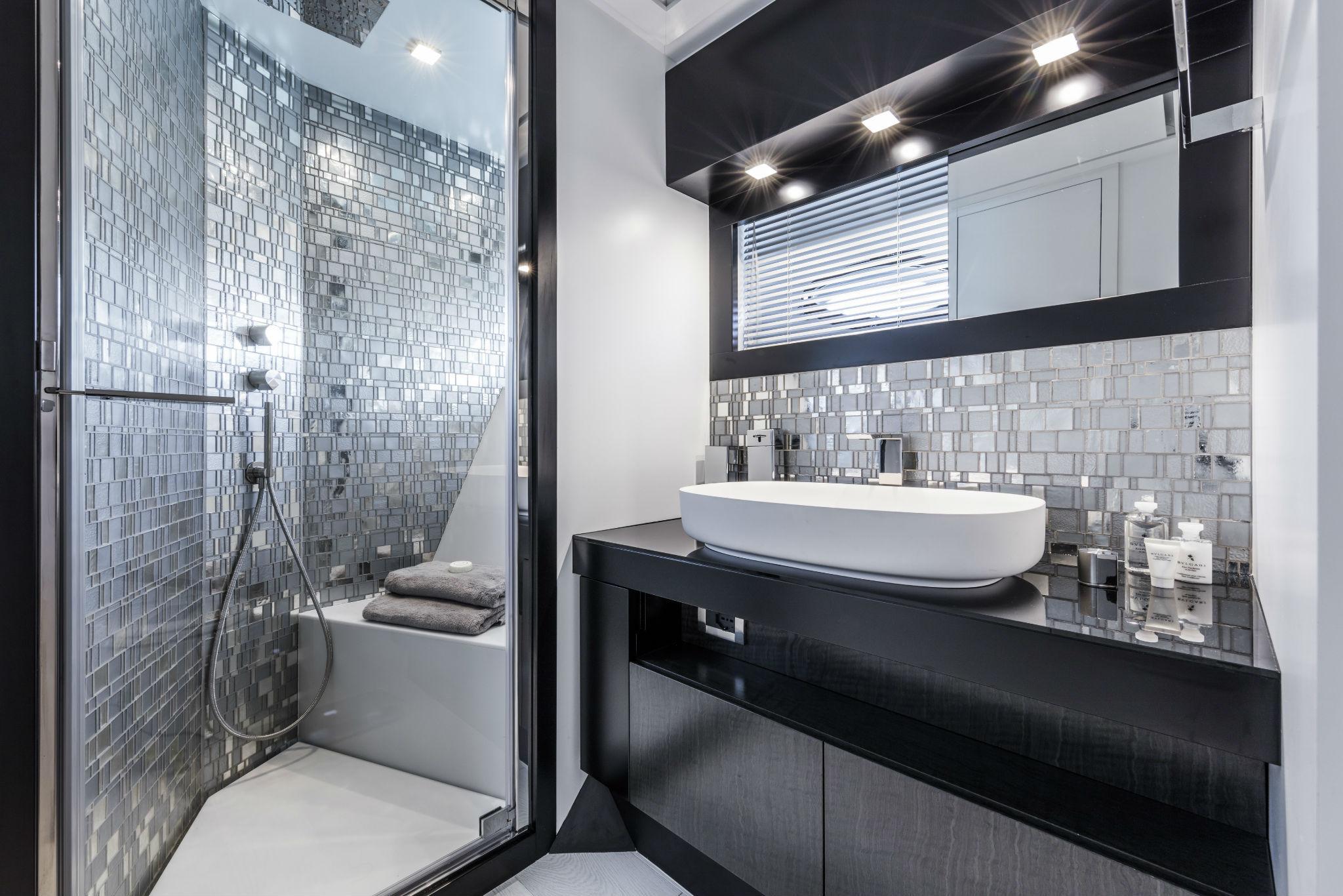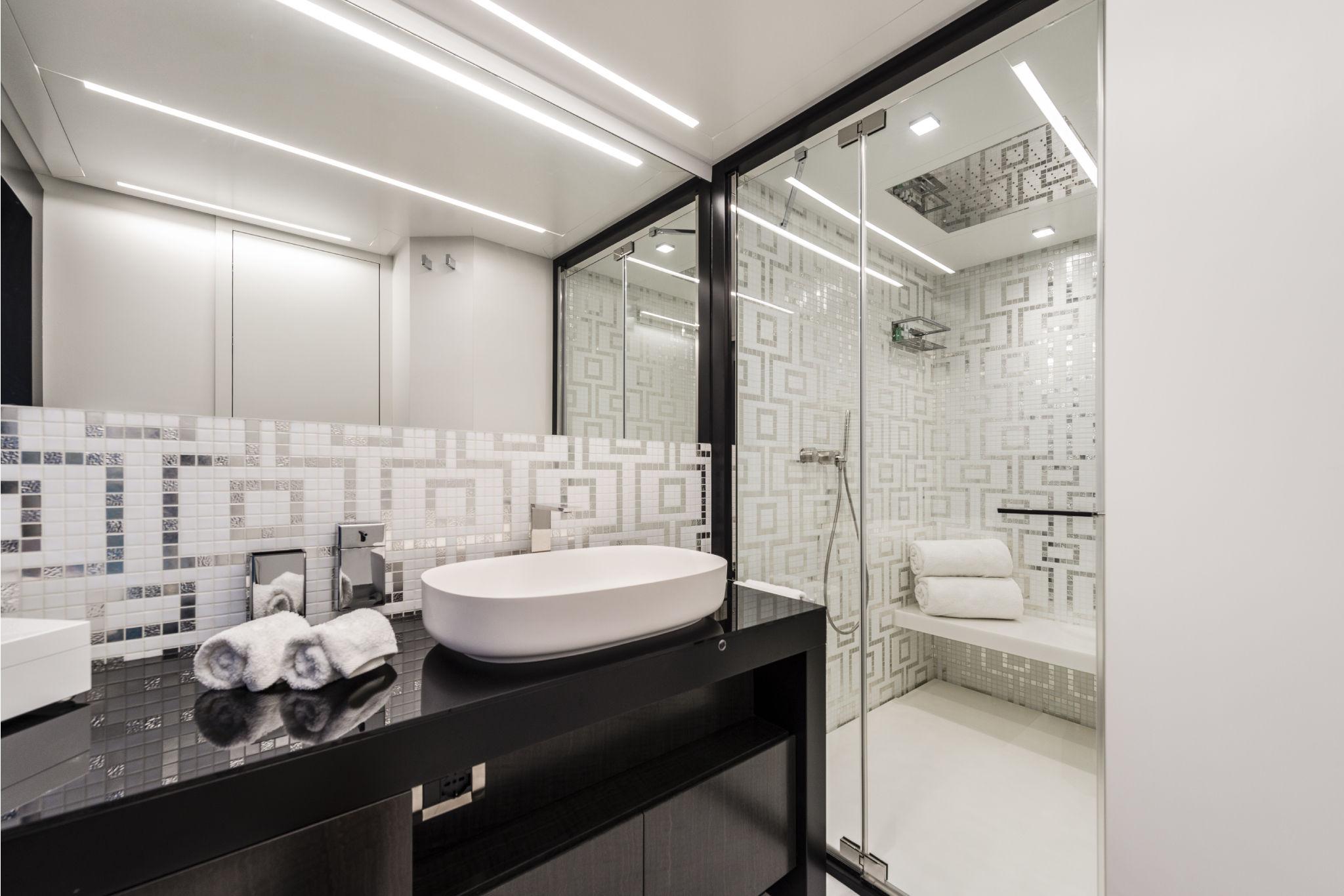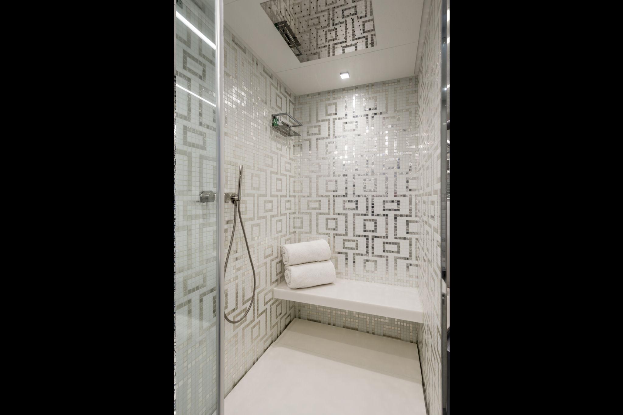 CAPTAIN’S BATHROOM: Recessed spotlights in the ceiling, Clothes hook, Lacquered door, Door handle with thumb lock, Electric toilet in porcelain, Teak-covered floor with grating, GRP sink, Hanging cabinet in laminated wood with opening doors, Lacquered ceiling, Soft-touch panel light switches, Manual aluminum Venetian blind, Mirror, Shower cabin with tempered glass door, Internal shower walls covered with mosaic, Mosaic shower floor and seat, Shower head and shower telephone, Toilet brush holder, Toilet roll holder, Towel rail, Walls covered with laminate, Washbasin furniture in white lacquered wood with doors and shelf.