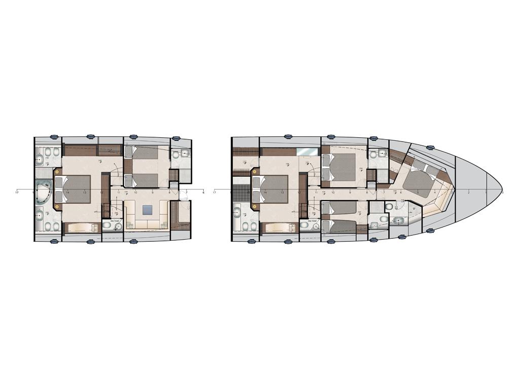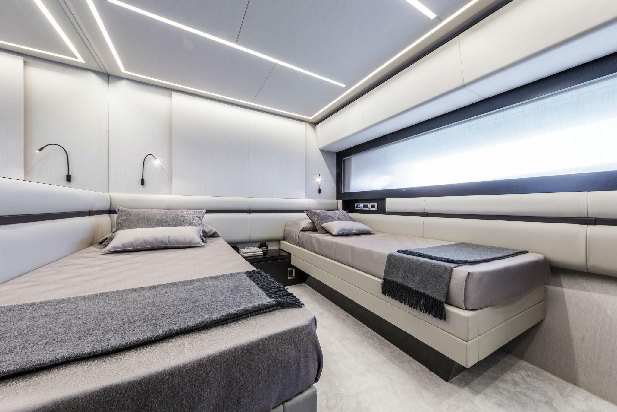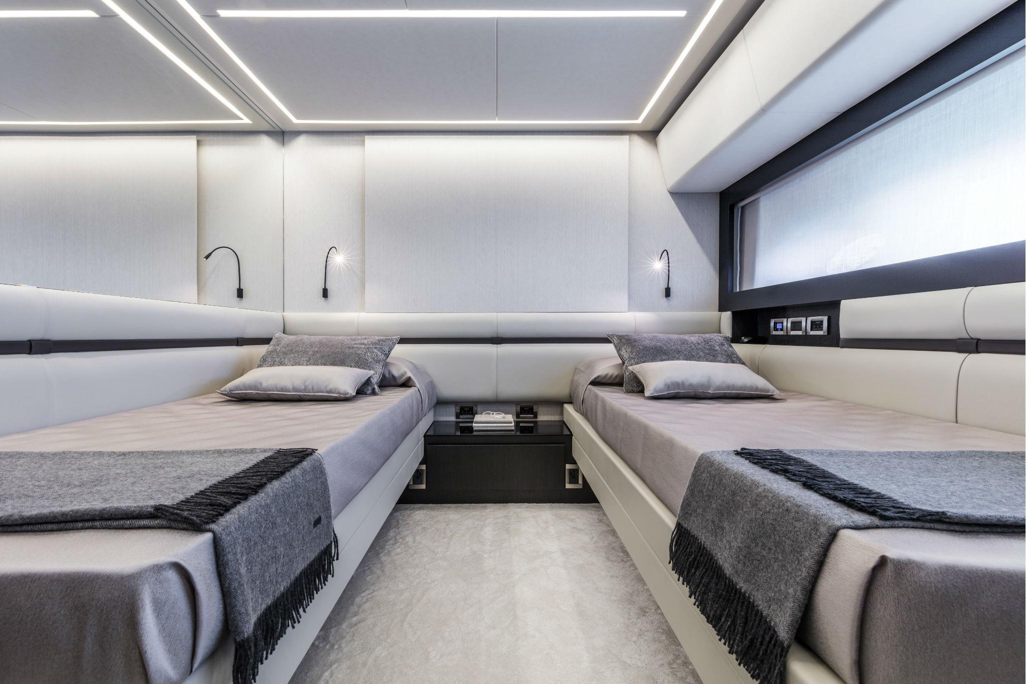 Electric blackout roller blinds, Wireless intercom system, LED ceiling lights, Light switches on soft touch panel, Mirror on the starboard bulkhead, Two bedside tables, Opening stainless steel porthole with mechanical hook, Two reading lights, Two sliding single beds with leather upholstered headboard edge, Including mattress, pillow and bedspread, Structural GRP floor covered with carpet, Walls in wood essence and wallpaper, Wardrobe in wood, paneled inside, with clothes rail and internal light Glass window on the port side.