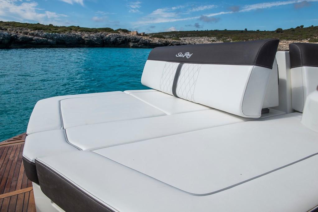 Bow seating in V with filler cushions and backrest for walk-thru to cockpit. Bucket seat for pilot and a lounger with adjustable Backrest for companion. L-shaped starboard seating with backrest and filler cushions for walk-thru. Portside access to swim platform. Spacious aft solarium with convertible backrest and swim platform with concealed ladder.