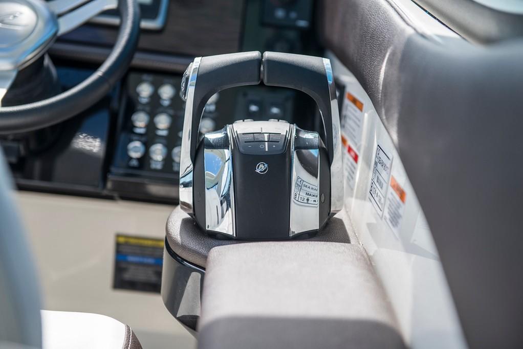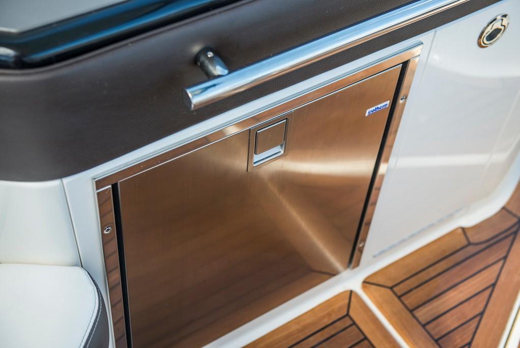 Bow rider with starboard cabin. On deck, 3 sunbeds in the bow and bow passage to the cabin. Double seat for pilot and co-pilot. Cabin table with U-shaped seating and starboard countertop. Sundeck in the rear with rotating backrest, facing backwards or towards the stern. Swimming platform with a hydraulic and submersible step. In the cabin, V-shaped seating in the bow with table, convertible into a double berth. Full bathroom compartment on starboard. Two single berths in the middle of the boat