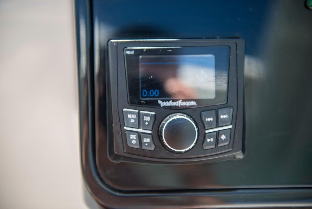 Additional features include a Sunbrella bimini top, an extended swim platform, and a 12V Clarion AM/FM/CD player with Sirius satellite radio.