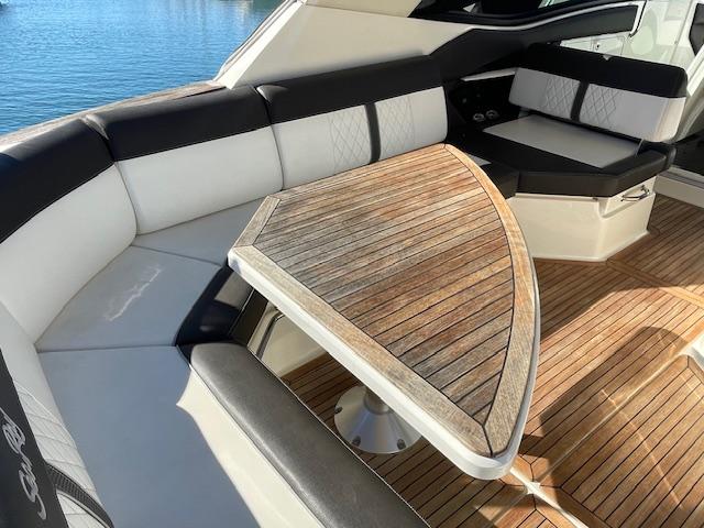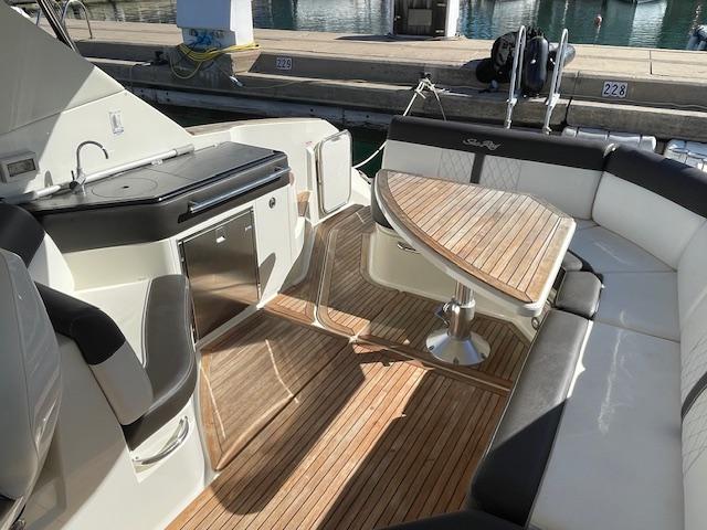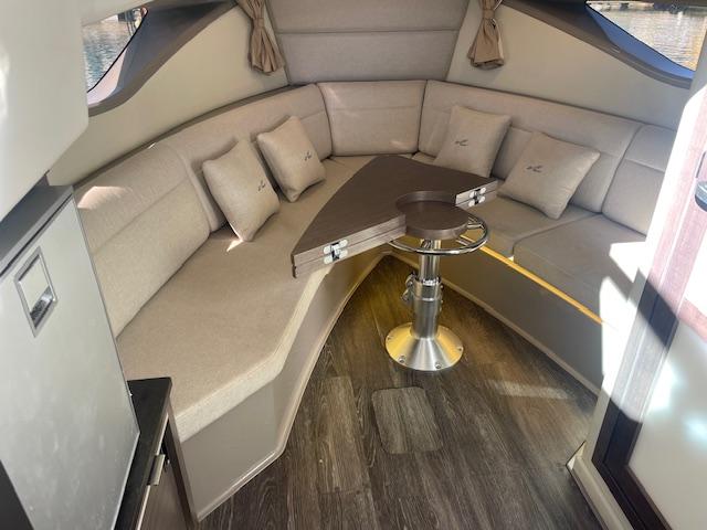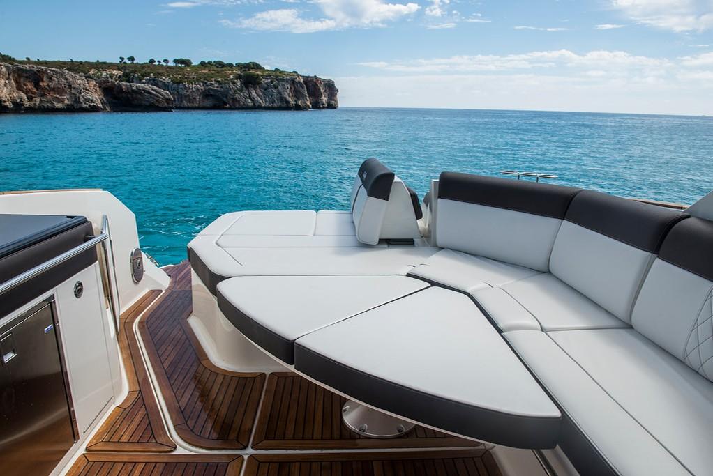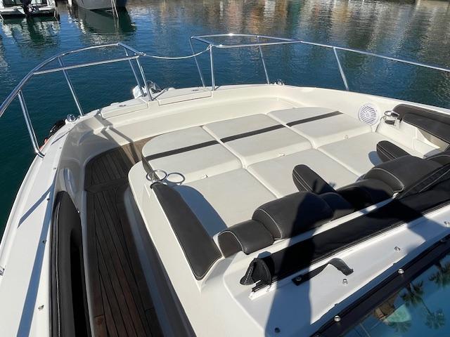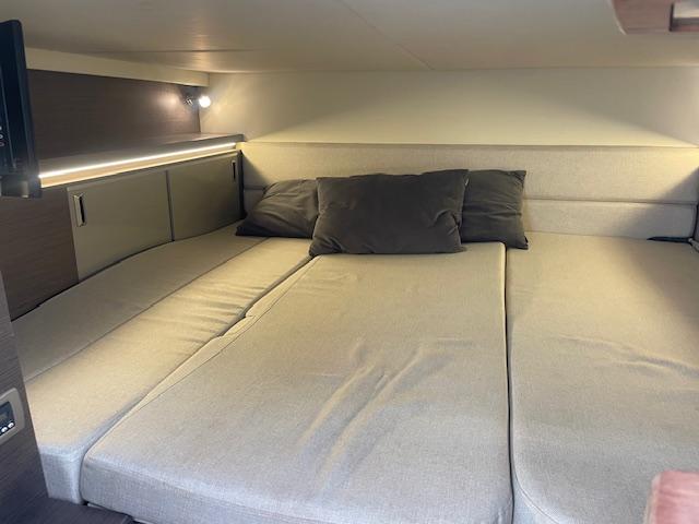 Open bow with starboard cabin. On deck, 3 sunbeds in the bow and port walkway to the cockpit. Double seat for pilot and co-pilot. Cockpit table with U-shaped seat and starboard countertop. Aft sundeck with rotating backrest, facing aft or facing starboard. Bathing platform with submersible hydraulic step. In the cabin, V-seat in the bow convertible into a double bed. Complete bathroom compartment on starboard. In the central part of the boat, two single beds. Swim platform and cockpit with teak flooring.