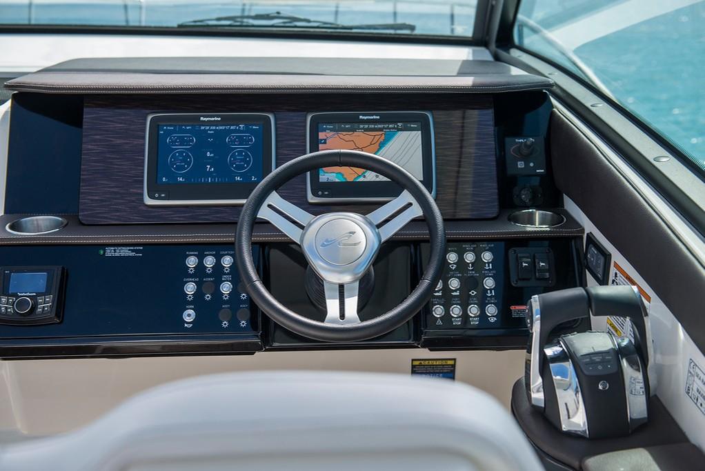 In addition, the 1017 GT offers optional features such as a high-end audio system, underwater lighting, and custom color options for the hull and deck. Its standard features emphasize luxury and functionality with components such as a bow thruster, an electric windlass, and LED lighting throughout the boat.