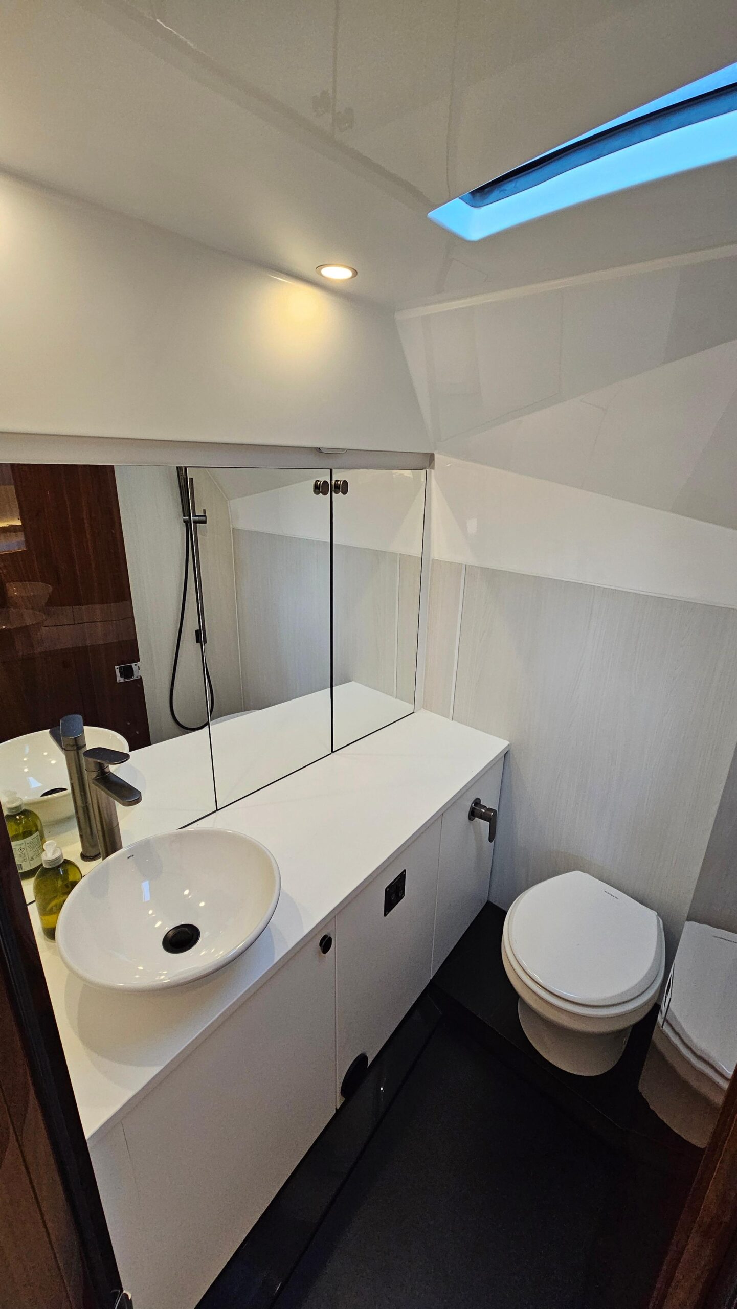2 separate double cabins with a full head including shower and sink. Full galley. Air conditioning