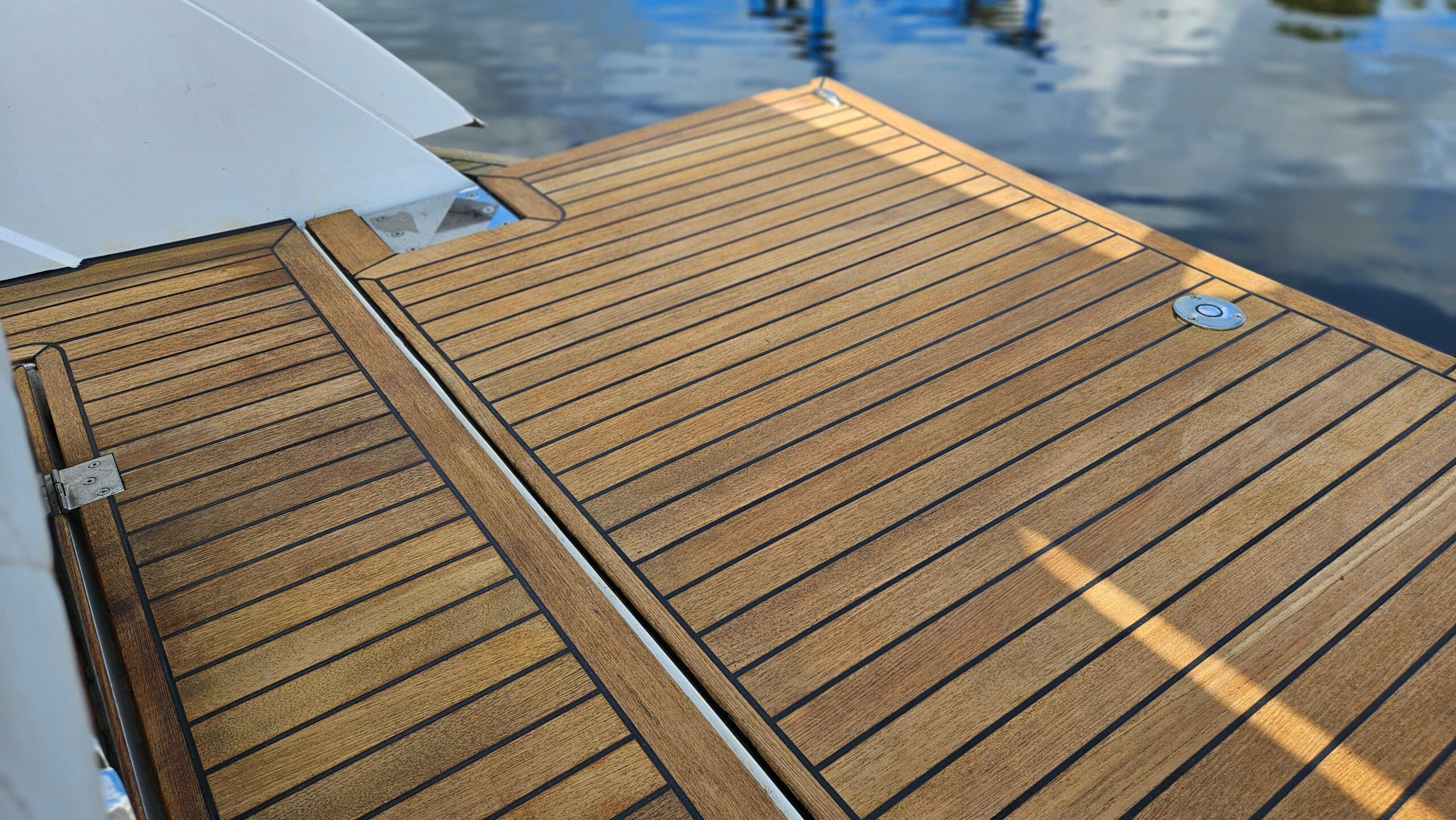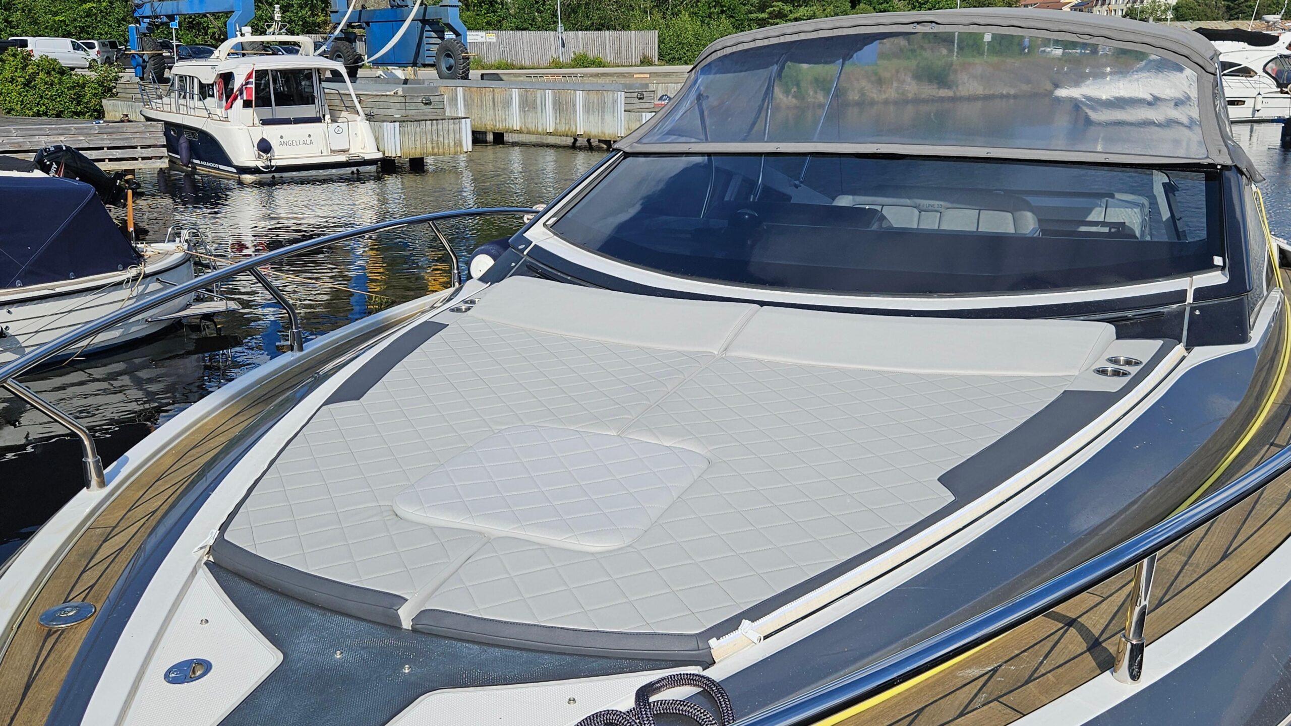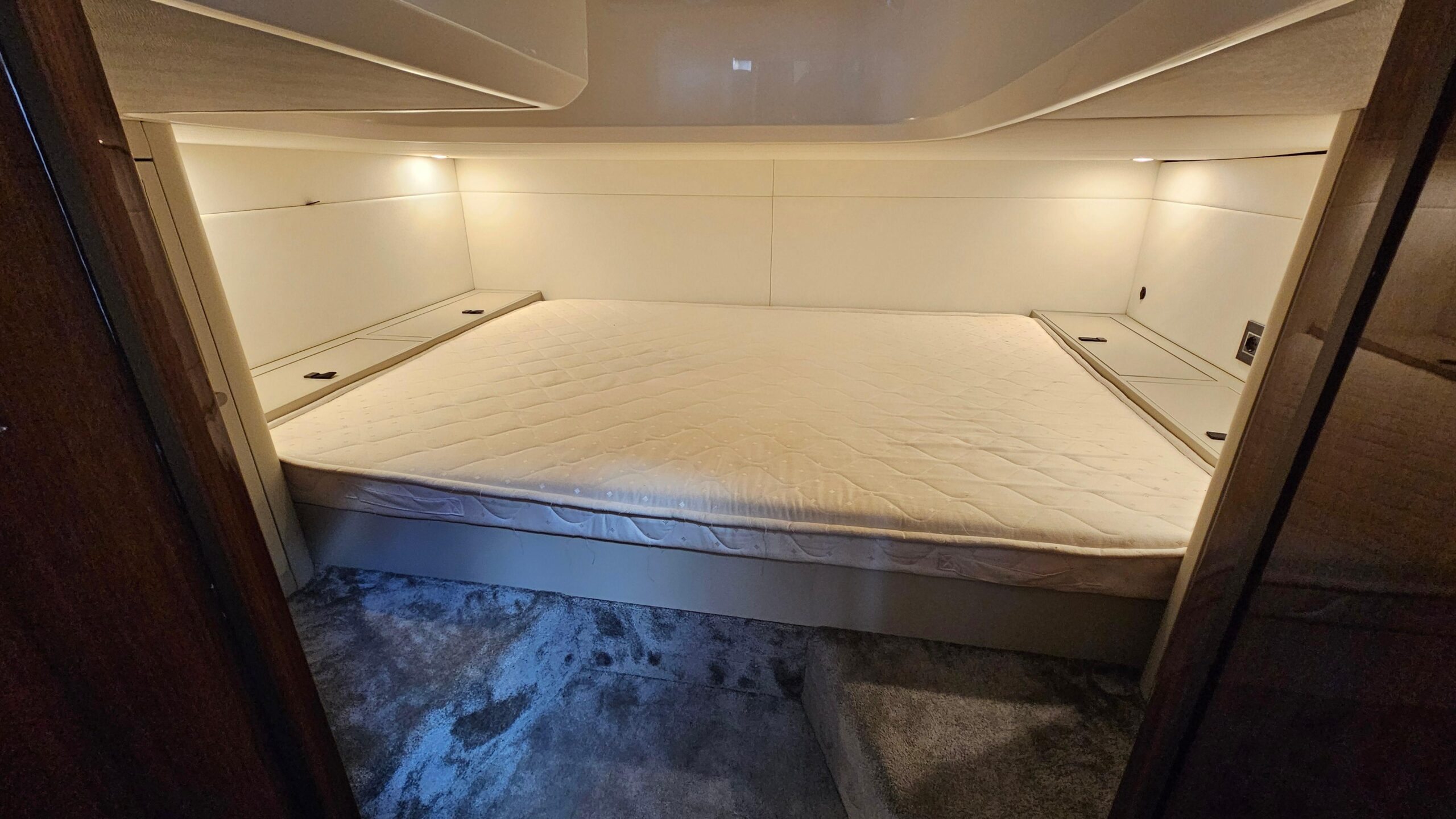 Open bow with two sunbeds in the bow and filler cushions. Head compartment to port. Swivel seat for driver and passenger. L-shaped bench seat in the stern with folding backrest convertible into a sun deck. Wet bar on starboard with sink, tap and compartment underneath. Extended swim platform with ladder. Tower for water sports. >German flag. Requires full engine and outdrive service due to years of inactivity. Original exhaust manifolds, we recommend complete replacement of elbows and manifolds.
