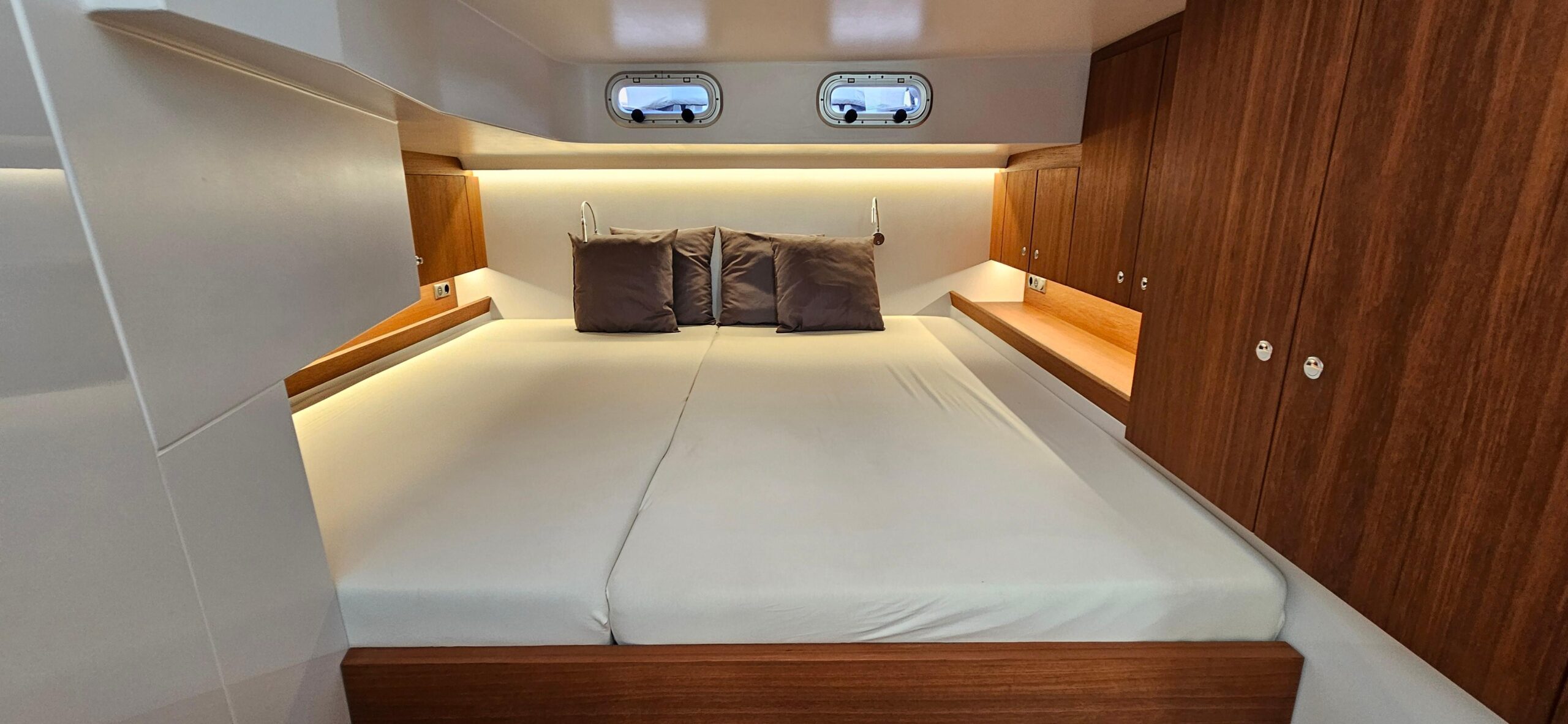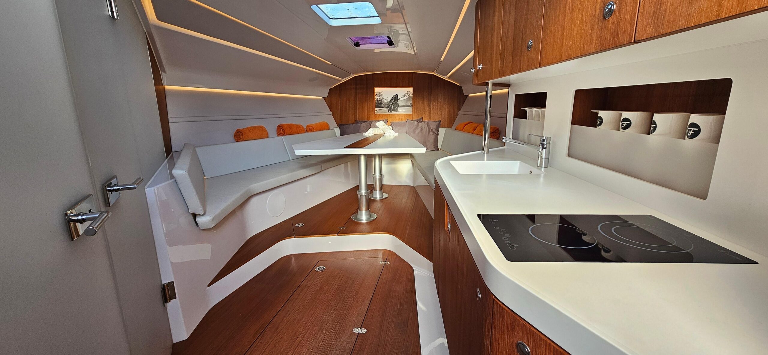 The open plan configuration makes the cabin area extra spacious. It comfortably accommodates 4 people in two spacious double cabins and has a spacious bathroom. It is equipped with a large refrigerator and a sofa in the living room, a powerful hot/cold air conditioning and an upgrade to the sound system.