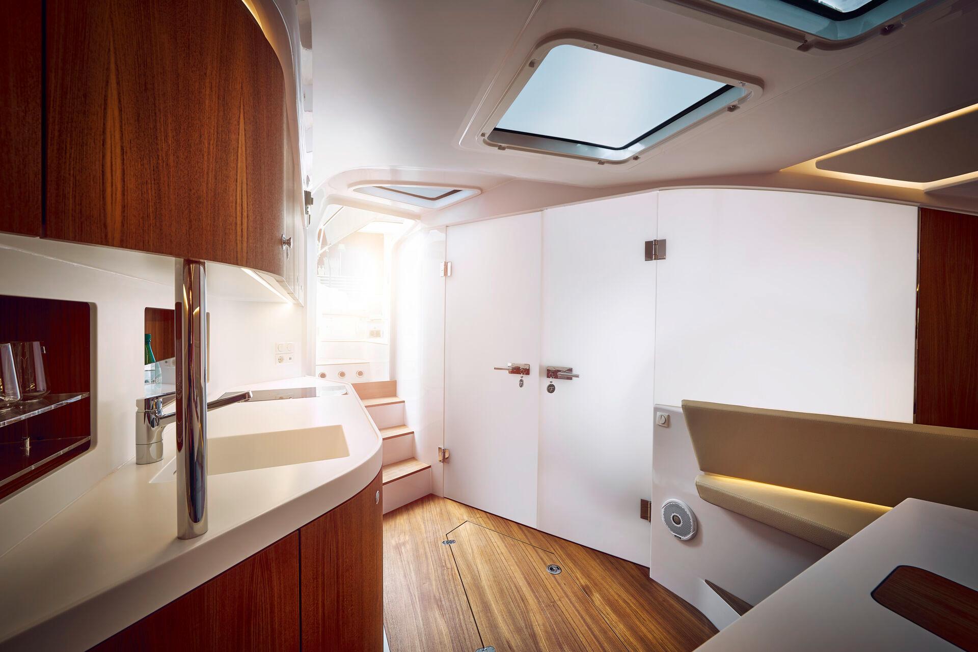 The cockpit design is spacious and versatile, allowing different configurations that can be easily changed from a dining setup to sunbeds, forward-facing seats to rear-facing seats. The wet bar is fully equipped with sink, electric grill, refrigerator, storage and ample space for food and beverage preparation. The additional and large sun deck gives you excellent shade over the entire aft seating area when anchored or in port.