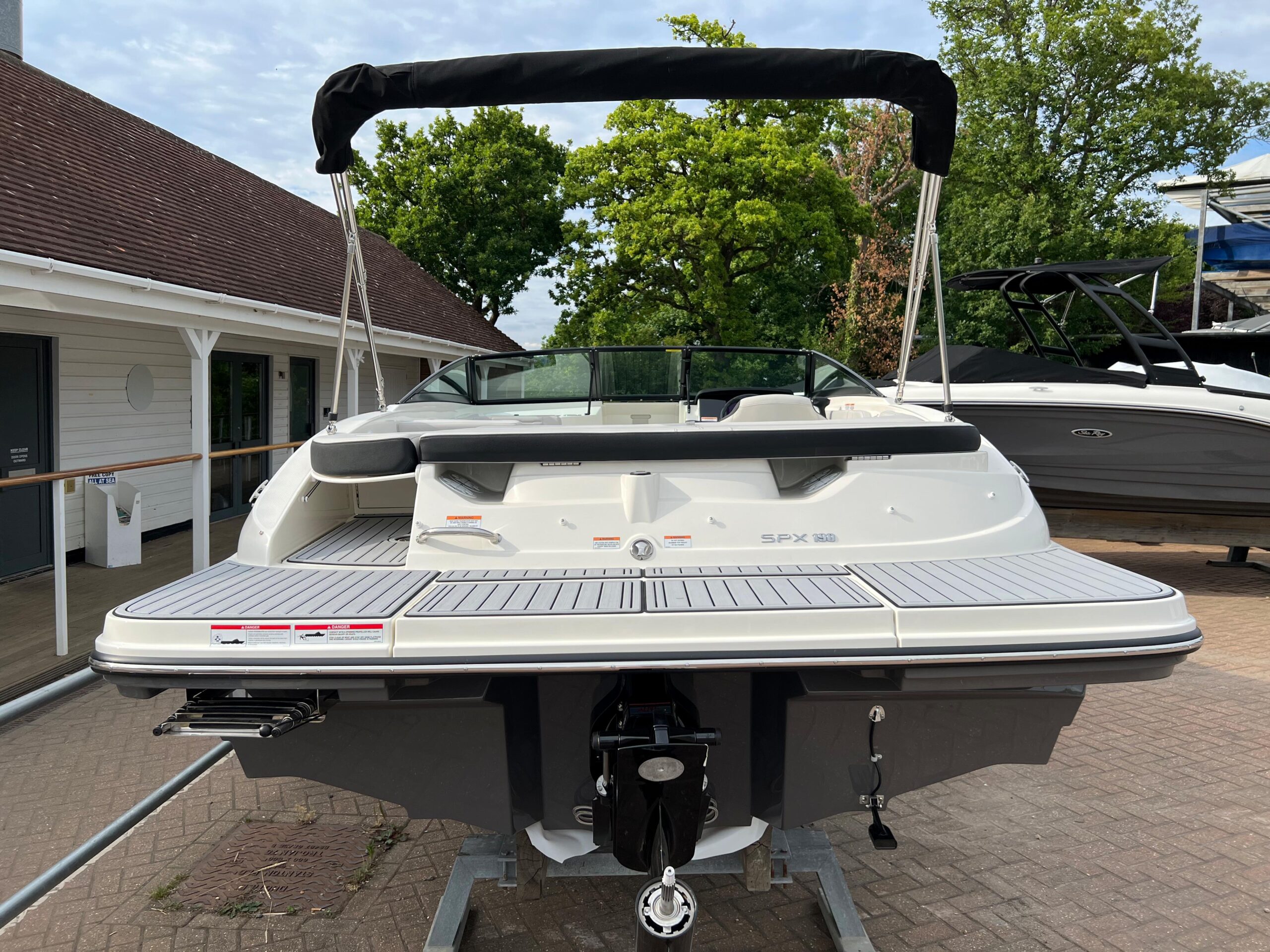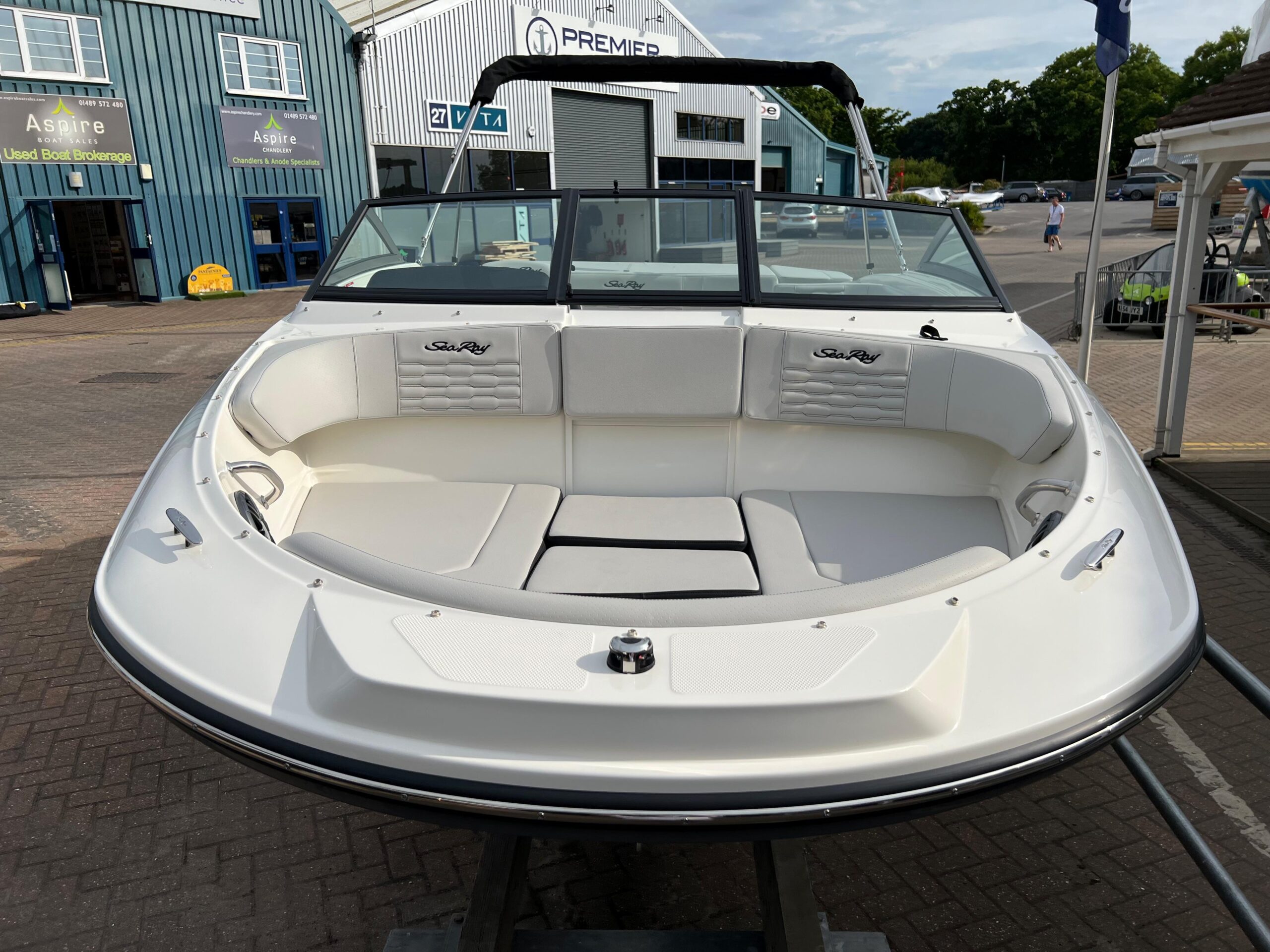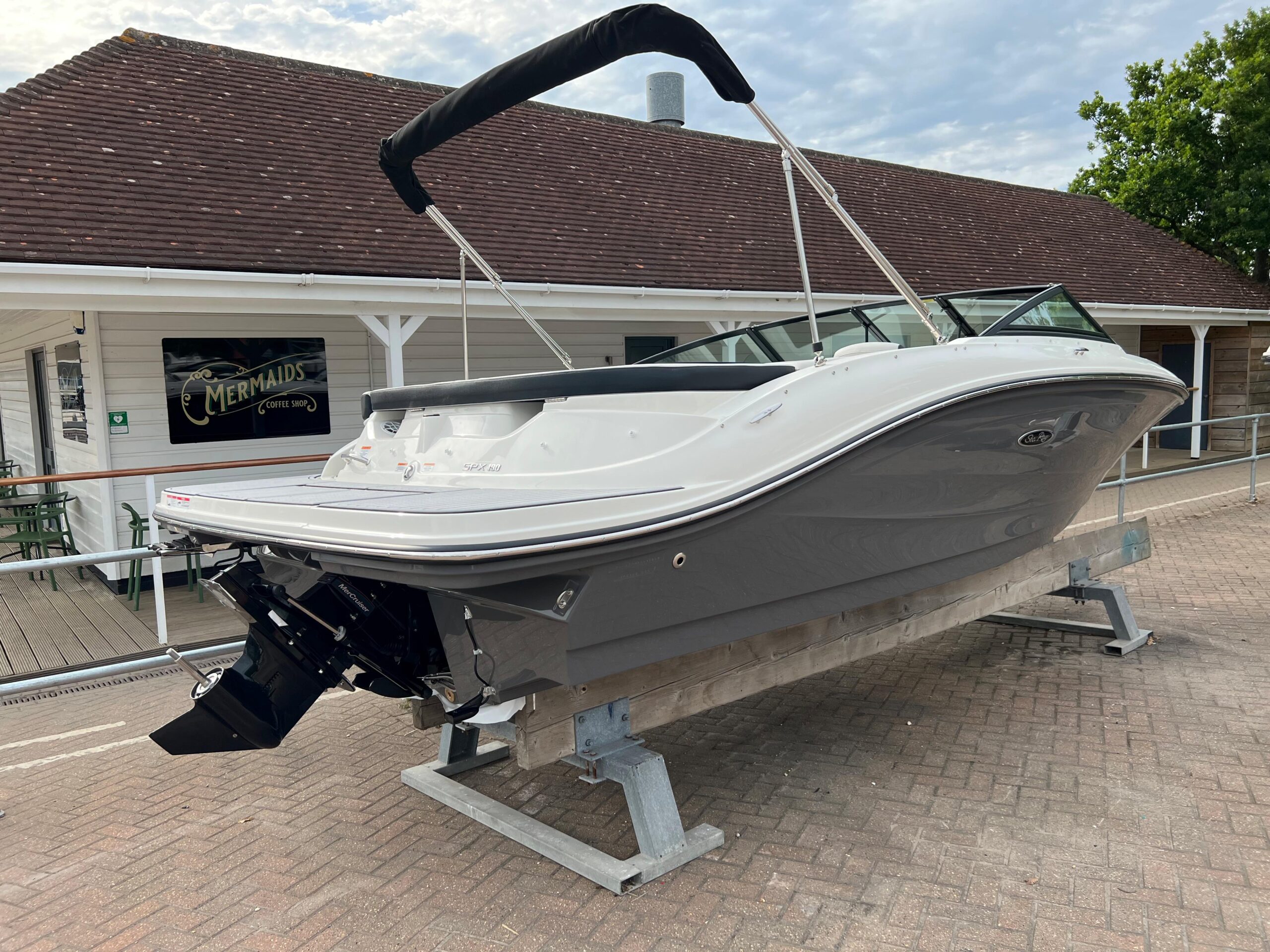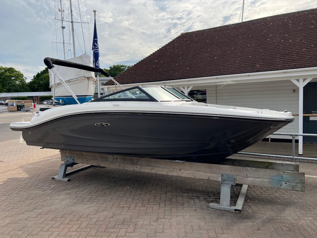 Sea Ray SPX 190 (2022) fitted with a single 4.5L MPI (200hp). She has the stunning steel grey hull, stone grey interior with SeaDek on the cockpit floor and bathing platform. She has a large spacious cockpit, seating in bow and cockpit for 10 and a teak table. An ideal tow boat getting you on the water now. Specification includes: Bimini top, cockpit cover & Tonneau cover, Mooring cover, 9″ Digital Dash, Air compressor, Fenders and Lines.