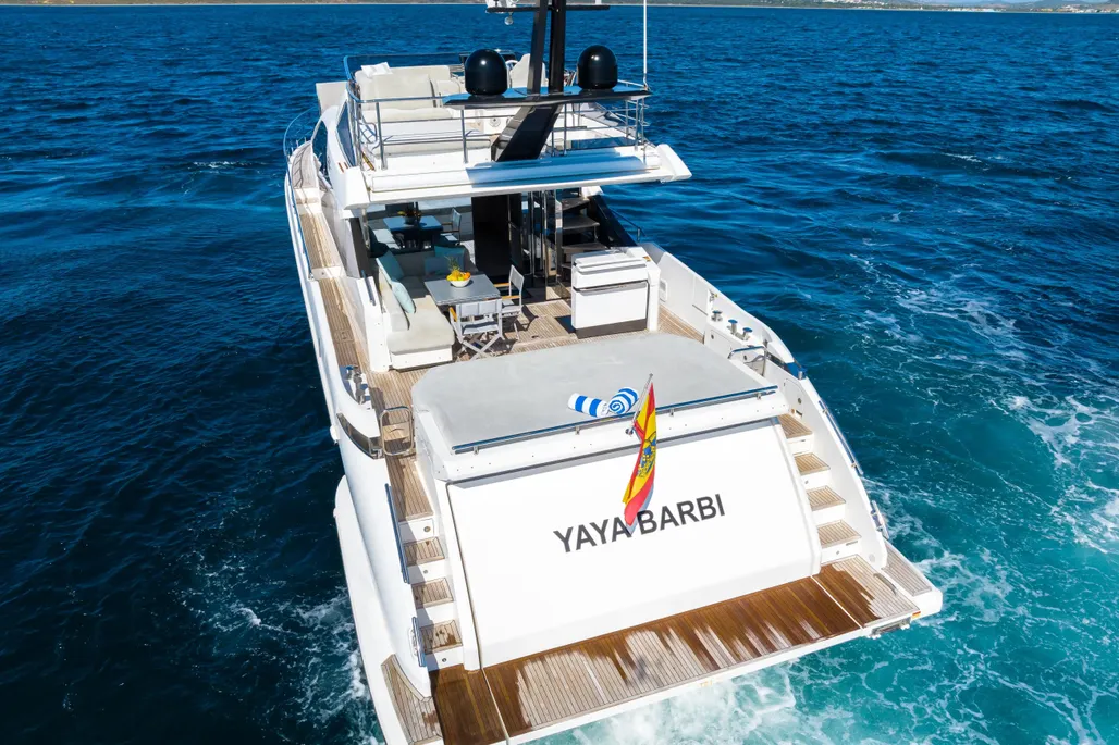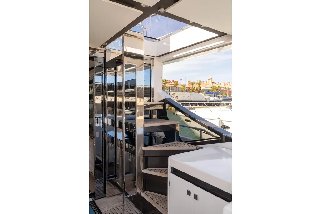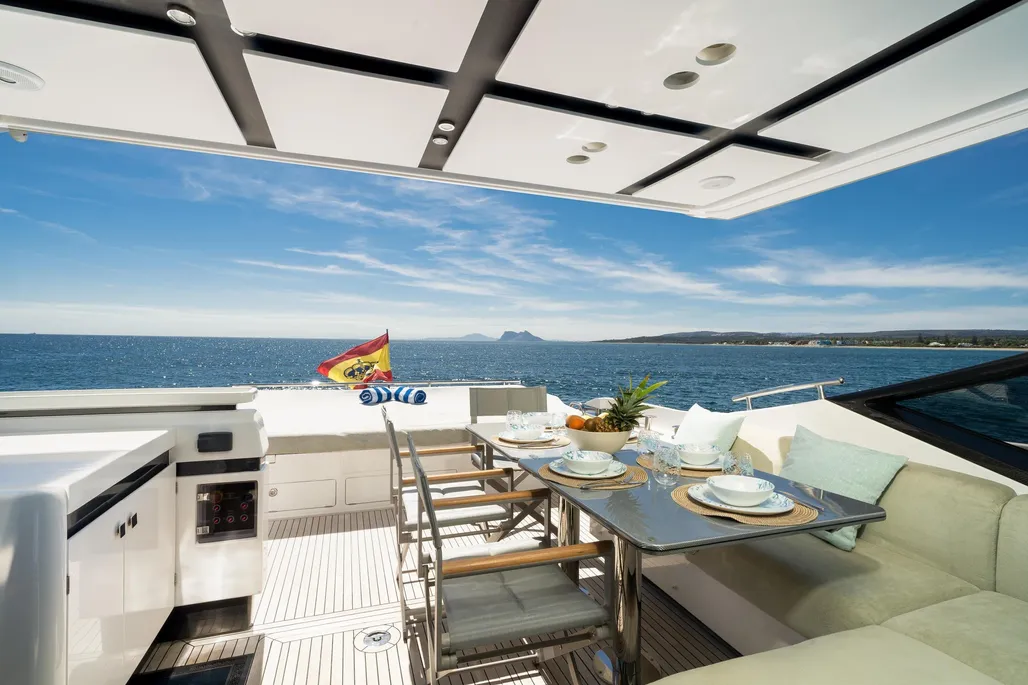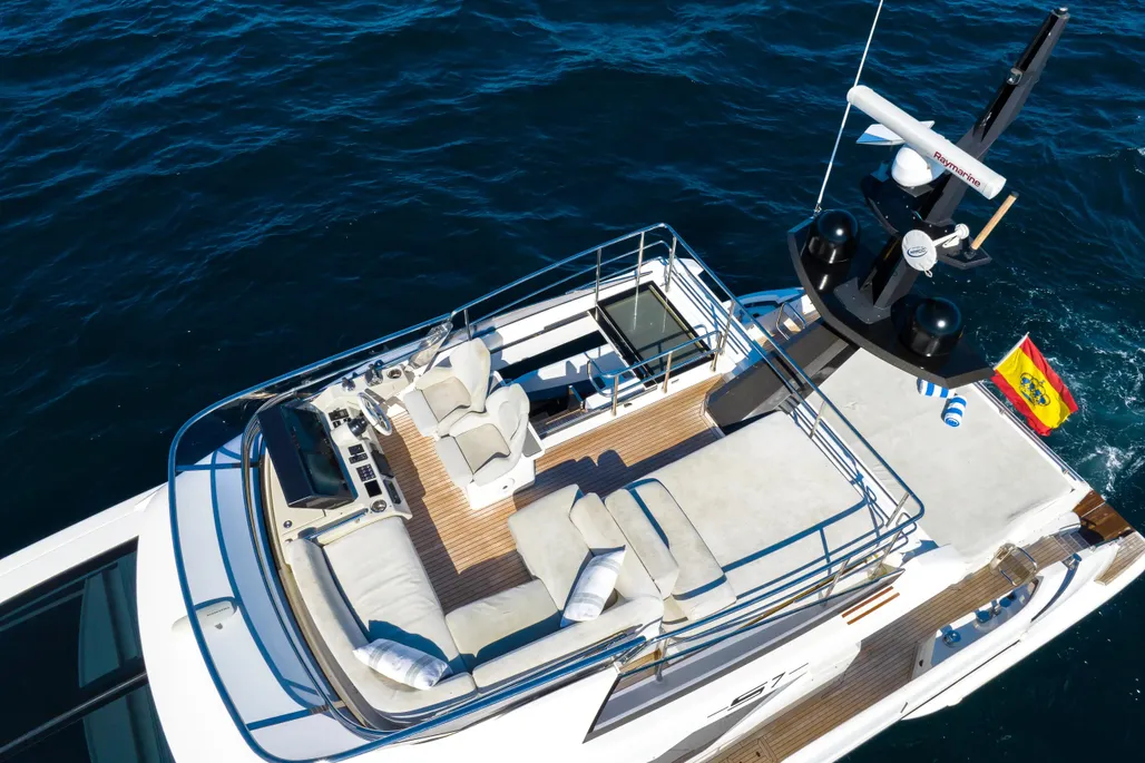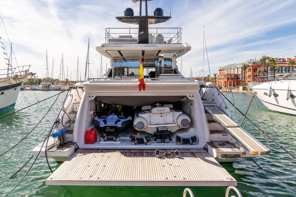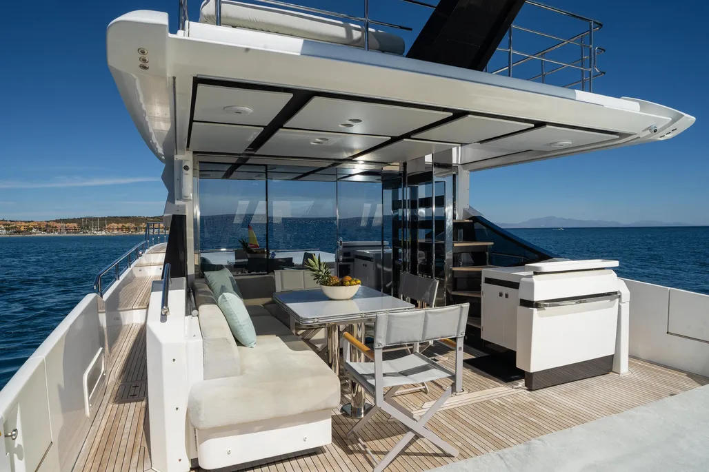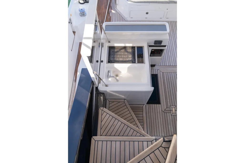 Teak cockpit, Teak side decks, Cockpit shower, Hydraulic gangway, Cushions on aft seats, Cockpit table, Swimming ladder, Hydraulic swim ladder, Stabilizers, Gyro stabilizer, Hydraulic bathing platform