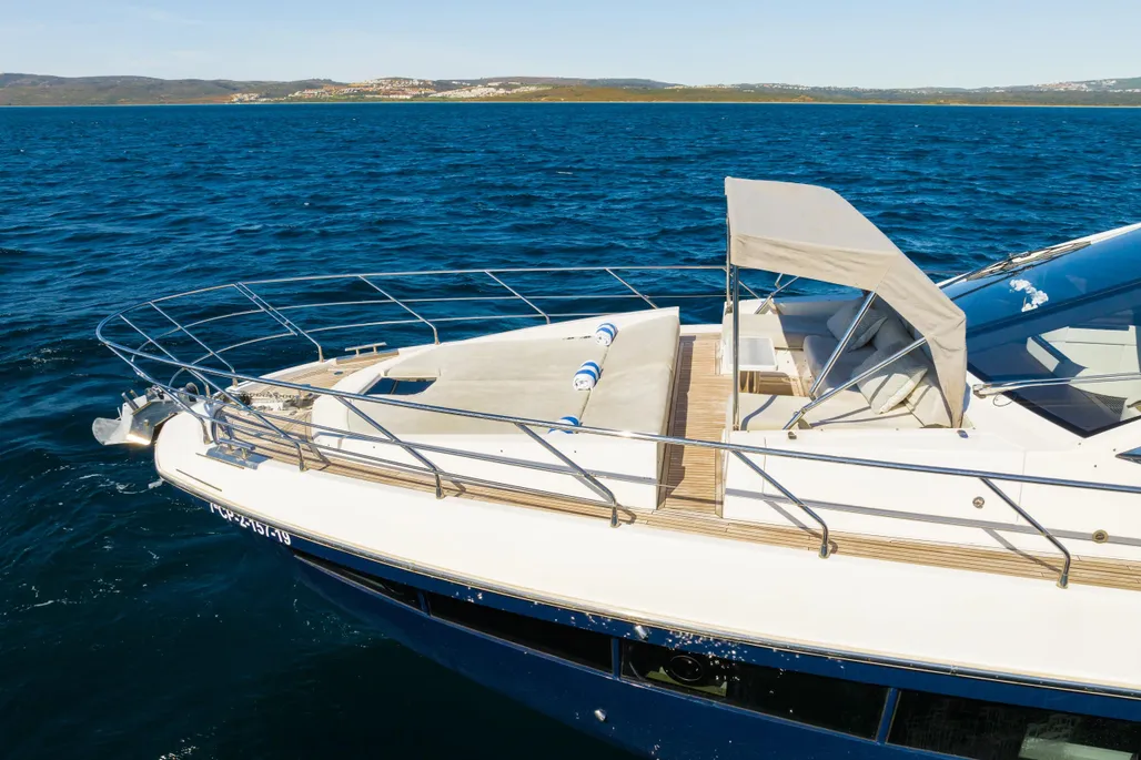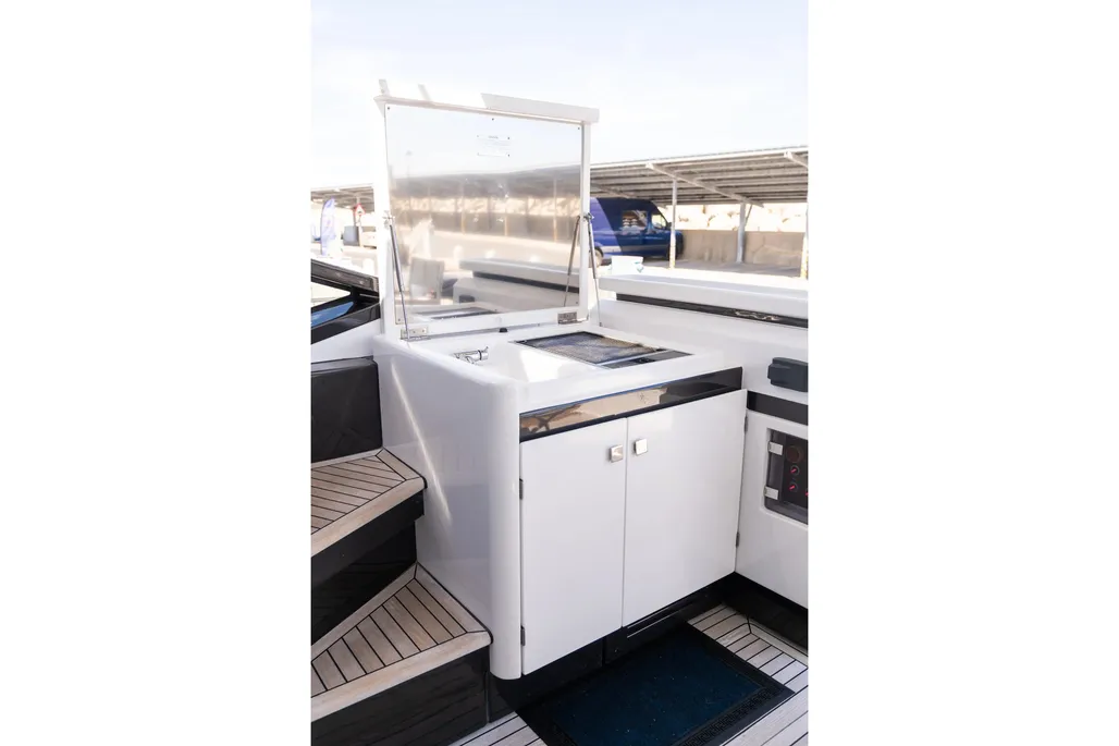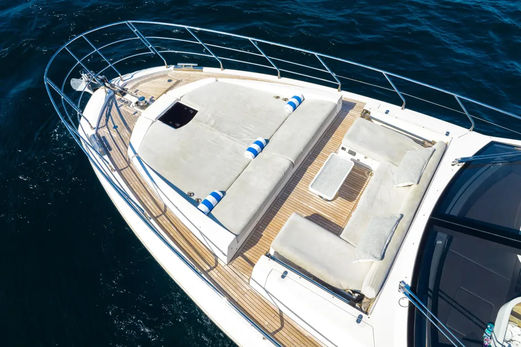 Open bow with U-shaped sun lounger-style seating and swivel seat for the driver on the starboard side. Passenger seat on the port side with filler cushion and reversible backrest. Aft bench and cockpit walkway to the platform. Aft sundeck and extended swim platform with hidden swim ladder.